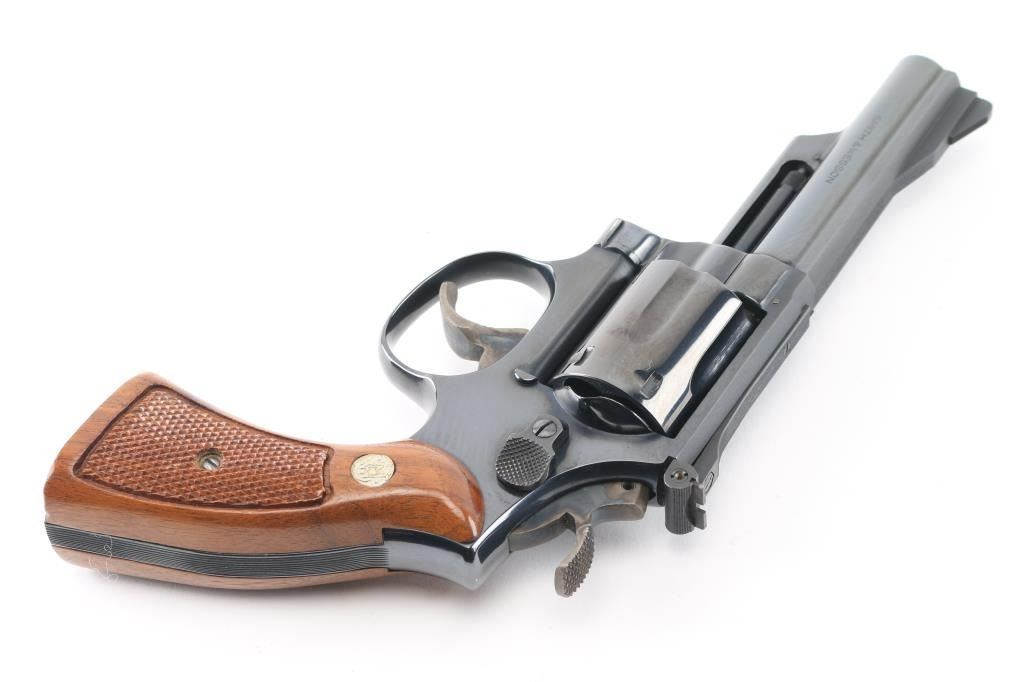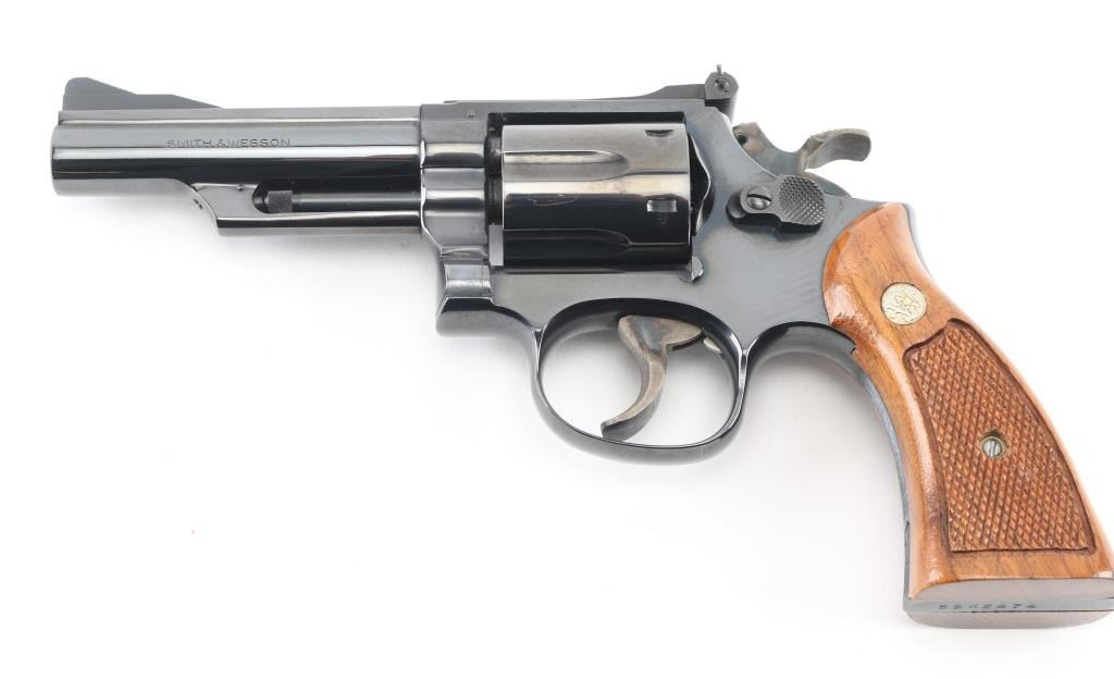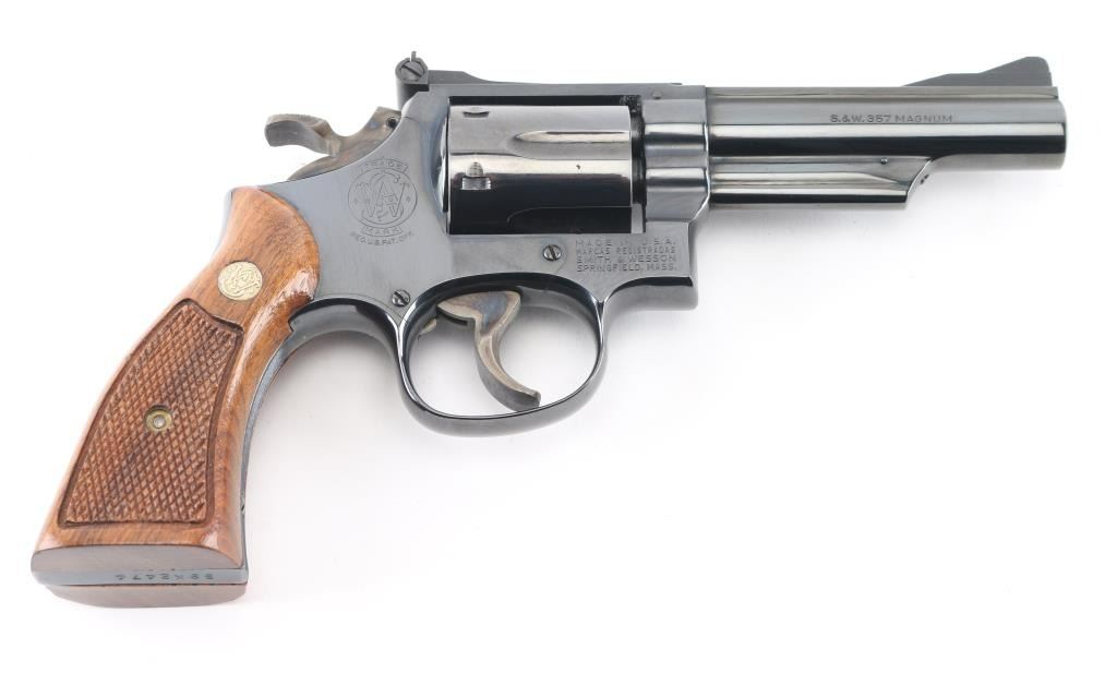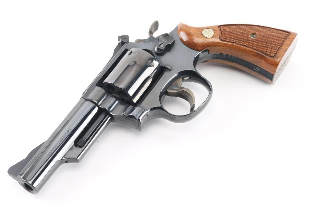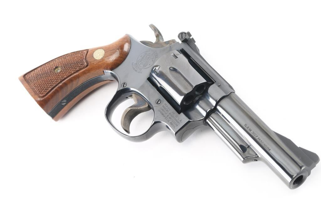 'Combat Magnum' Medium frame double-action revolver chambered in .357 Magnum. Features a bright blued finish, 4" pinned barrel with serrated top rib, shrouded ejector rod, ramped front sight, adjustable micrometer click rear sight, fluted six-shot cylinder, serrated trigger, knurled semi-target hammer and S&W medallion two-piece checkered walnut target grips. Bore looks very good but needs cleaned. Metal finish looks very good with faint drag line on cylinder. Some contours & edges show slight erosion from polishing, color of bluing looks like factory, possibly carefully reblued, possibly heavily polished at factory. Wood grips look great. Condition is NRA Very Good+ (possible reblue) *Modern Firearm*