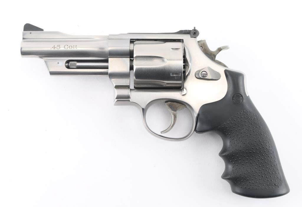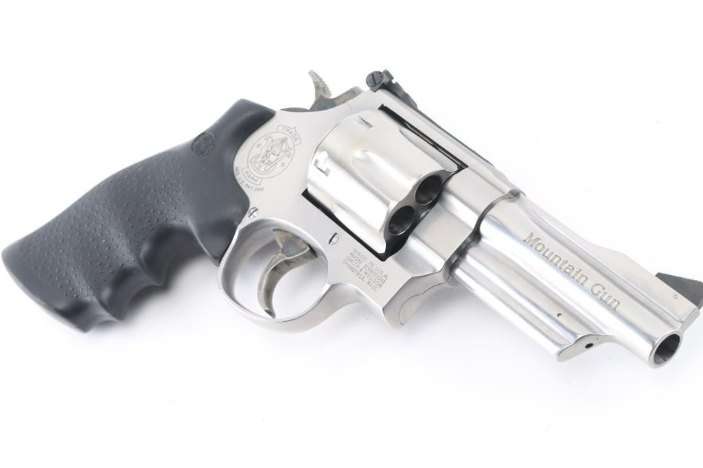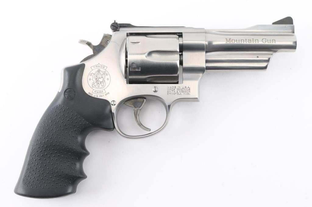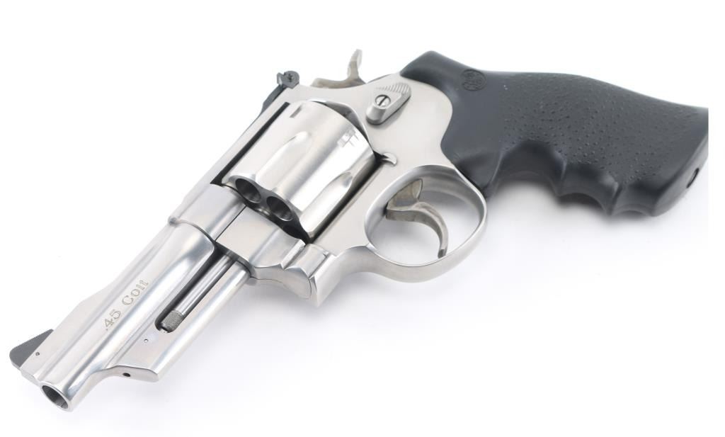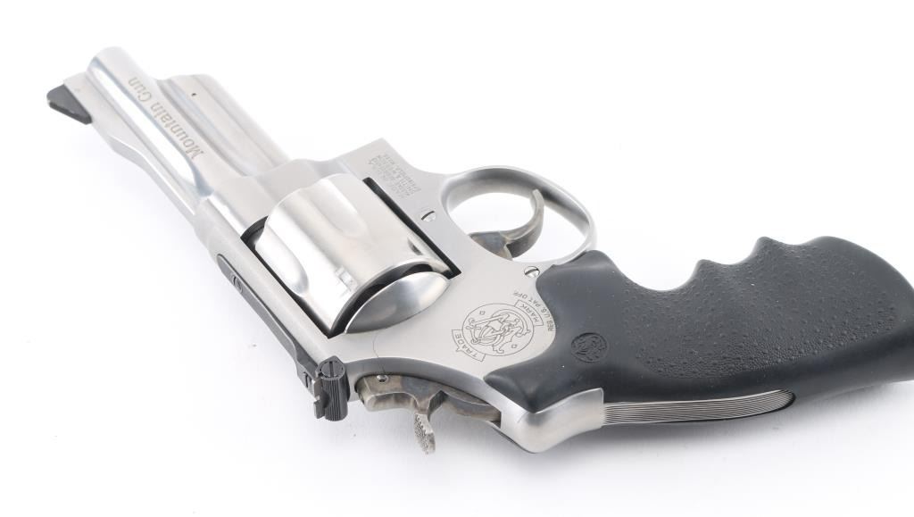 'Mountain Gun' Large frame stainless steel double-action revolver chambered in .45 Colt. Features a brushed finish, 4" barrel with serrated sighting rib, raised serrated ramp front sight, adjustable micrometer click rear sight, fluted six-shot cylinder, smooth trigger, knurled hammer spur, hammer mounted firing pin, three screw round butt N target frame with serrated back strap, and one-piece pebbled black rubber wrap-around finger groove grip. Bore looks very good, a little dusty. Metal finish looks very good with a barely visible drag line on the cylinder. Condition is NRA Excellent *Modern Firearm*