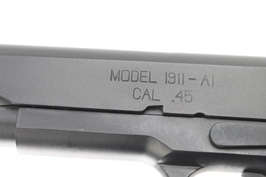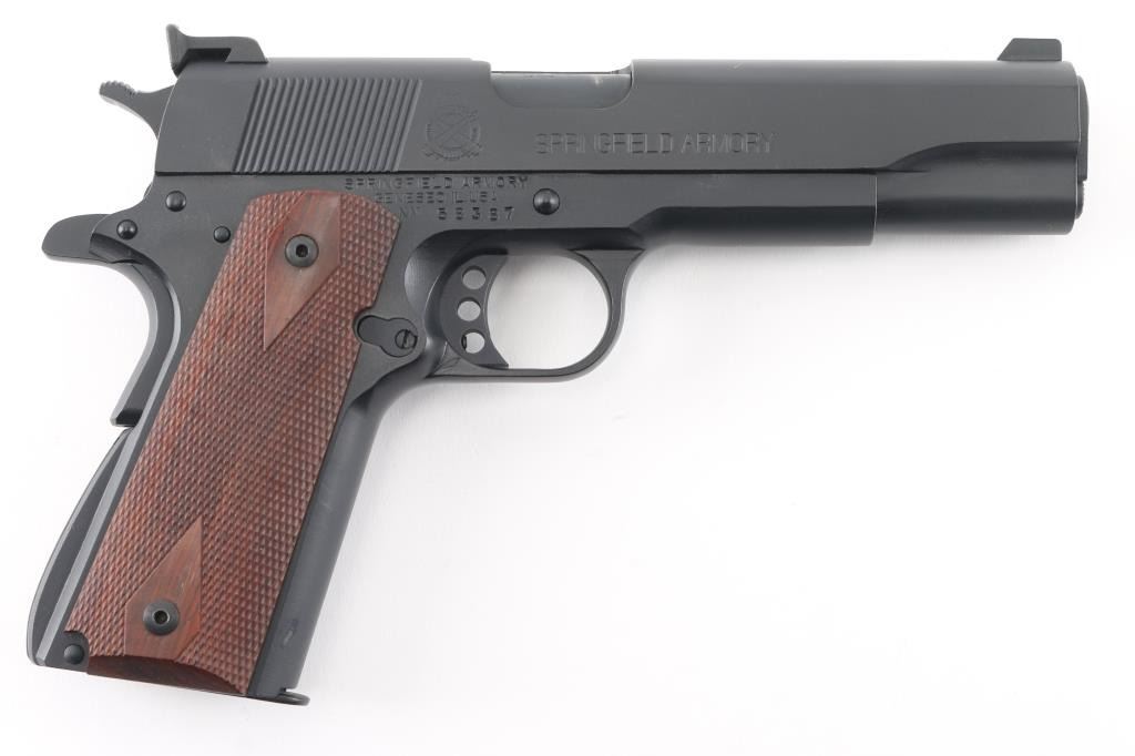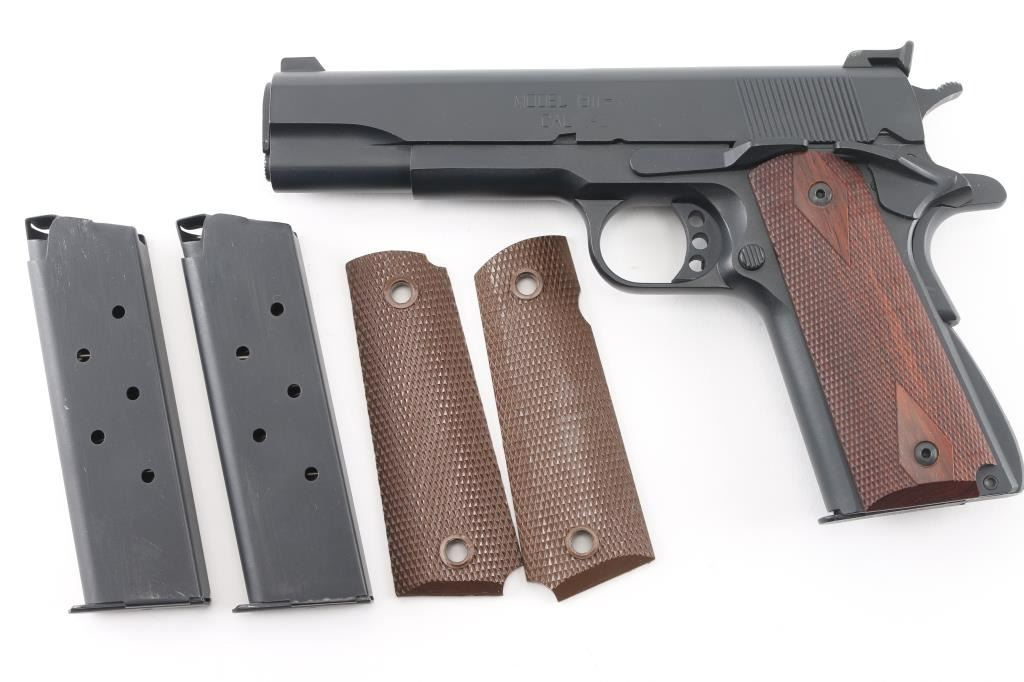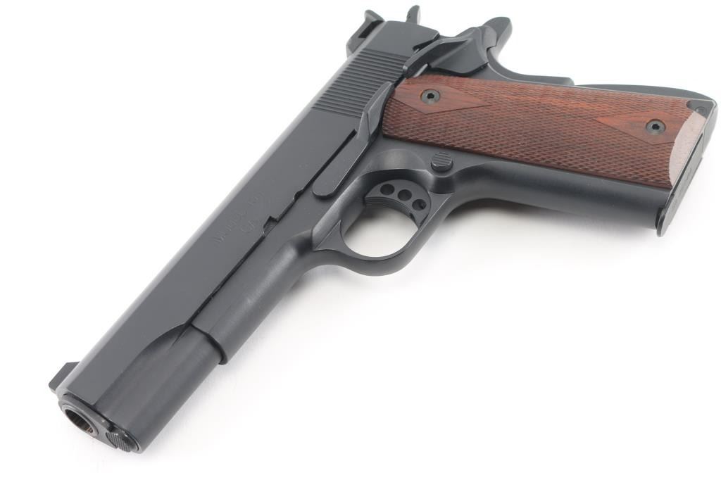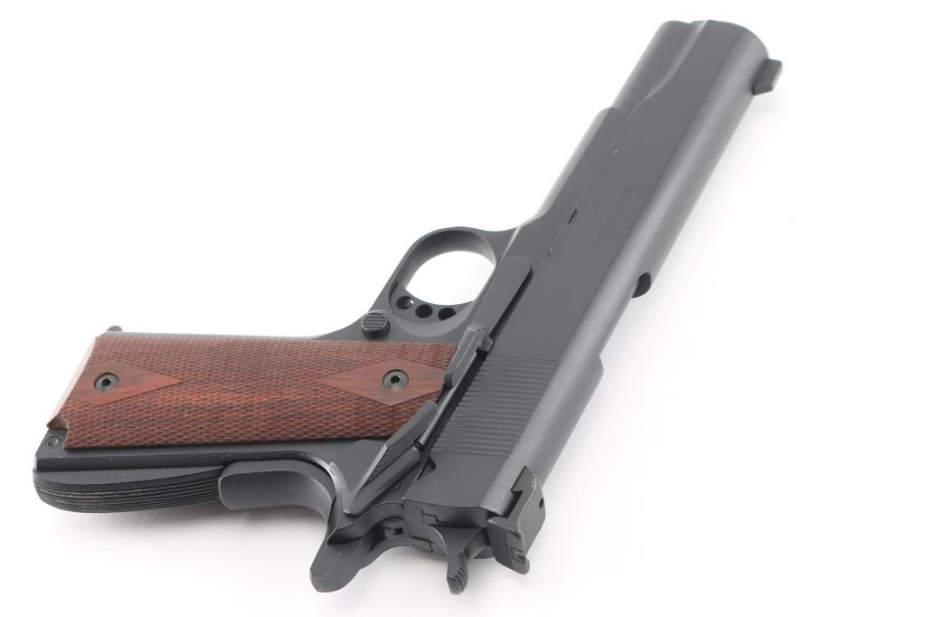 1911 style semiautomatic pistol. Features matte black finish, double diamond checkered walnut grips, 5" barrel, fixed wide ramp front sight, dovetail mounted rear window sight, extended manual safety & slide stop, skeletonized trigger with adjustable overtravel stop, serrated arched mainspring housing. Bore is very good condition. Overall condition is like new with few handling marks. Includes the original factory cardboard box, (3) magazines, spare set of USGI checkered brown plastic grips. Condition is NRA Excellent *** Modern Firearm ***