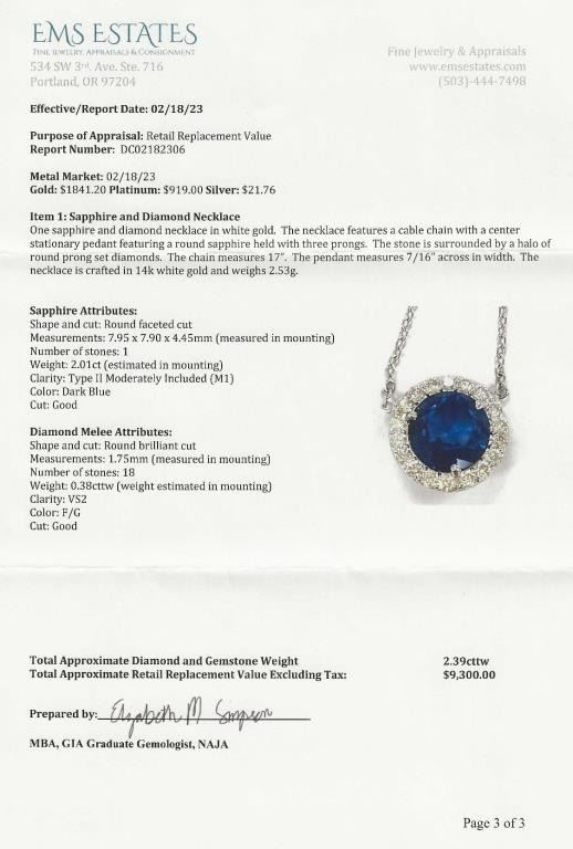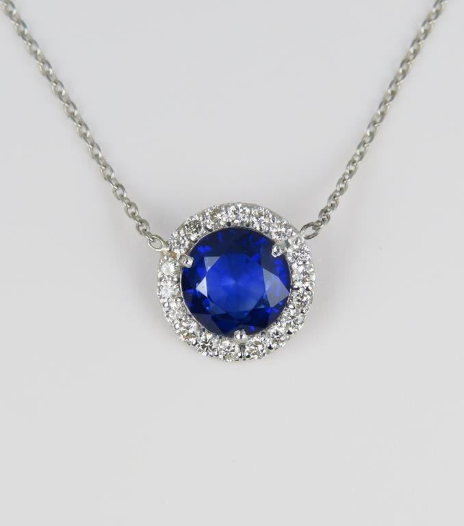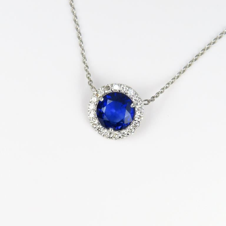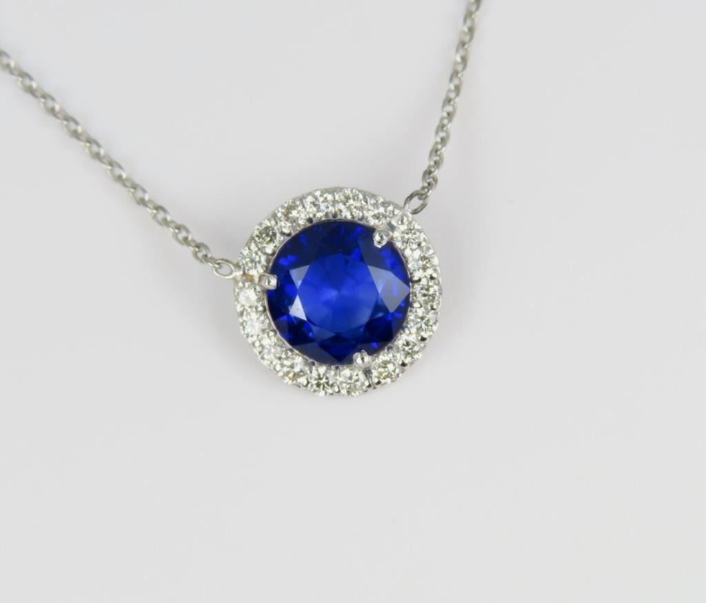 Sapphire and Diamond Pendant featuring a Royal Blue round Sapphire weighing approx. 2.01 carats encircled with 18 round ‘IDEAL’ cut Diamonds weighing approx. 0.38 carats with F-G colors and VS clarity set in a 14 karat white gold halo style setting. Full Retail Appraisal - $9,300.00
