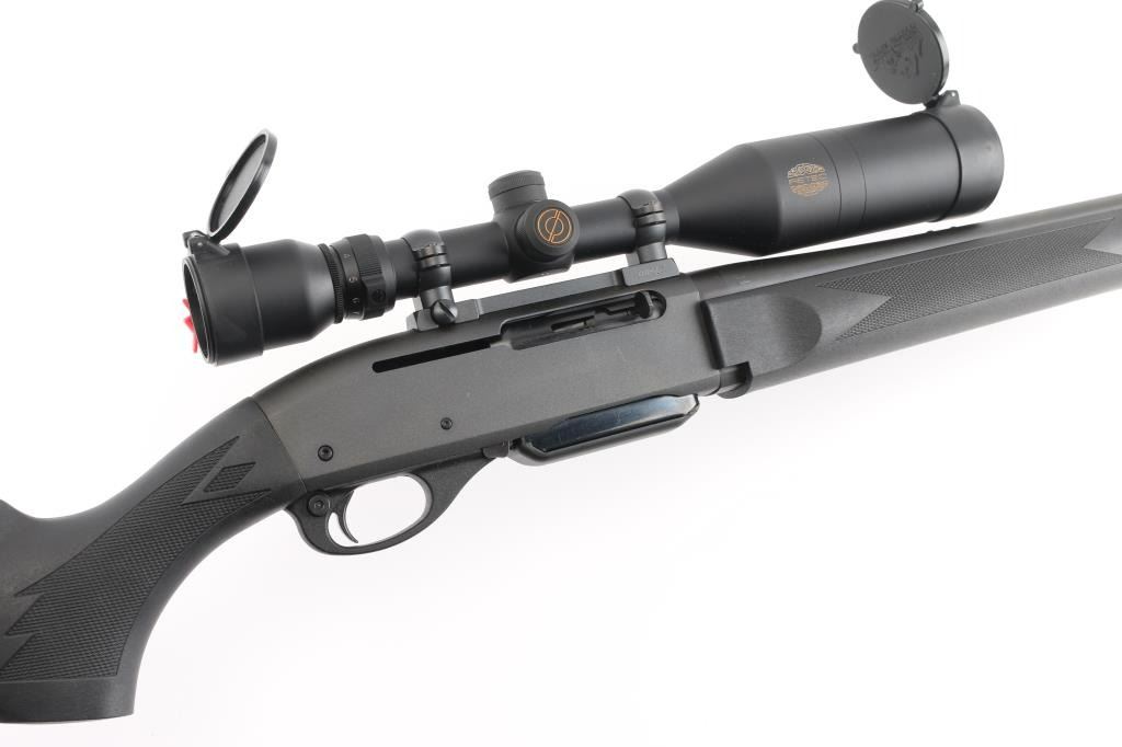 Semiautomatic sporting rifle features approx 22 inch barrel, detachable magazine, blade front sight, rear sight removed, one piece Leupold base & rings attached to receiver, push button safety (can be rotated to lock in 'safe' position). Two piece black polymer stock has checkered forend & wrist, black rubber recoil pad. Bore is excellent. Retains 98% matte blue with few scratches. Stock is very good condition with handling marks. Includes (1) magazine. Mounts a very good condition Simmons "RETEC" 2.8-10x44mm scope with duplex reticle, clear view, flip up caps. Condition is NRA Excellent *** Modern Firearm ***