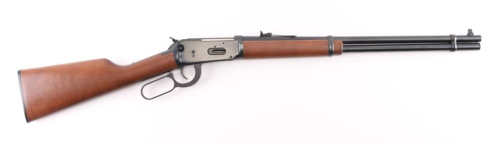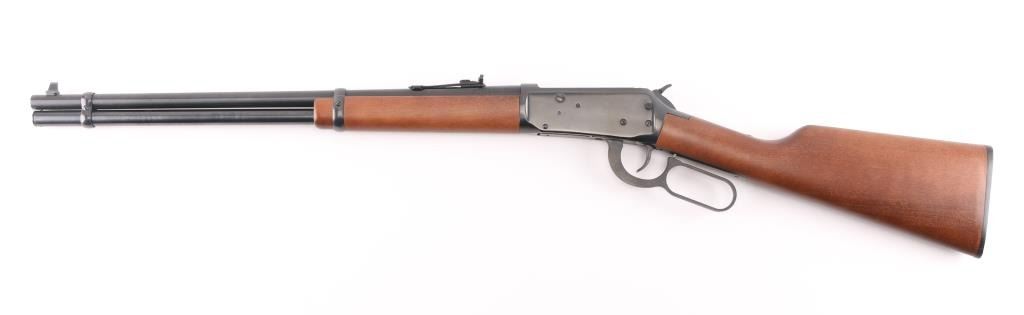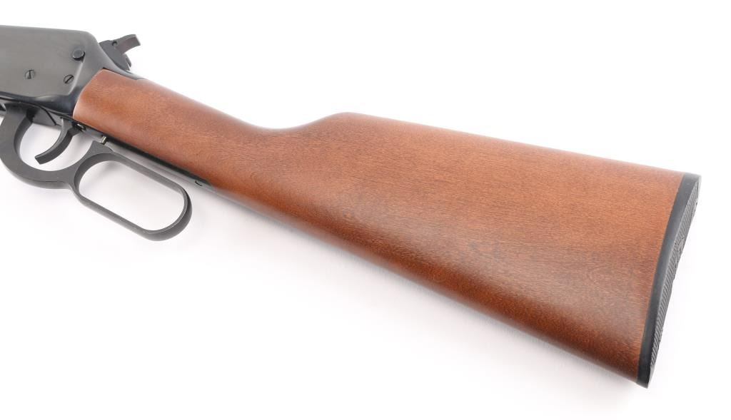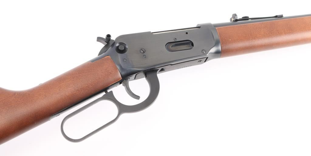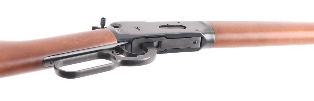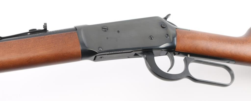 Lever action rifle features blued finish, smooth wood forend & straight gripped stock, plastic buttplate, 20" barrel, blade front & sporting rear sights, tube magazine under barrel, manual cross bolt safety, angle eject receiver, side extension lever threaded into hammer. Bore is excellent condition. Retains 95% blue with few handling. Wood is very good to excellent condition. Condition is NRA Excellent *** Modern Firearm ***