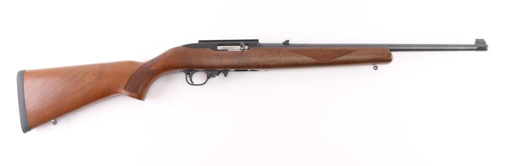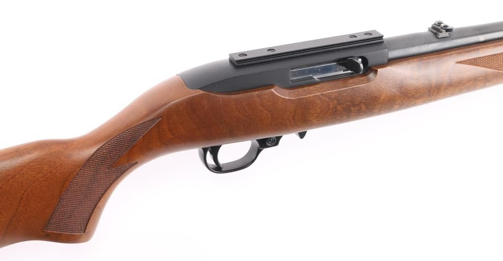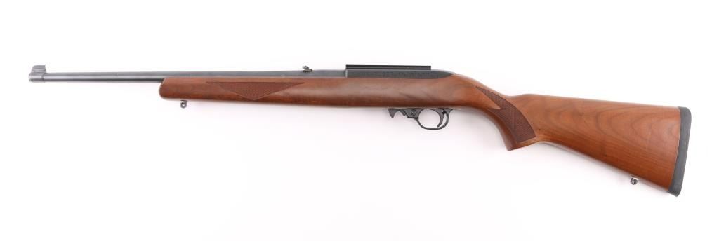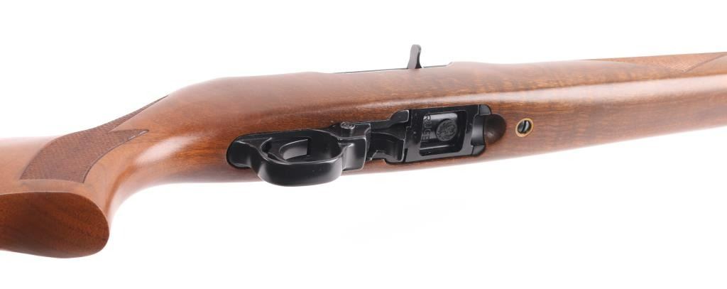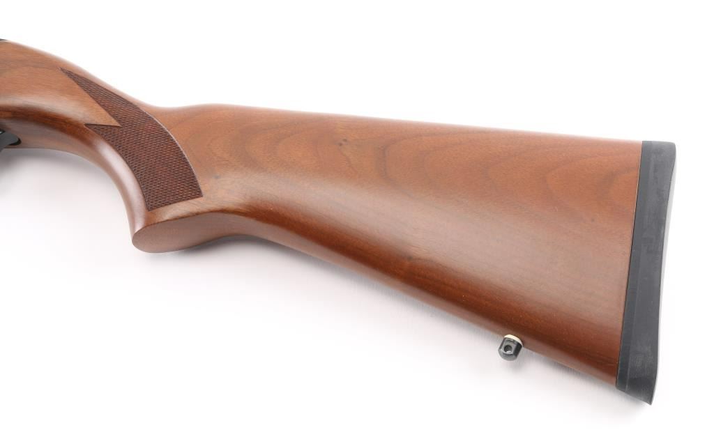 Semiautomatic rimfire rifle features blued finish, checkered wood stock with curved grip, thin rubber butt pad, 18" barrel, blade front sight, folding adjustable rear sight, dovetail base mounted to receiver, manual safety, manual bolt hold open, sling studs, detachable magazine. Bore is very good. Retains 98% finish with minor handling marks. Stock is excellent overall, scrape on forend, few small scratches. Includes (1) magazine. Condition is NRA Excellent *** Modern Firearm ***