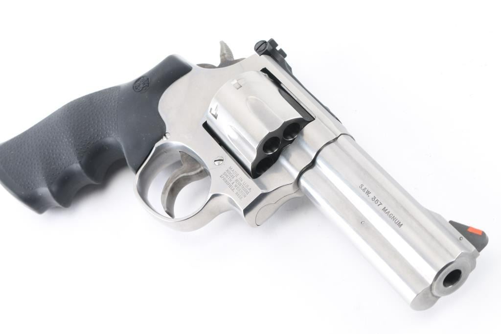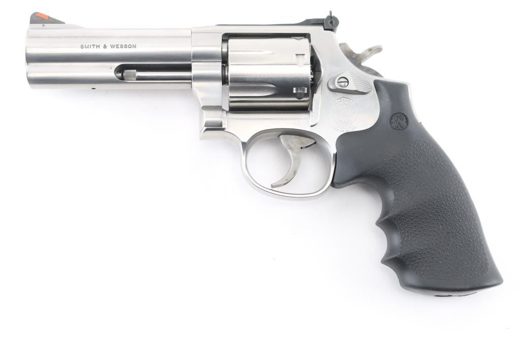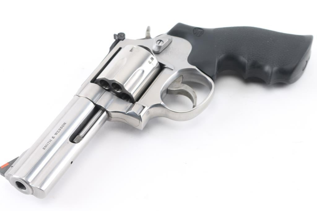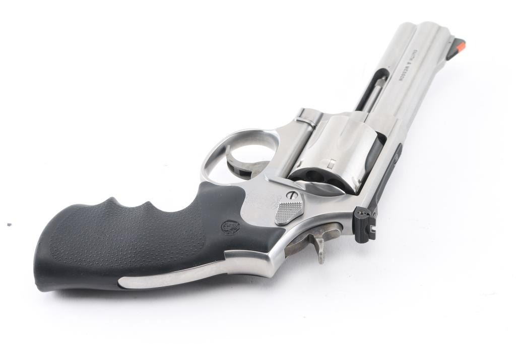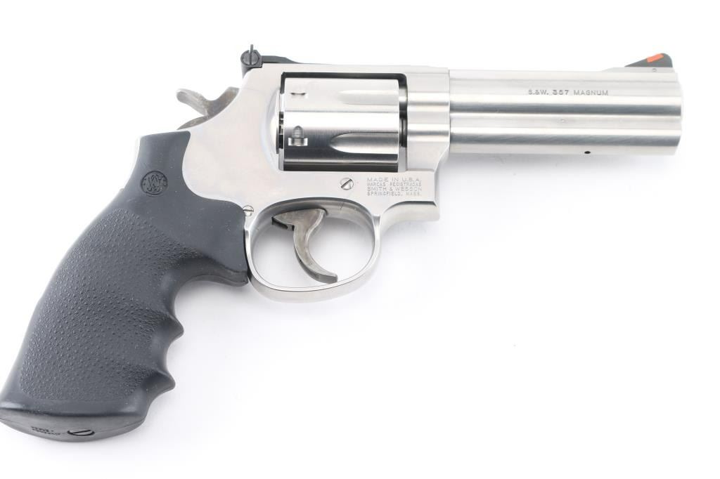 American made 7 shot DA/SA revolver built on the "L" frame, features stainless steel construction, black contoured rubber Hogue grips with molded-in S&W logo, 4" barrel with full length underlug, fluted cylinder, smooth trigger, knurled hammer spur, orange insert ramp front sight and white outline adjustable rear. Bore and cylinders look good. Metal finish looks very good. Grips are fine. Condition is NRA Excellent. *Modern Firearm*