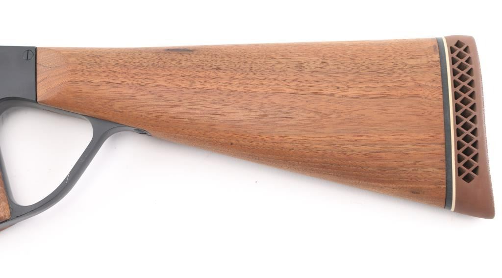 37mm flare launcher. Marked "1-1/2 CAL", Break open single shot, double action trigger, folding rear sight and brass bead front sight. Refinished in a dark gray parkerizing or matted bead-blast blue, with walnut furniture, ventilated rubber recoil pad. Bore is fairly smooth. Retains 90% refinish, some losses of markings. Marked "DOC 27059". Several hairline cracks in wood next to receiver.