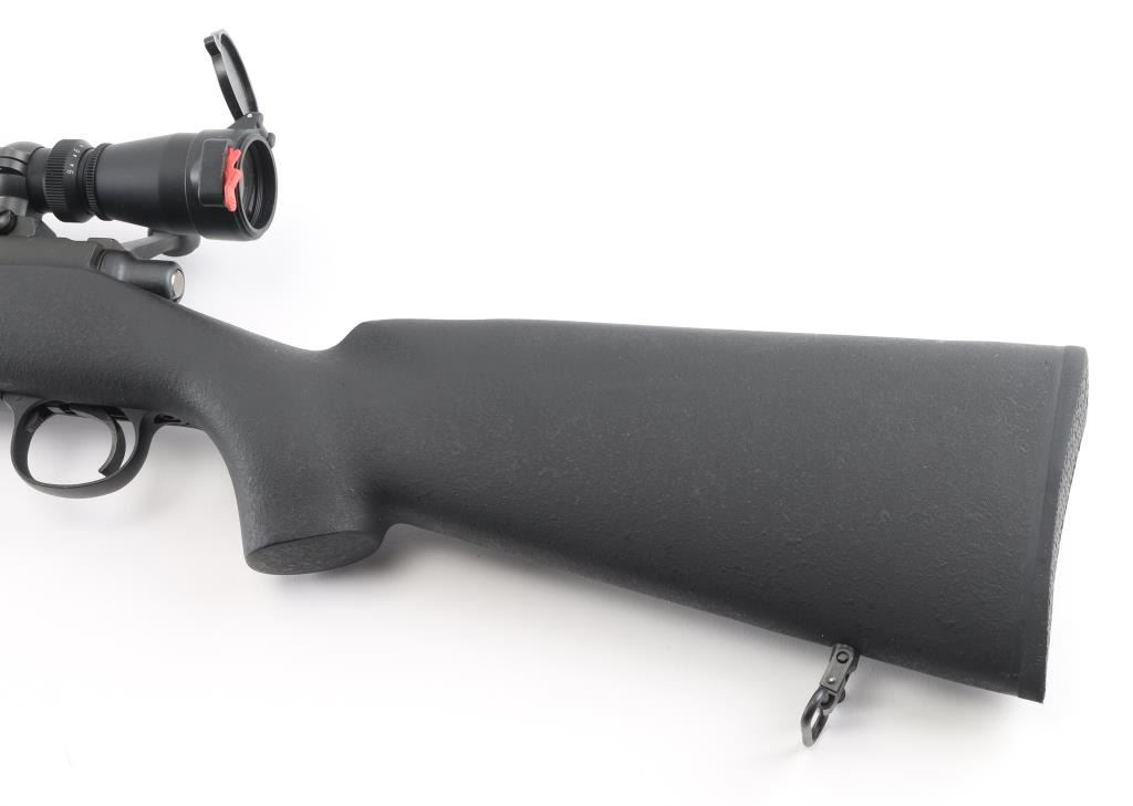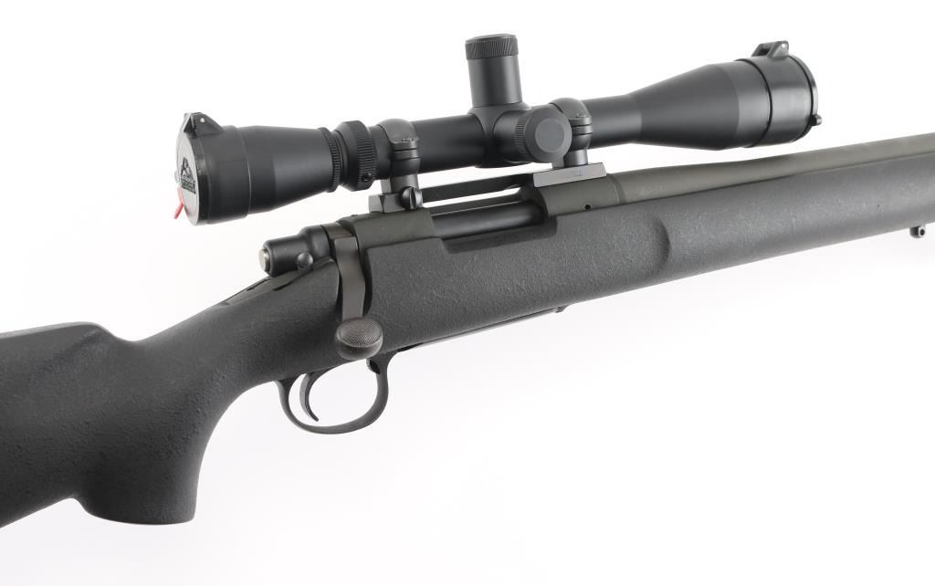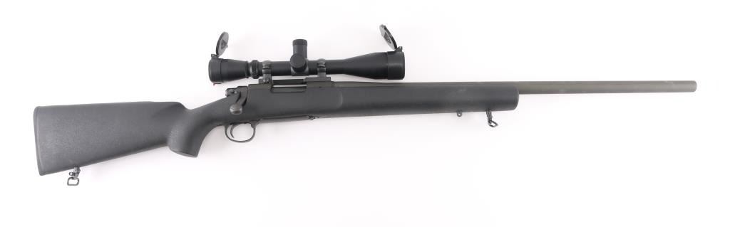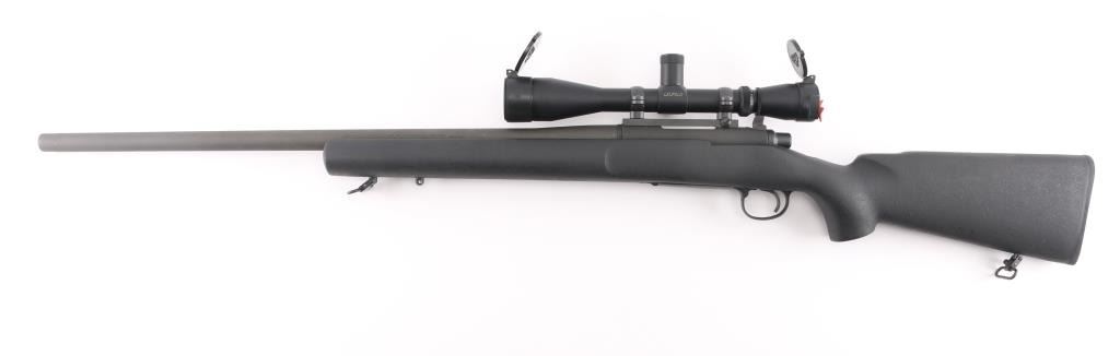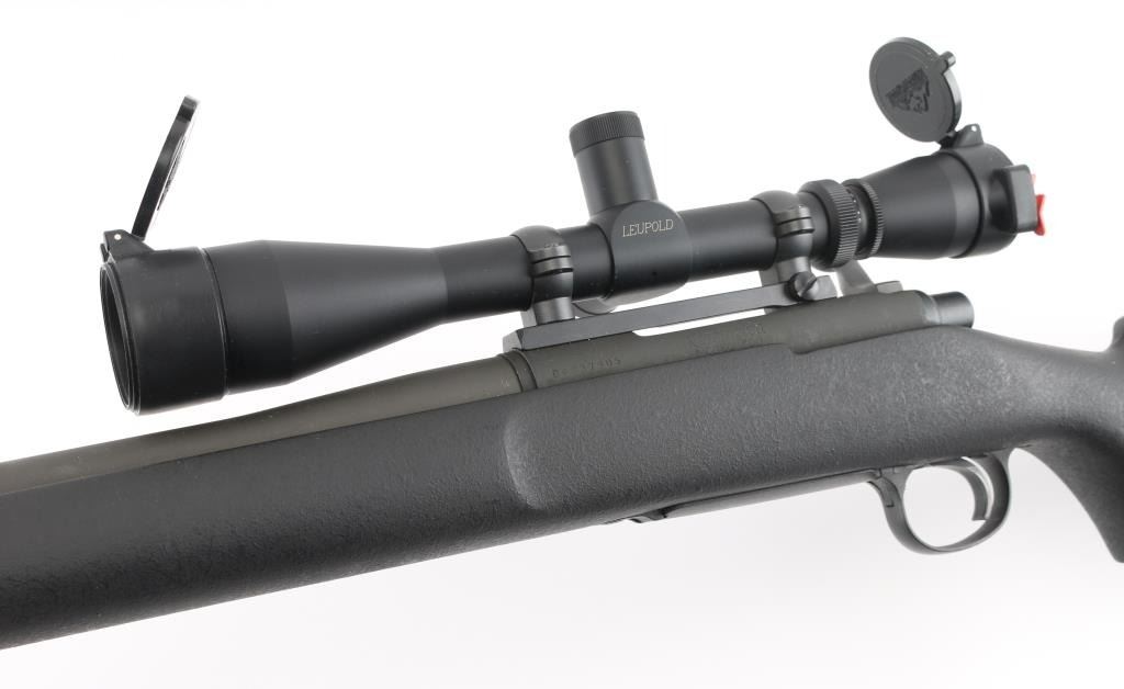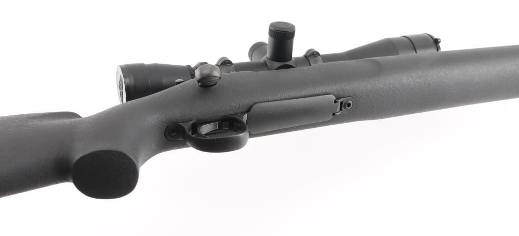 Bolt action sporting rifle features matte black parkerized finish, black composite stock (Remington marked on butt pad, looks like an HS Precision stock), 26" heavy barrel, hinged floorplate, manual safety, sling studs with swivels (extra stud up front for a bipod), solid rubber butt pad, blued Leupold one piece base with rings. Mounts a Leupold Vari-X IIc Tactical 3-9x40mm scope with mil dot reticle, tall adjustment turrets with covers, flip up caps. Bore is very good condition. Retains 95% finish with minor scuffs, other handling marks. Stock is excellent. Scope is very good condition with bright clear view. Condition is NRA Excellent *** Modern Firearm ***