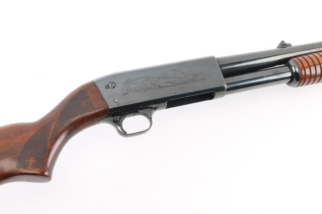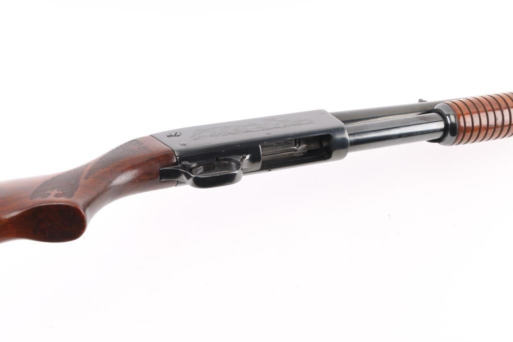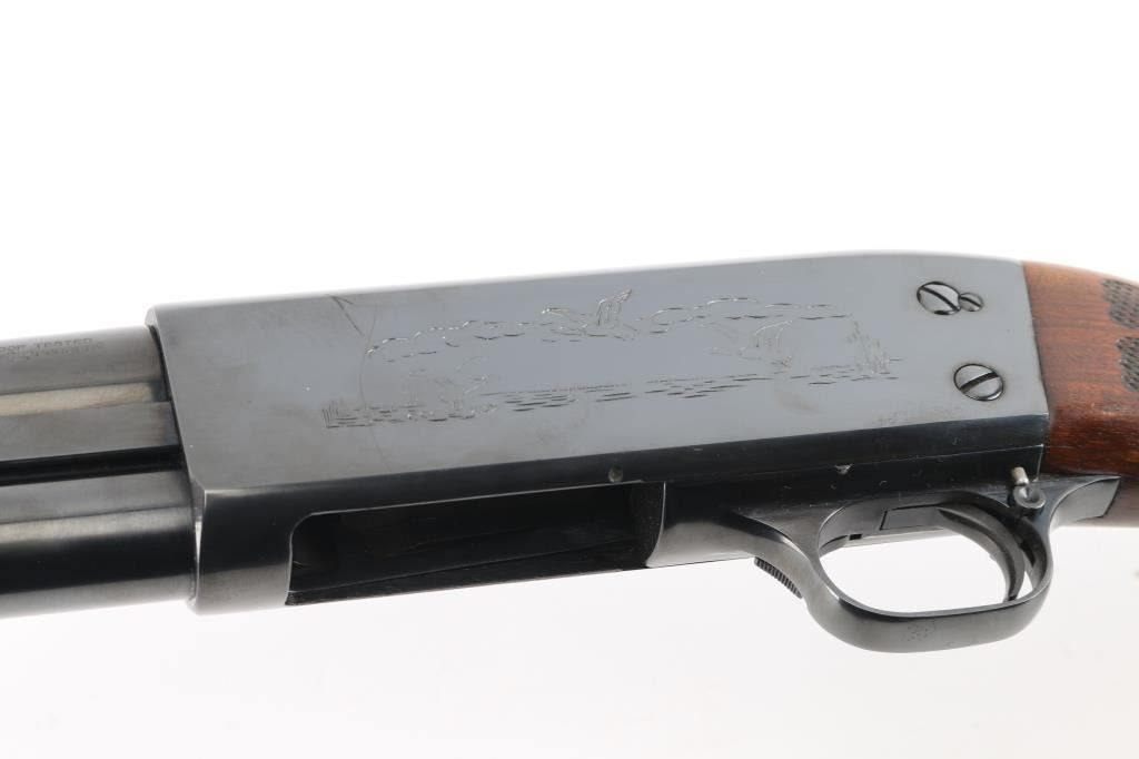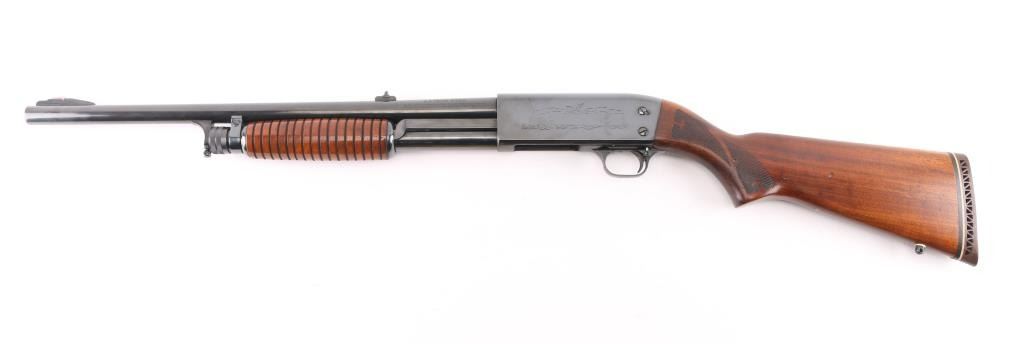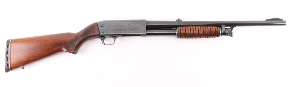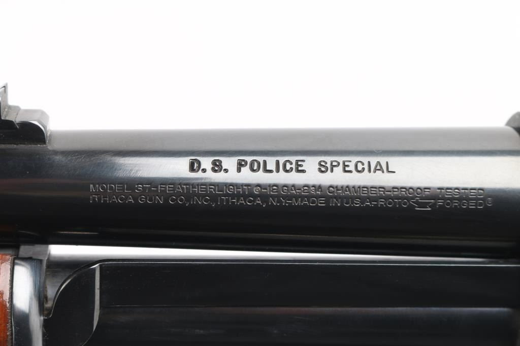 'DS Police Special' Pump action shotgun manufactured circa 1973. Features re-blued finish, grooved walnut pump handle, checkered semi pistol grip shoulder stock with ventilated recoil pad, 20" plain barrel, fixed MOD choke, orange fiber optic blade front sight, dovetails notch rear sight, manual safety, sling studs. Accepts 2-3/4" shells. Bore is very good. Reblued, retains 90% coverage with some loss of detail to receiver scroll engraving, slight dishing around screw holes. Wood is very good condition with scuffs and dents, appears refinished, with some losses to impressed checkering. Condition is NRA Very Good+ (refinished) *** Modern Firearm ***
