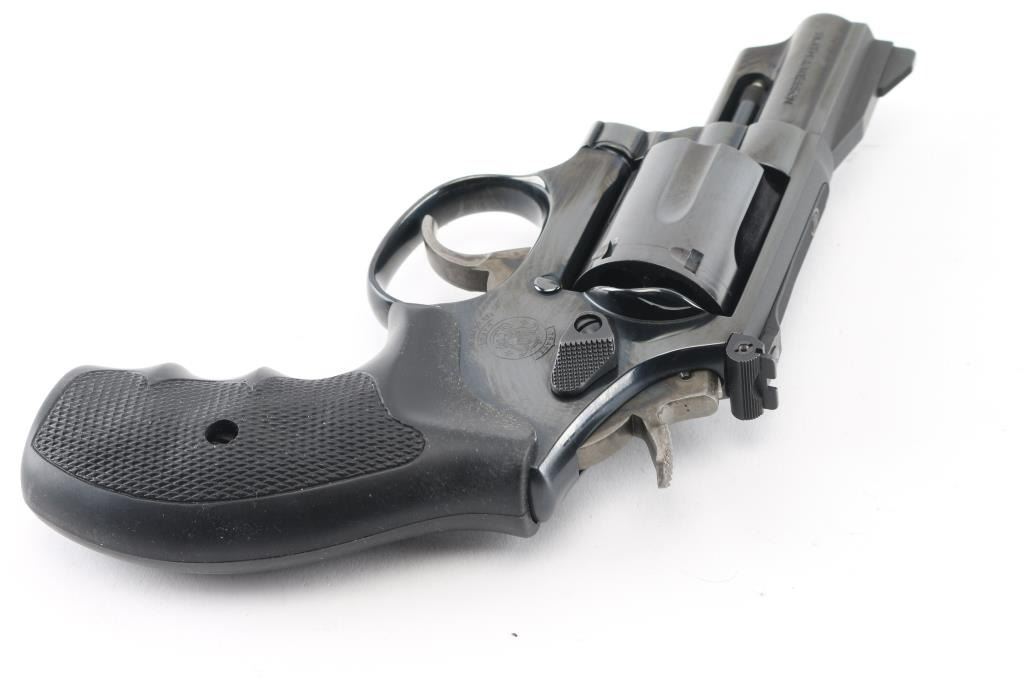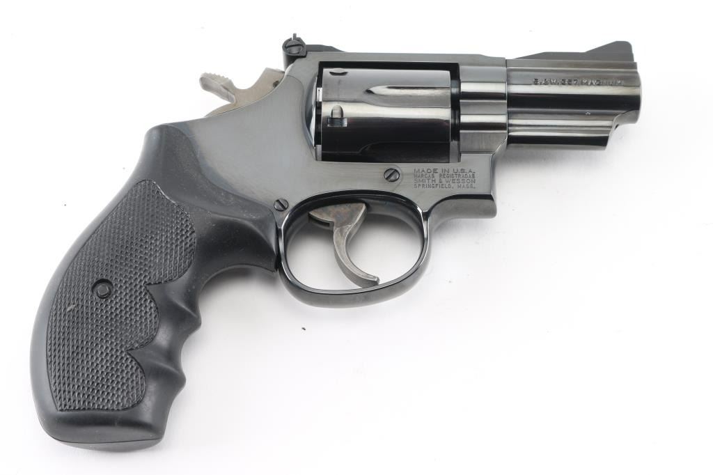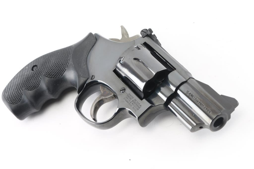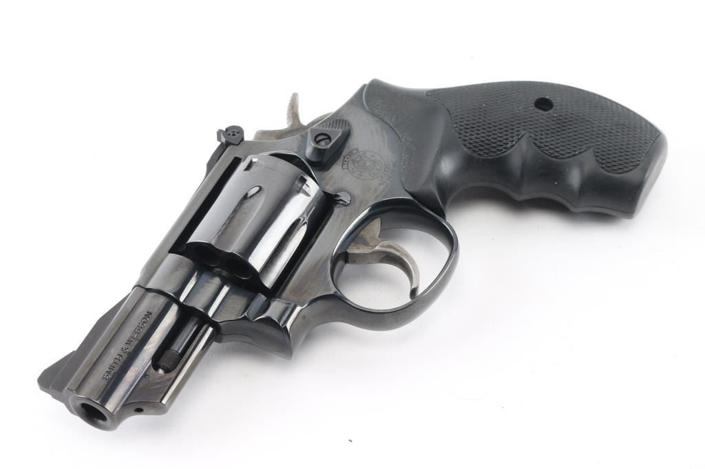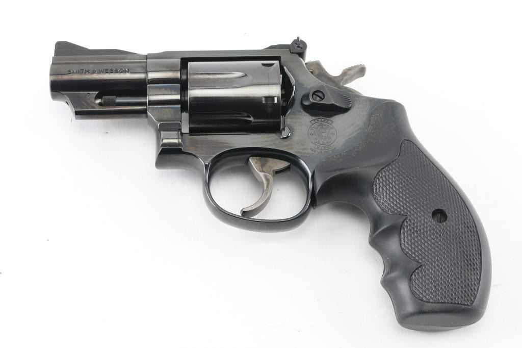 American made 6 shot revolver chambered for 357 magnum ammunition. It features a blued finish over a K target frame, 2.5" barrel, black serrated ramp front sight, adjustable black rear sight, 6 shot fluted cylinder, and color case hardened hammer and trigger. Trigger is smooth, knurled hammer spur. Black rubber "checkered" finger groove grips. Bore looks very good, dusty. Cylinders look good, also dusty. Metal finish looks very good with only a faint drag line on the cylinder. Some contours & edges show slight erosion from polishing, color of bluing looks like factory, possibly carefully reblued, possibly heavily polished at factory. Condition is NRA Very Good. (possible reblue) *Modern Firearm*