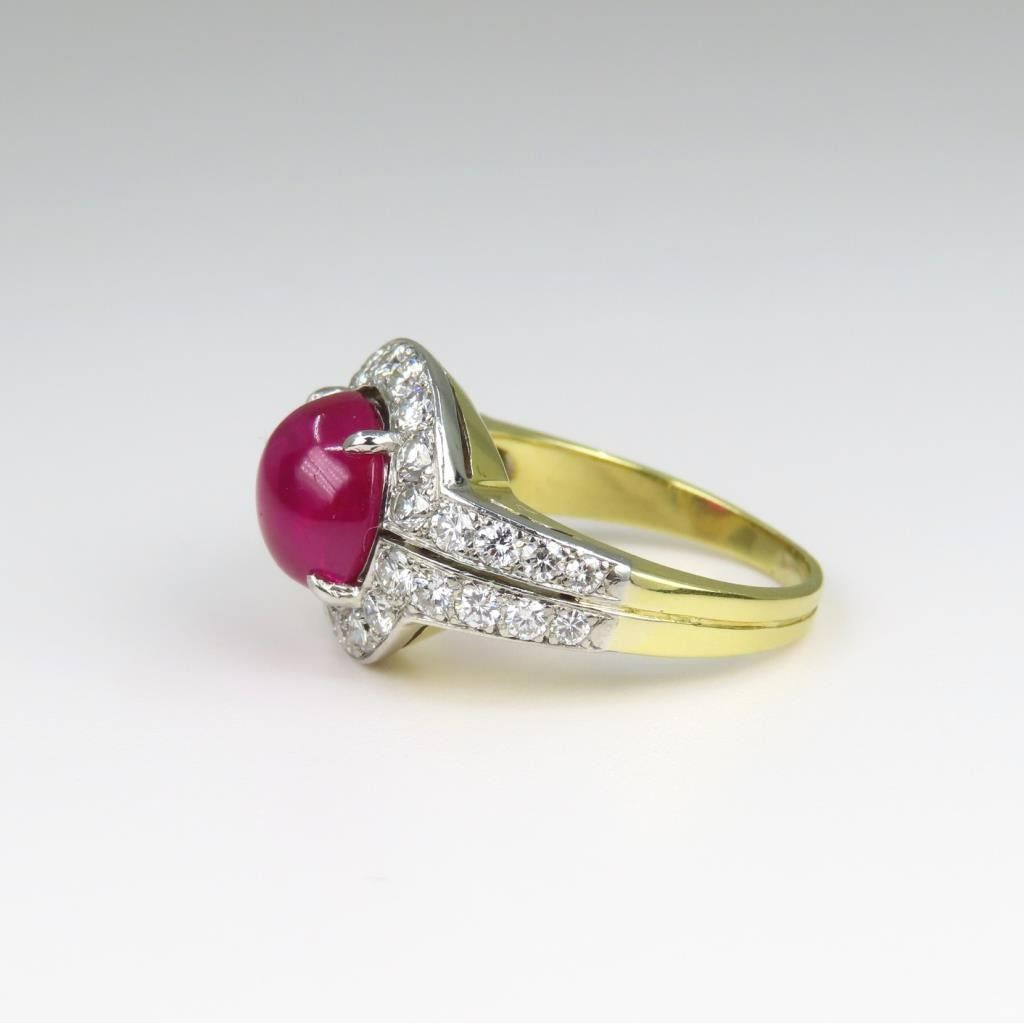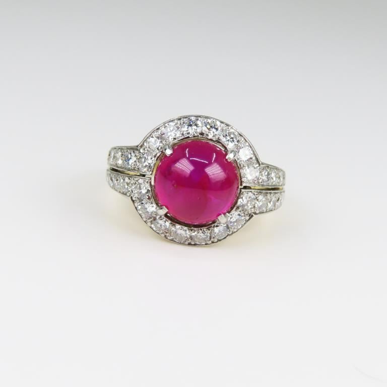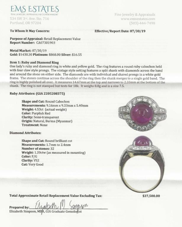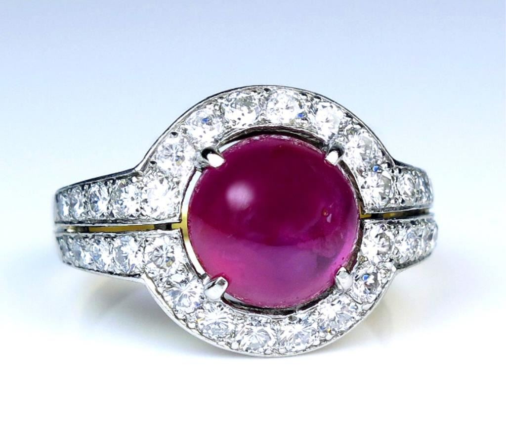Ring featuring a GIA Certified NO HEAT round Cabochon Ruby with Purplish Red color weighing 4.53 carats (actual weight from GIA) surrounded by 32 round pave set Diamonds weighing approx. 1.20 carats with F-G colors and VS clarity set in a luxury designer setting meticulously crafted in a combination of yellow and white 18 karat gold. Full Retail Appraisal - $37,500.00
