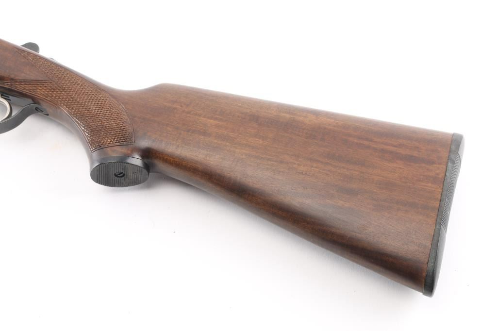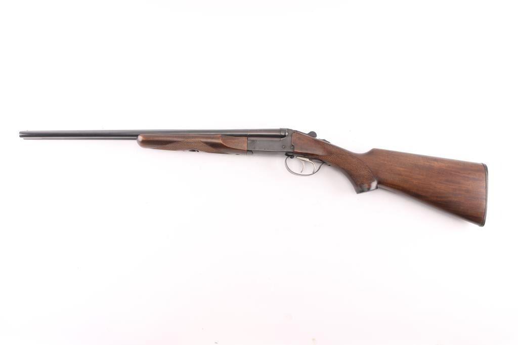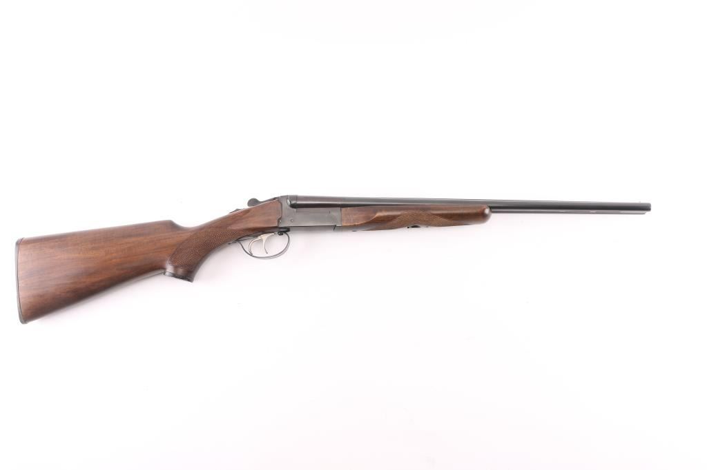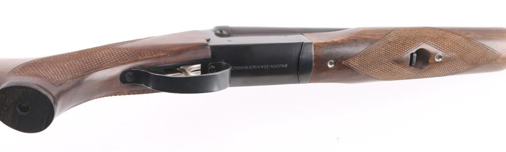 Double barreled side-by-side coach gun made in Brazil by E.R. Amantino (also known as Boito), imported by Stoeger, Wayne NJ. Features box lock, blued finish, 20" barrels with fixed Mod (L) & CYL (R) chokes, low matted rib, brass bead front sight, double triggers, knurled top lever, sliding tang safety, extractor, checkered walnut beavertail forend, checkered walnut semi-pistol grip shoulder stock, serrated black plastic buttplate & grip cap. 3" chamber. LOP is 14.5". Barrels numbered to receiver. Bores are very good. Retains 95% finish with minor edge losses, handling marks. Wood is excellent with few blemishes. Condition is NRA Excellent *** Modern Firearm ***