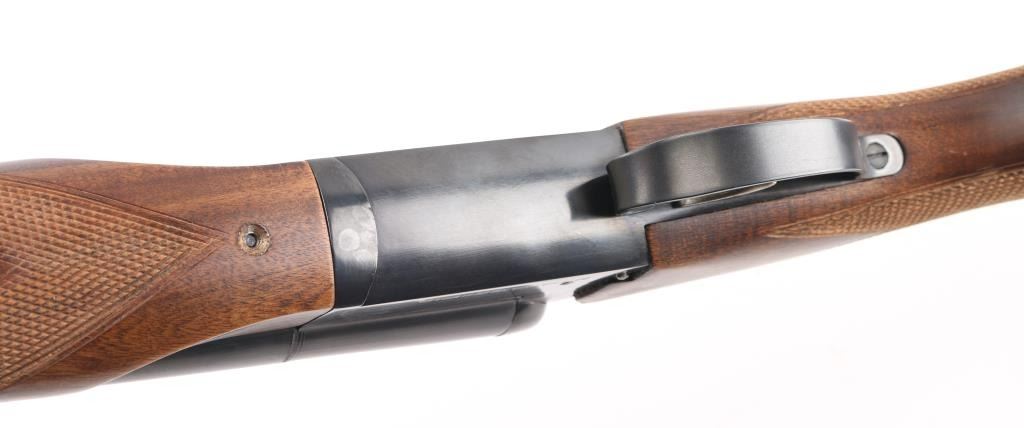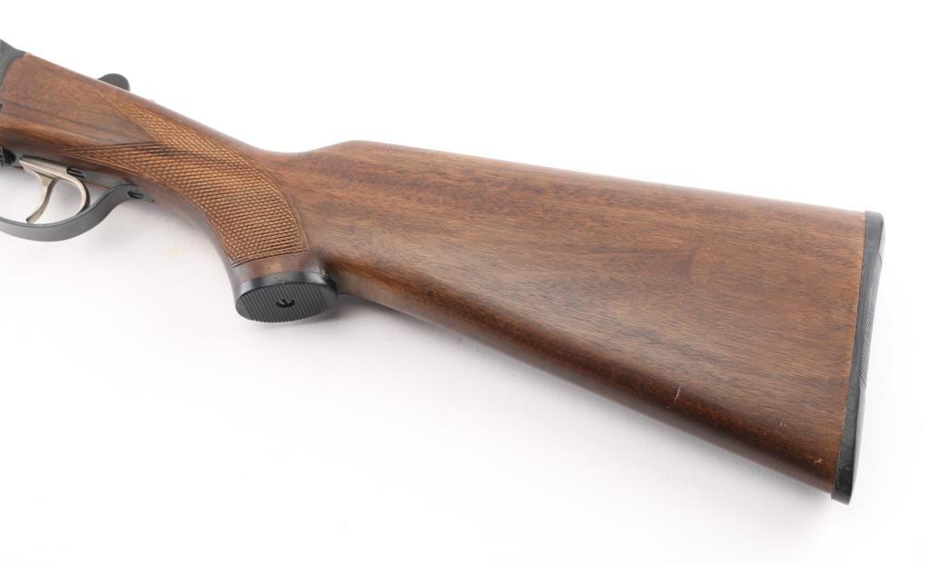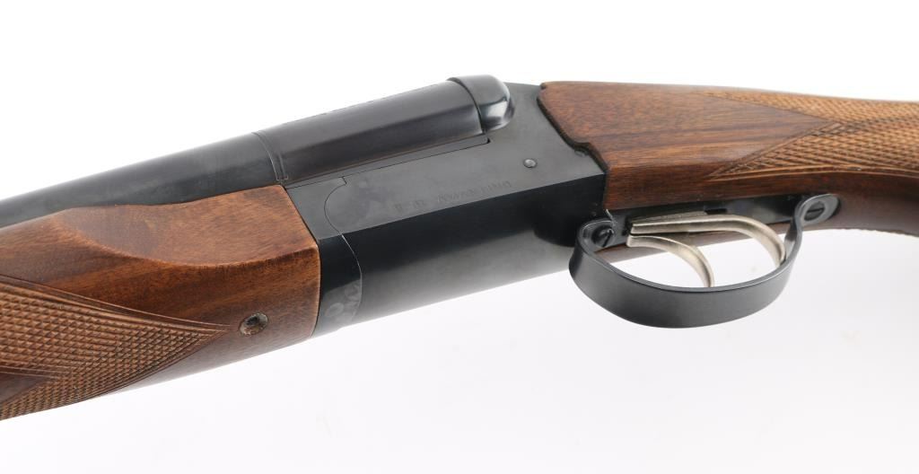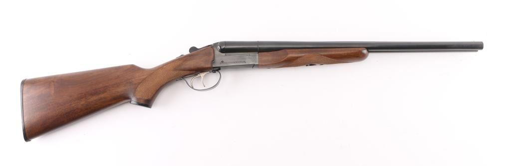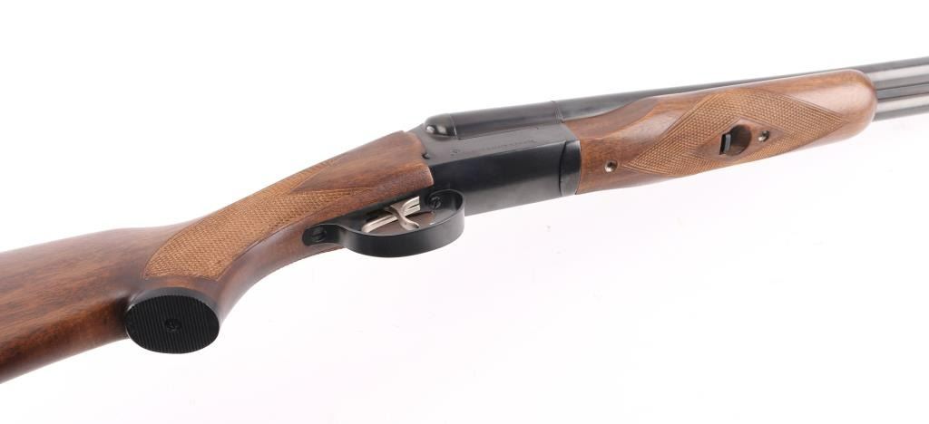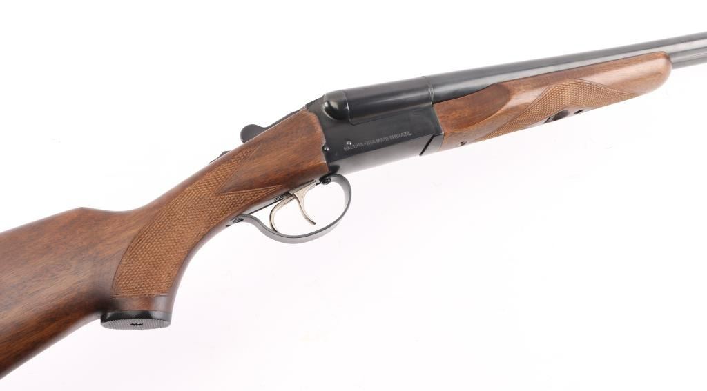 Double barreled side-by-side coach gun made in Brazil by E.R. Amantino (also known as Boito), imported by Stoeger, Wayne NJ. Features box lock, blued finish, 20" barrels with fixed Mod (L) & IC (R) chokes, low matted rib, brass bead front sight, double triggers, knurled top lever, sliding tang safety, extractor, checkered walnut beavertail forend, checkered walnut semi-pistol grip shoulder stock, serrated black plastic buttplate & grip cap. 3" chamber. LOP is 14.5". Barrels numbered to receiver. Bores are very good. Retains 95% finish with minor edge losses, handling marks. Wood is excellent with few blemishes. Condition is NRA Excellent *** Modern Firearm ***