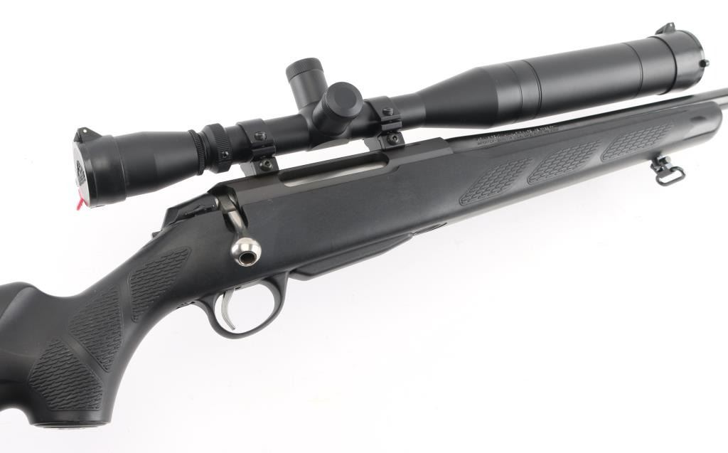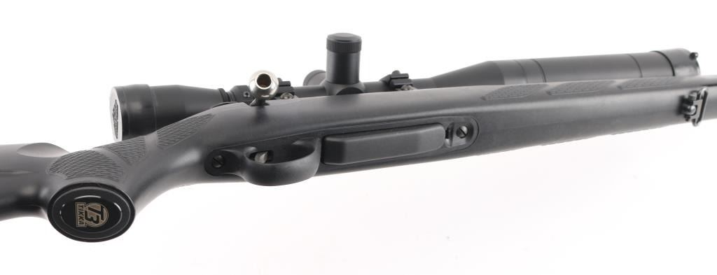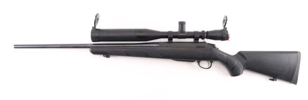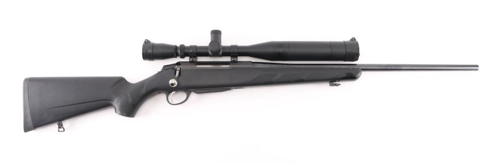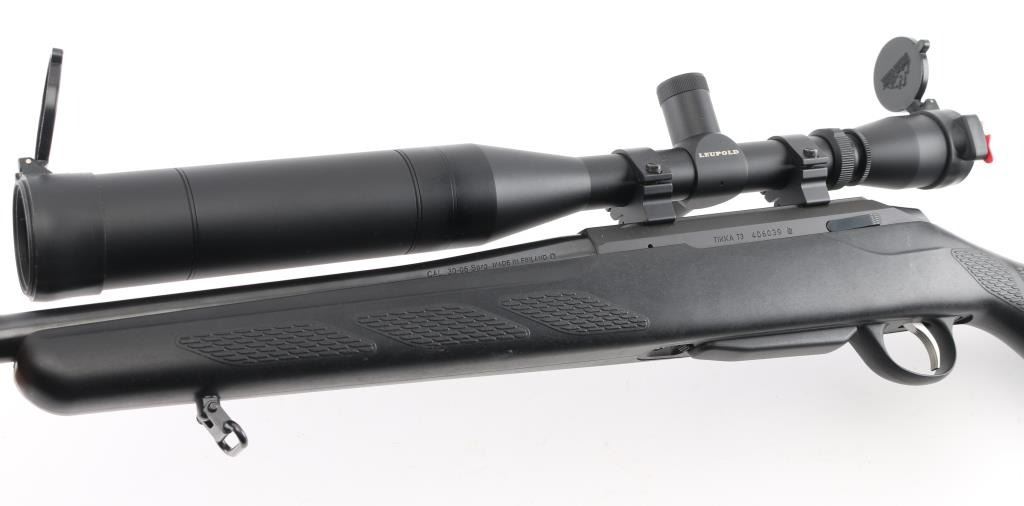 Bolt action rifle made in Finland, imported by Beretta USA, Accokeek MD. Features matte black metal finish, silver colored bolt, black polymer stock with textured gripping panels at wrist & forend, 22" barrel, no sights, detachable magazine, manual safety, 'cocked' indicator, sling studs with detachable swivels, solid rubber recoil pad, grooved receiver for scope mounting. Bore is excellent. Overall condition is excellent, with few handling marks. Mounts an excellent condition Leupold Mark 4 3-9x40mm PR scope, with mil dot reticle, extended sunshade, flip up caps, clear view. Includes (1) flush fit magazine. Condition is NRA Excellent *** Modern Firearm ***
