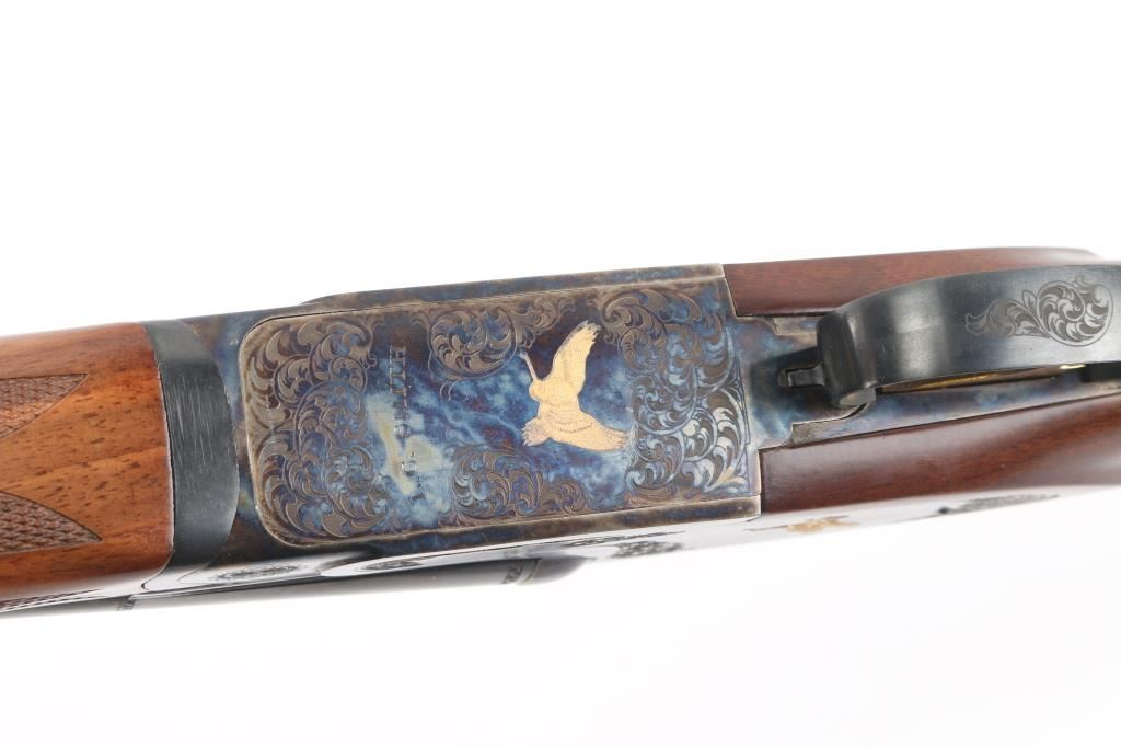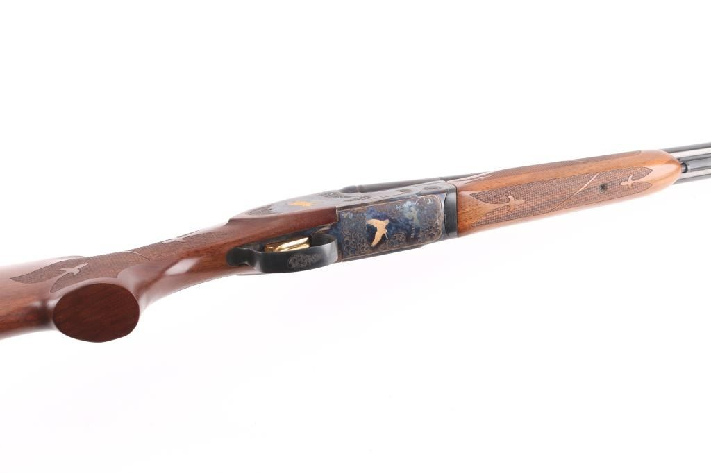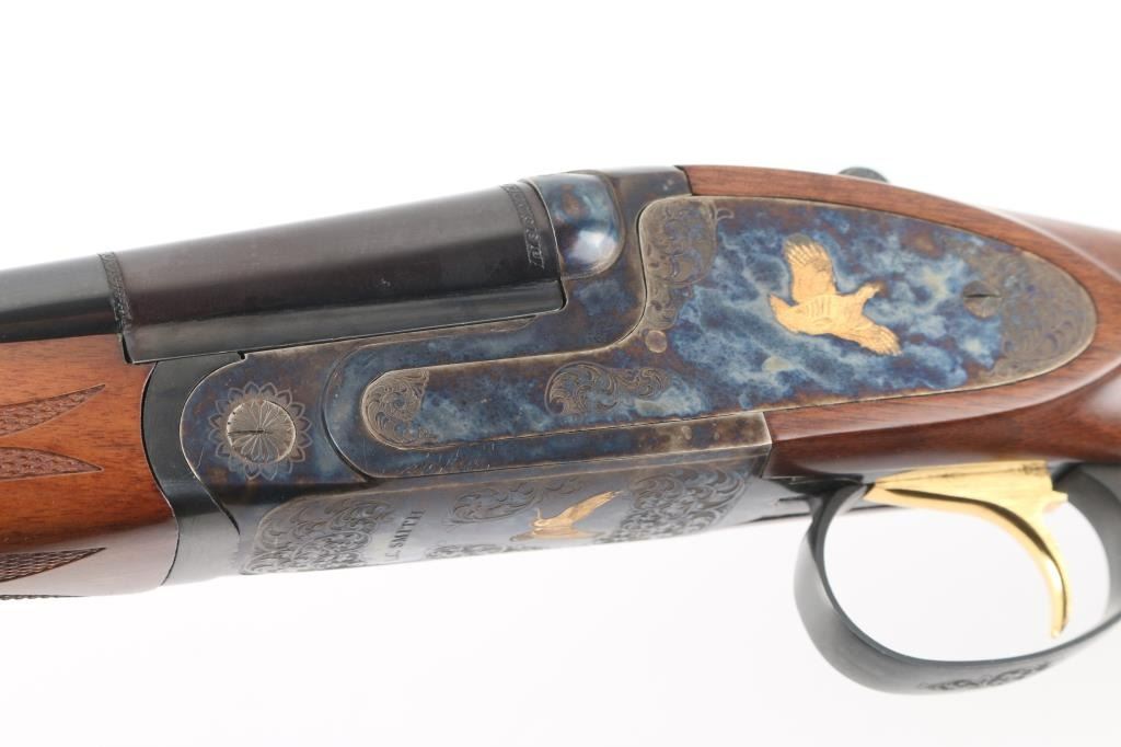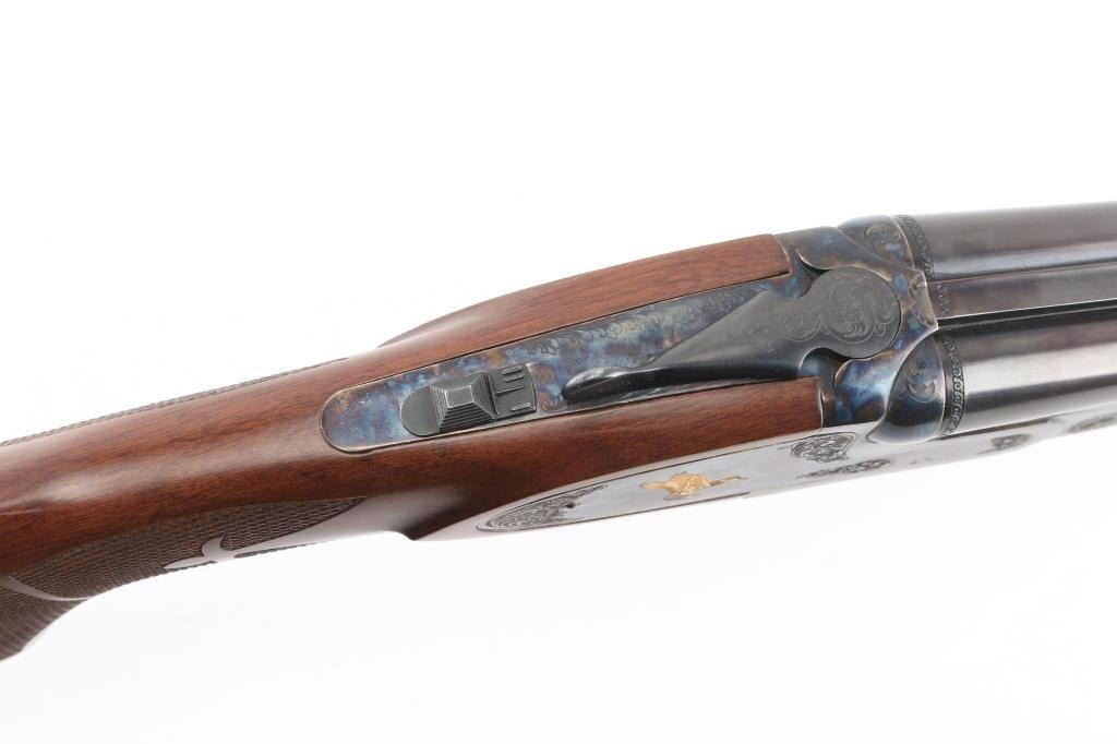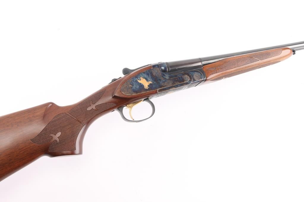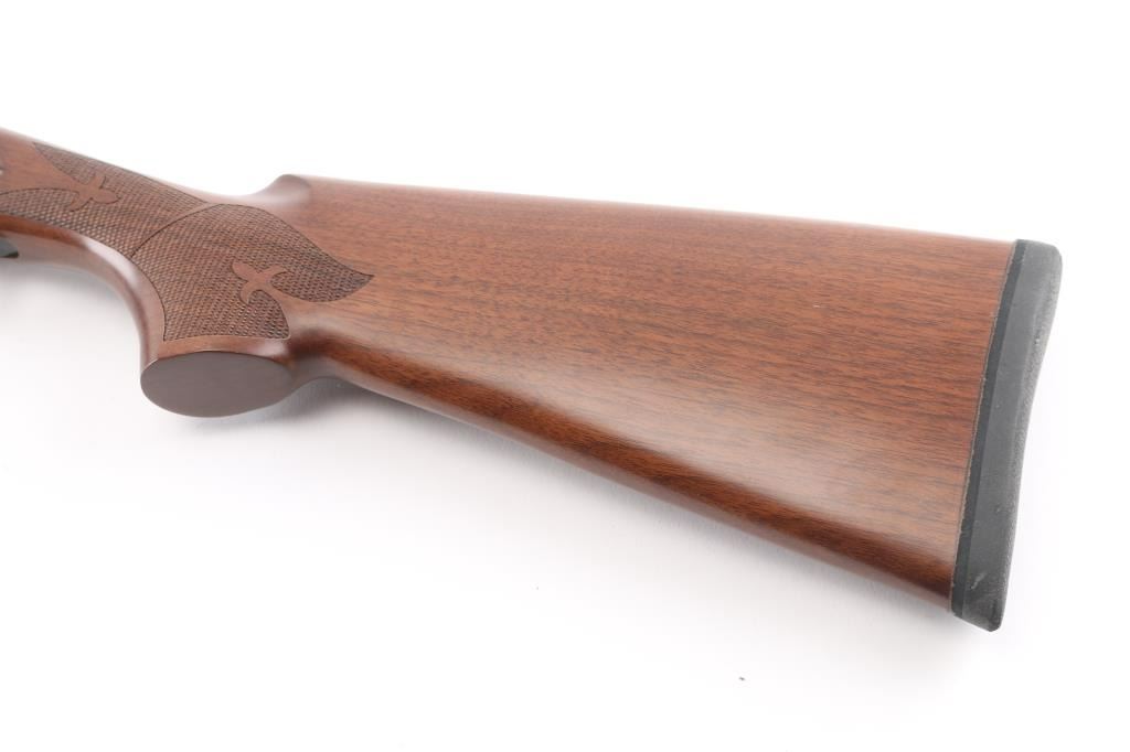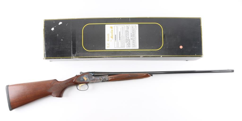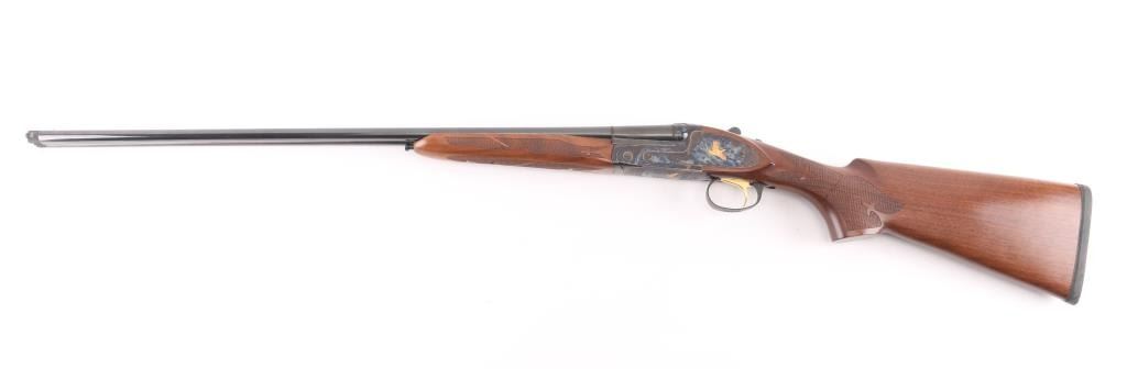 Spanish made double barrel SxS side lock internal hammer shotgun imported by Marlin Firearms, North Haven CT, under the "LC Smith" trade name. Accepts 2 1/2'-3" shells. Features blued finish, case colored action with limited scroll engraving & gold inlaid game birds, 26" barrels, 'SK' & 'C' extended choke tubes inserted, brass bead, gold color accent single inertia trigger, tang safety selects barrel, selective ejection, walnut stocks with semi-pistol grip, solid rubber recoil pad, fancy fleur-de-lis insets on checkered panels at wrist & forend LOP is 14.5'. Bore is excellent/Bright. Finish & wood are excellent. Includes the original cardboard box. This shotgun has very little, if any use. Condition is NRA Perfect in Box. Modern Firearm.