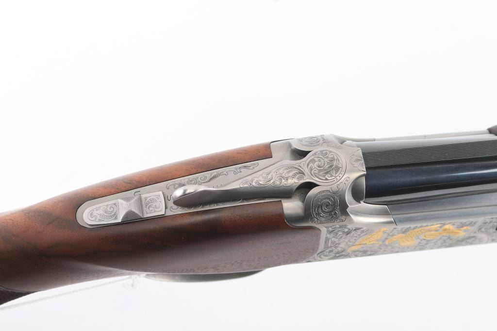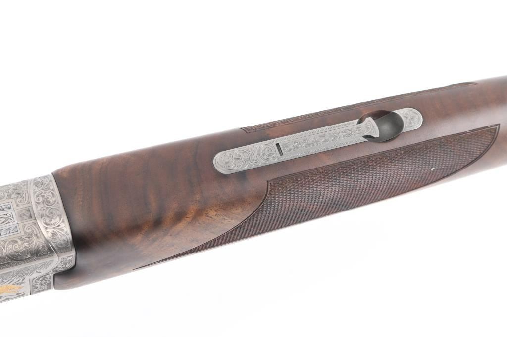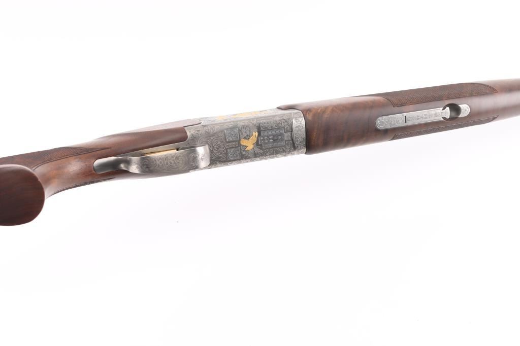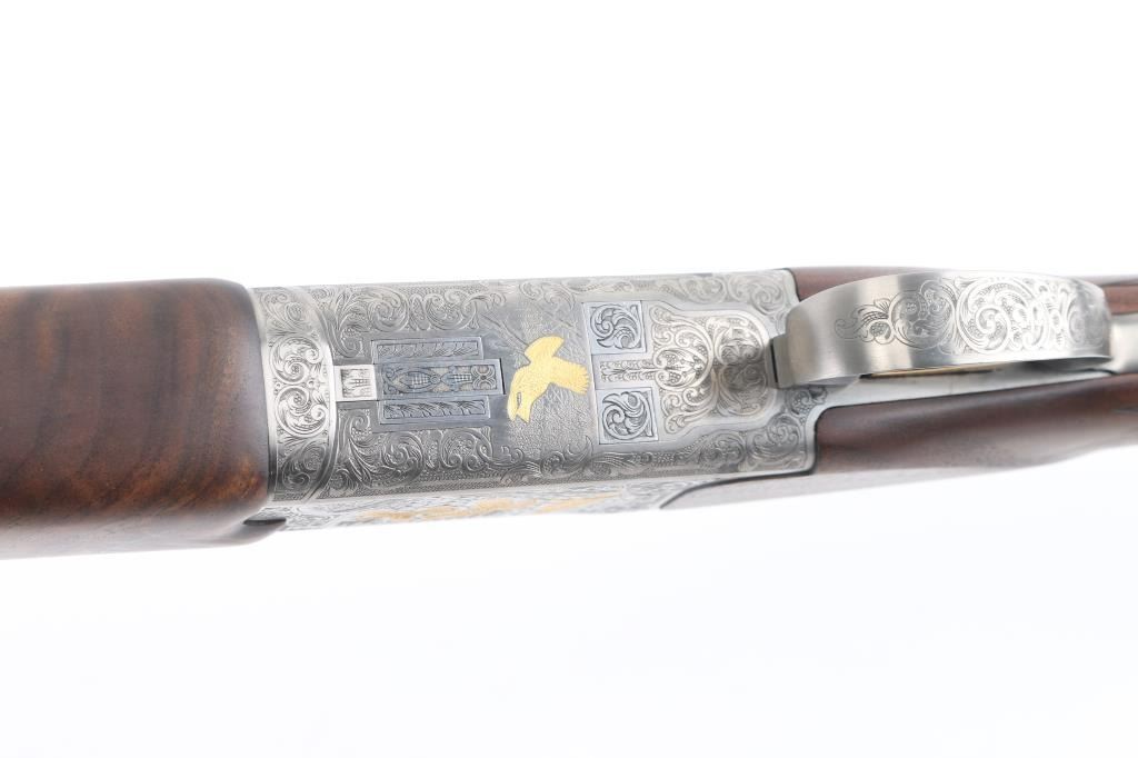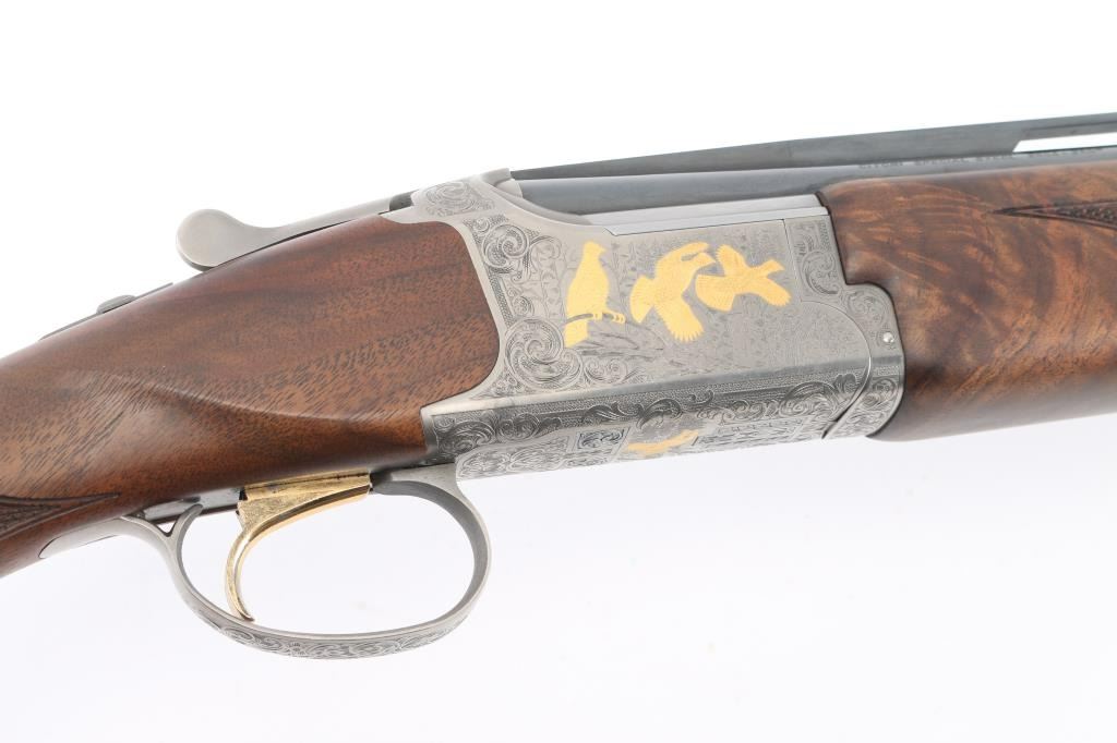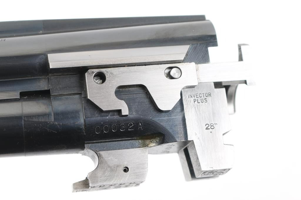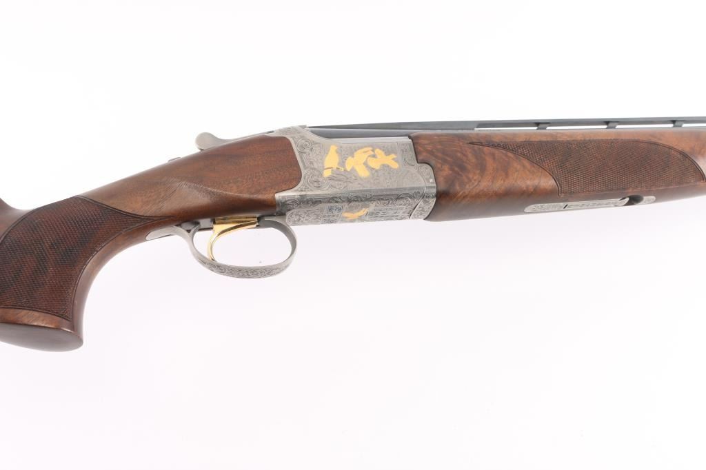 SN: 00032MRDSC This is a special order shotgun shipped to Davidson's Firearms in 2007, thus the 'DSC' in the serial number (Davidson's Special Combo) Highly embellished Japanese made by Miroku under/over double barrel shotgun chambered for 2 3/4" .28 gauge shells, second barrel in .20 Ga. Features high polish blued 28" vent rib barrels, Invector choke system interchangeable choke tubes, Invector plus on the .20 Ga., selective ejectors, white Bradley bead front sight, small white mid bead, single gold trigger, sliding tang safety/barrel selector, full coverage floral scroll engraving on the coin-finished receiver with three gold flushed grouse on both side of the receiver a gold grouse on bottom, finely checkered fancy walnut schnabel forend and pistol grip shoulder stock with factory butt plate, oil finished grained wood. Bores are excellent/bright: Wood, and metal finish are excellent. 14-1/4" Length of Pull. Includes a Browning luggage style case with leather corners, leather & handle, (With keys) green cloth covering and green velvet lining. Choke tubes include: SK (installed in the .28 Ga. and .20 Ga.), case has owner manual, and MOD, IC, FULL flush chokes in .28 Ga. and .20 Ga. (6) total, tube wrench, and two sets of Omega chamber lock kits in both .28 & .20 Ga. All matching serial numbers. Condition is NRA Excellent - like new Modern Firearm.