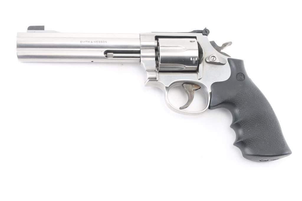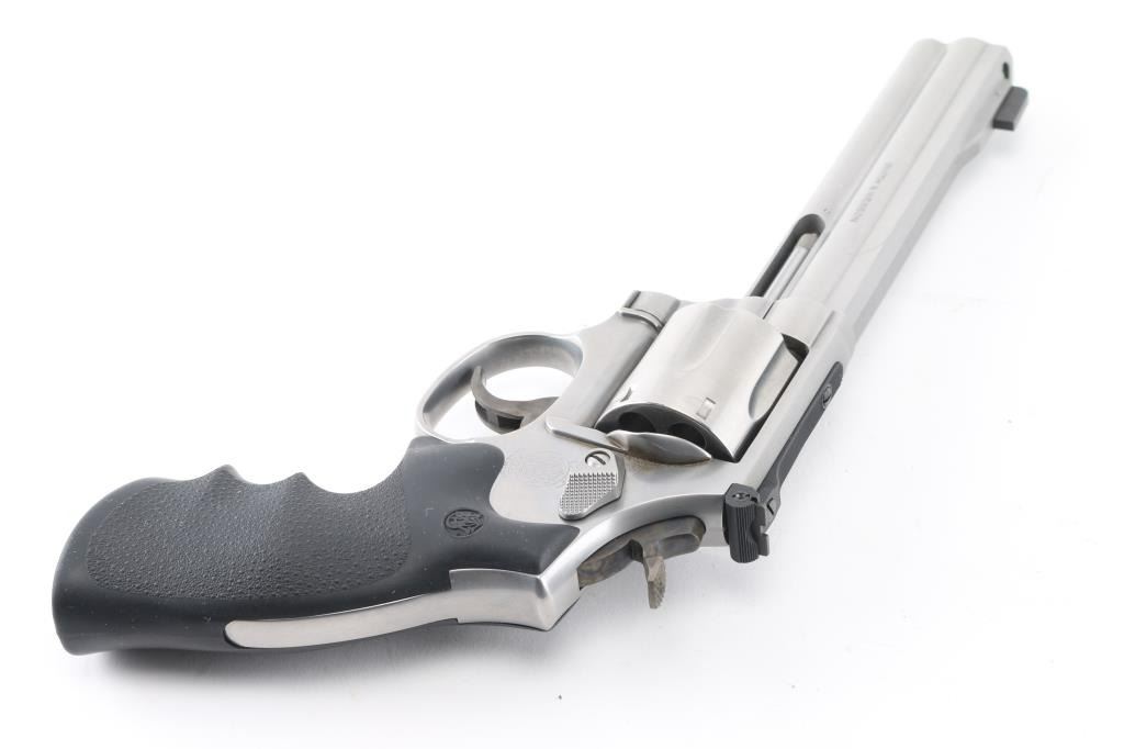 American made 6 shot DA/SA revolver built on the "L" frame, features stainless steel construction, black contoured rubber Hogue grips with molded-in S&W medallions, 6" "Power Port" barrel with full length underlug, fluted cylinder, smooth trigger, knurled hammer spur, raised blade front sight and adjustable rear sight. Bore and cylinders look very good. Metal finish looks good. Grips are fine. Condition is NRA Very Good. *Modern Firearm*