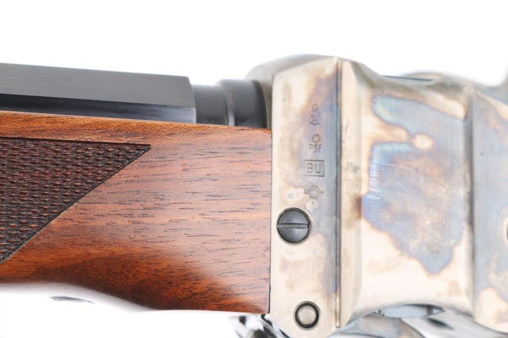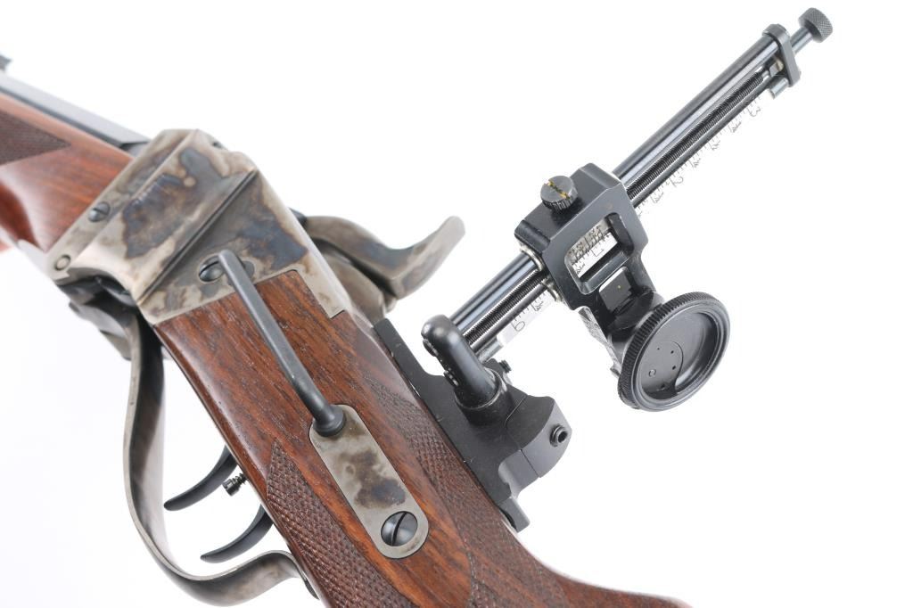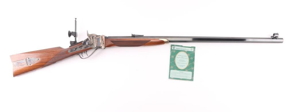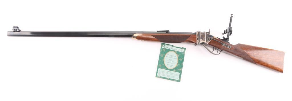 SN: #SH22929 Made in Italy this is a reproduction of the Sharps 1852 Long range rolling block rifle. It has a blued 34" octagon barrel, Case colored receiver, lever, butt plate, patch box, and tang. It has a globe front sight with bubble level, there is a ladder rear sight, but a long range adjustable rear sight is added to the tang with a Hadley Eyedisc. It has very nice wood stocks with checkering at the wrist and forearm with a brass forend cap. Comes with owners manual and sight inserts. Bore looks great. Metal finish looks great. Wood stocks look great. Condition is NRA Excellent.