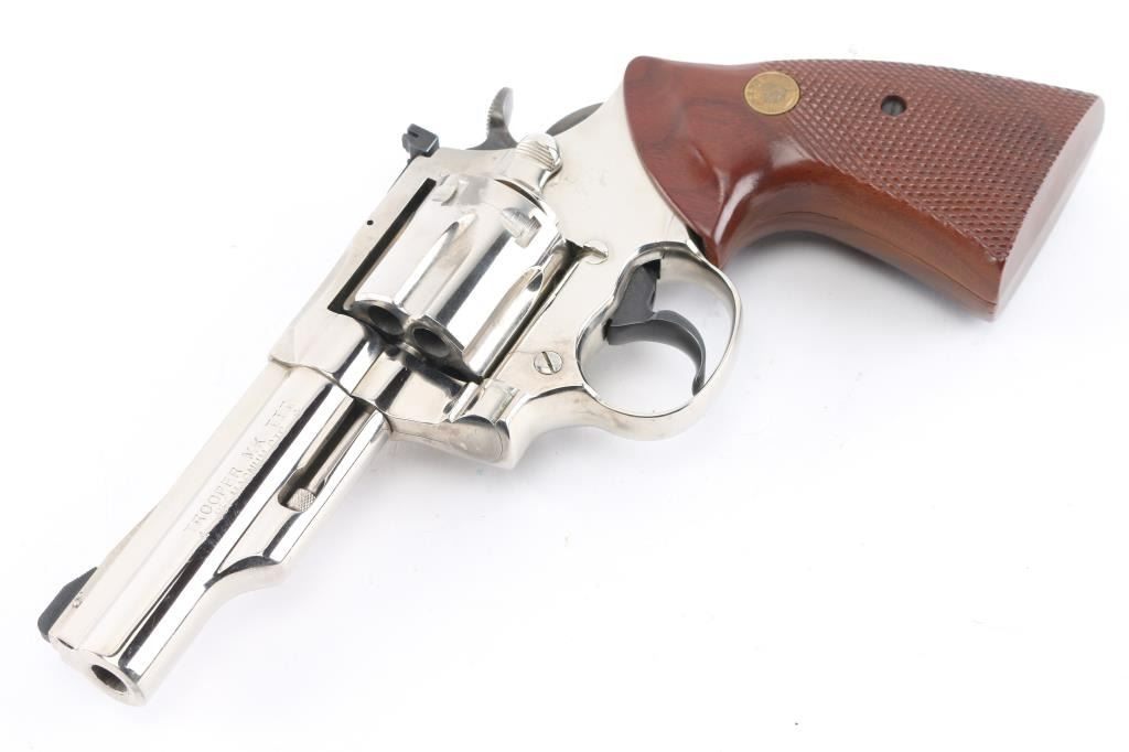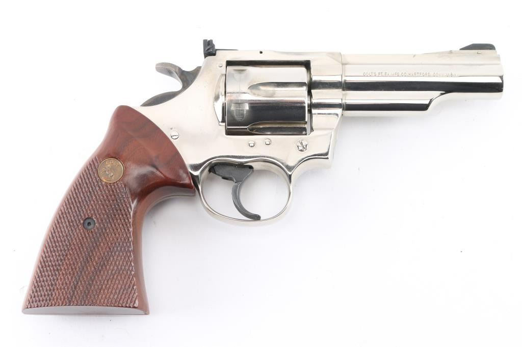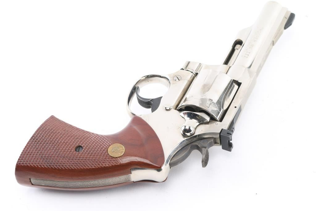 American made DA/SA 6 shot revolver. Manufactured 1977. Nickel finish is good with some minor scratches and a drag line on the cylinder. It has a 4" barrel, ramped, serrated, pinned front sight, and adjustable square notch rear sight. Smooth blued trigger, a case colored hammer and wide knurled hammer spur. The checkering on the wood grips is sharp and the bronze look Colt medallions are in good shape. The bore is excellent/bright. Bore and cylinder are appear very good, but a little dirty. Action is crisp/tight. Some discoloration on the barrel rib. NRA Condition-Very Good. C&R Firearm.