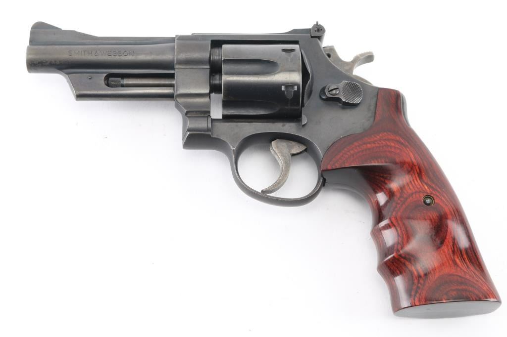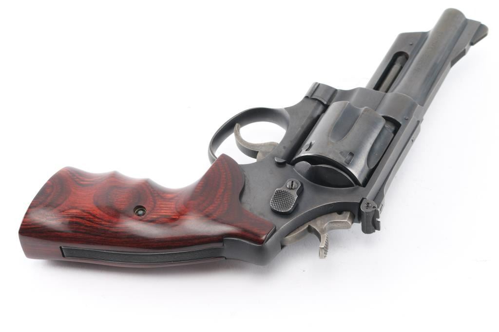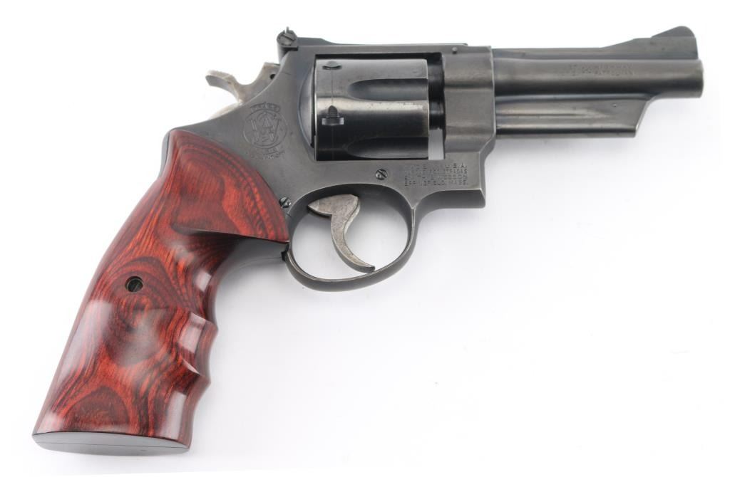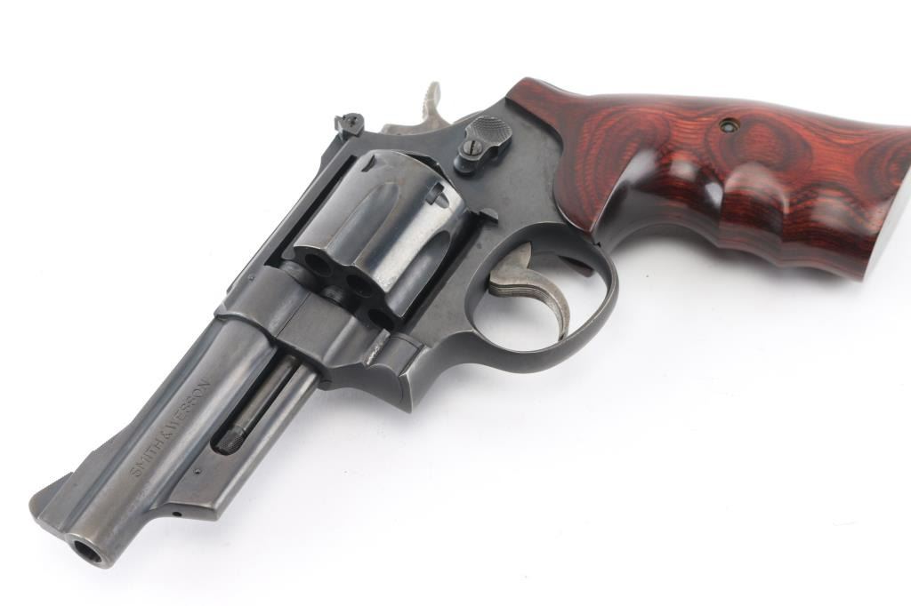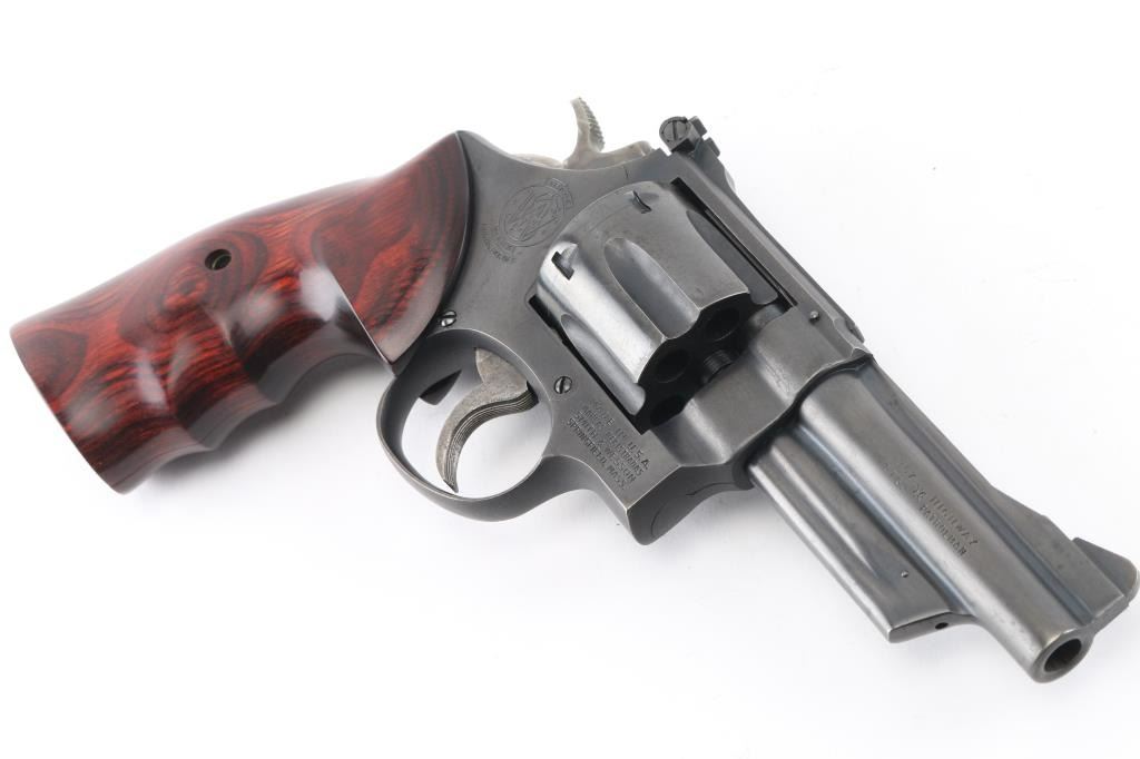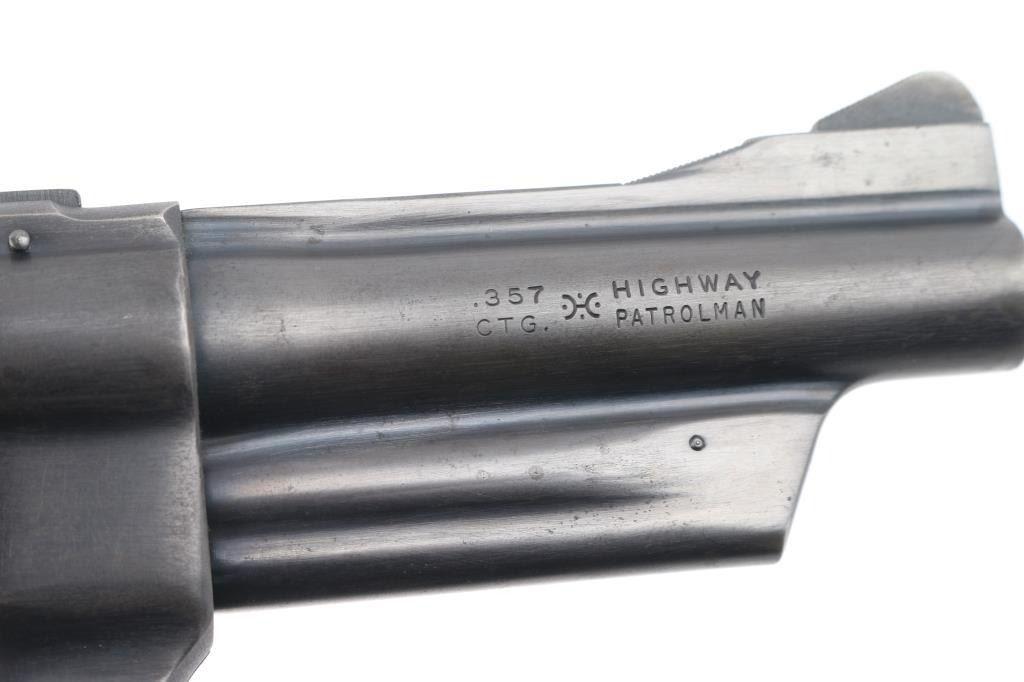'The Highway Patrolman" is a DA/SA revolver with pinned barrel & recessed cylinder for cartridge rims. Features service grade blued finish, very nice finger groove wood grips, 4" barrel, 3/4 length under lug, serrated raised ramp front sight, adjustable rear sight, serrated narrow trigger, knurled hammer spur, and fluted cylinder. Bore looks good. Metal finish shows signs of use and handling with a loss of finish in spots and at the muzzle. Small amount of surface rust at the muzzle on the left. Some fading of color. Grips look great. Condition is NRA Good+ *Modern Firearm*