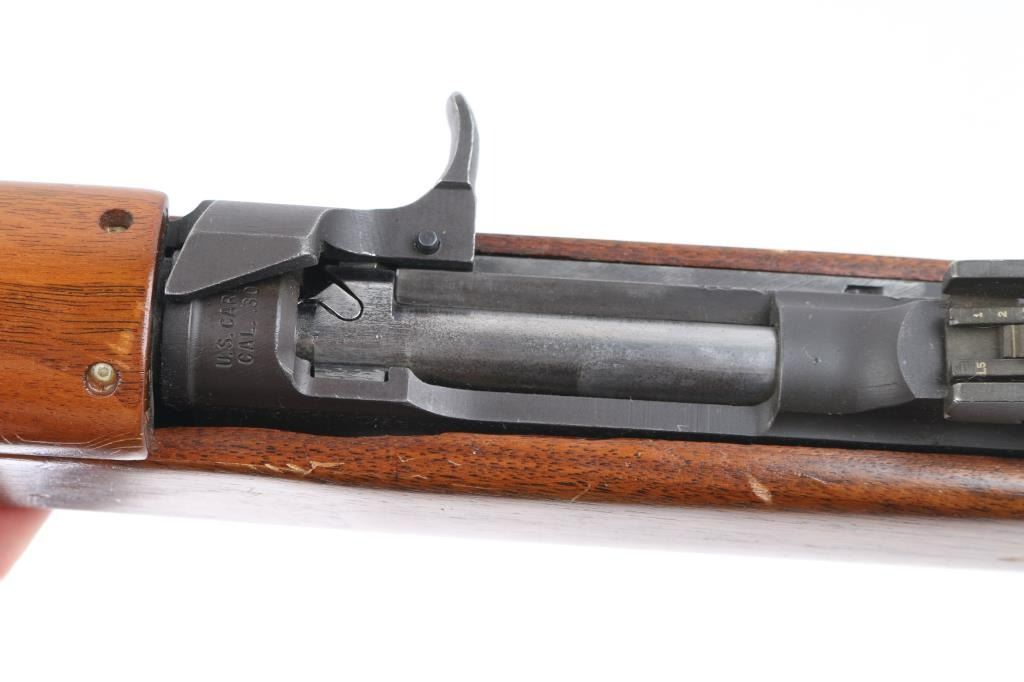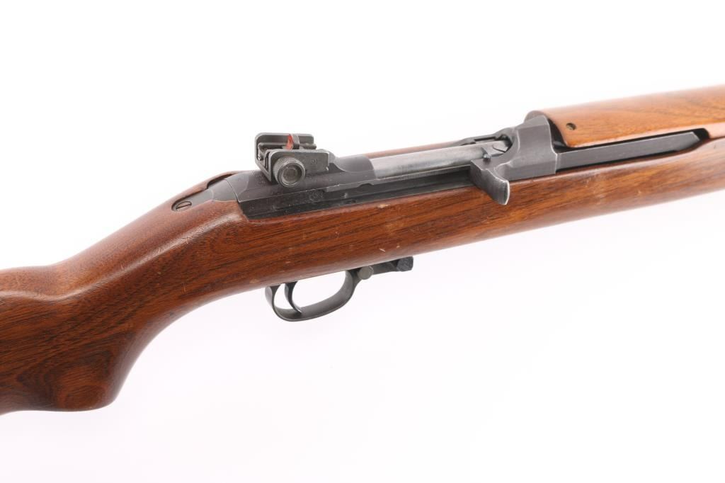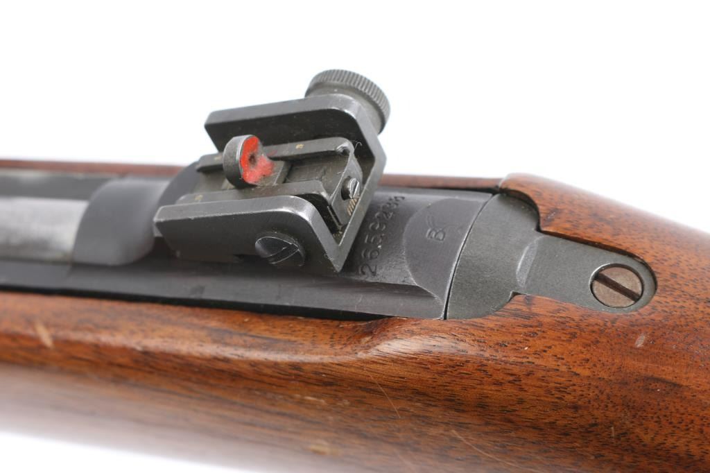US military semiautomatic rifle manufactured during WWII. Rebuilt / Refinished. Features blued barrel & band, parkerized finish on other parts, 18" barrel, protected blade front sight, adjustable rear peep sight with range slide, front sling swivel, rear sling slot, smooth wood stock with 2 rivet handguard, round top bolt, early push button manual safety, later style mag catch marked "M". Front band is wide, no bayonet lug, marked "MMQ". Bore is very good. Barrel is unmarked. Retains 85% finish, with edge losses & handling marks. Small pits visible under the refinish. Wood is very good condition, has been sanded & varnished, shows fair fit at buttplate, with scratches throughout. Handguard has no groove along top (either sanded off, or a commercial replacement part). No magazine provided. Condition is NRA Very Good (as refinished) *** C&R Firearm ***