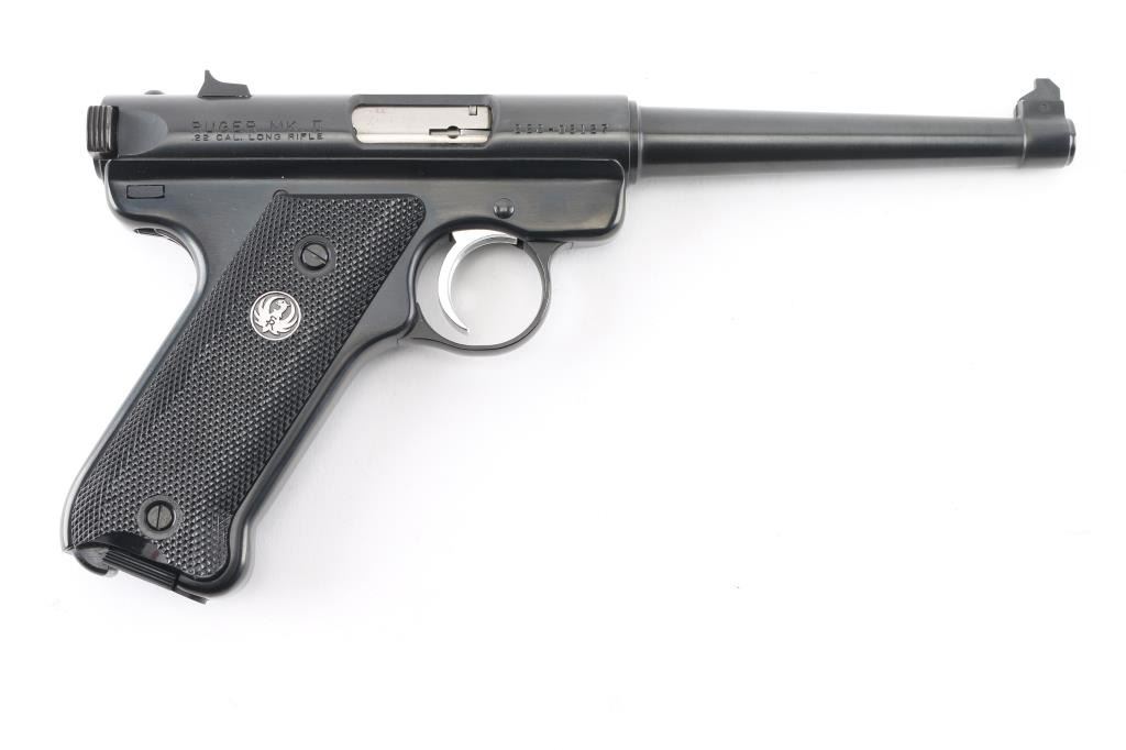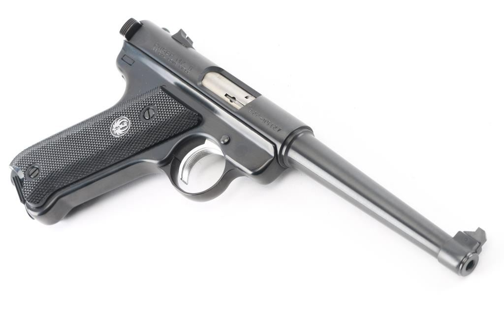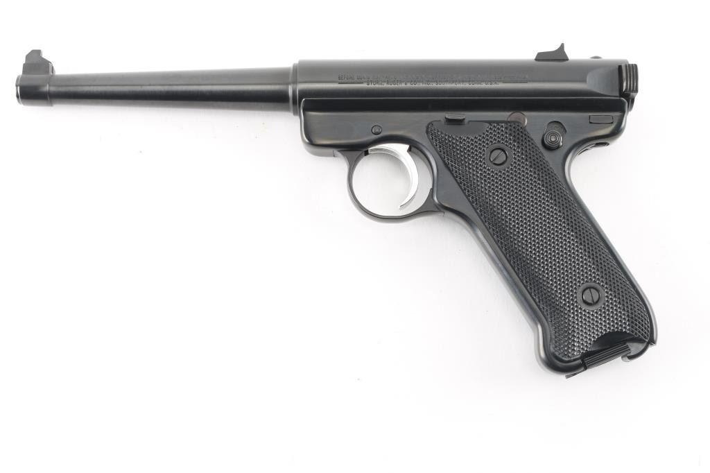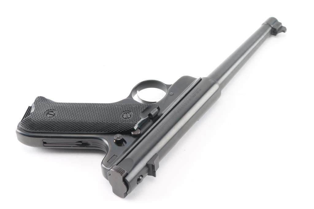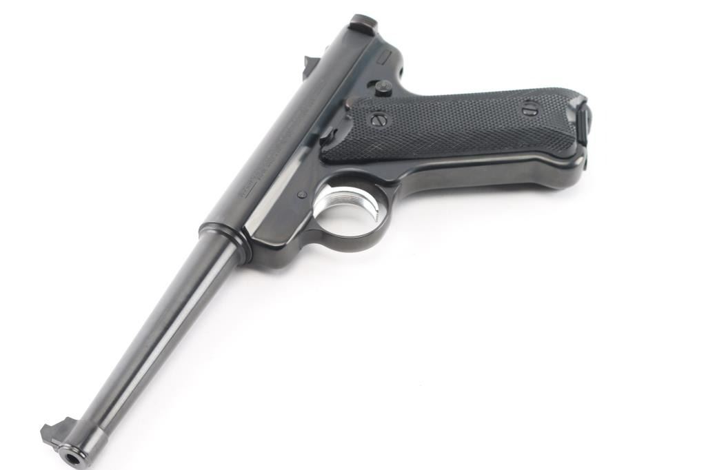 American made semi-auto pistol chambered for .22 LR ammunition, circa 1998. It features a deep blued (Black) finish, 6" barrel, black plastic "checkered" grips with silver Ruger medallions, "silver" tone serrated trigger, fixed sights, mag release on bottom of mag well, and one 10 round magazine. Bore looks good but needs cleaned. Metal finish looks very good. Grips are fine. Condition is NRA Very Good+. *Modern Firearm*