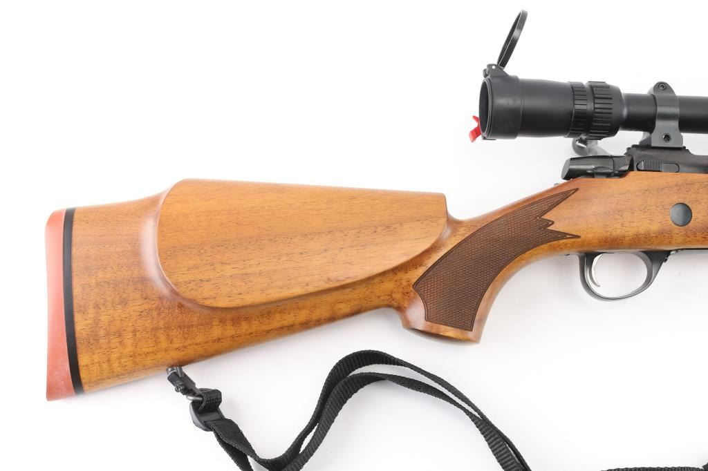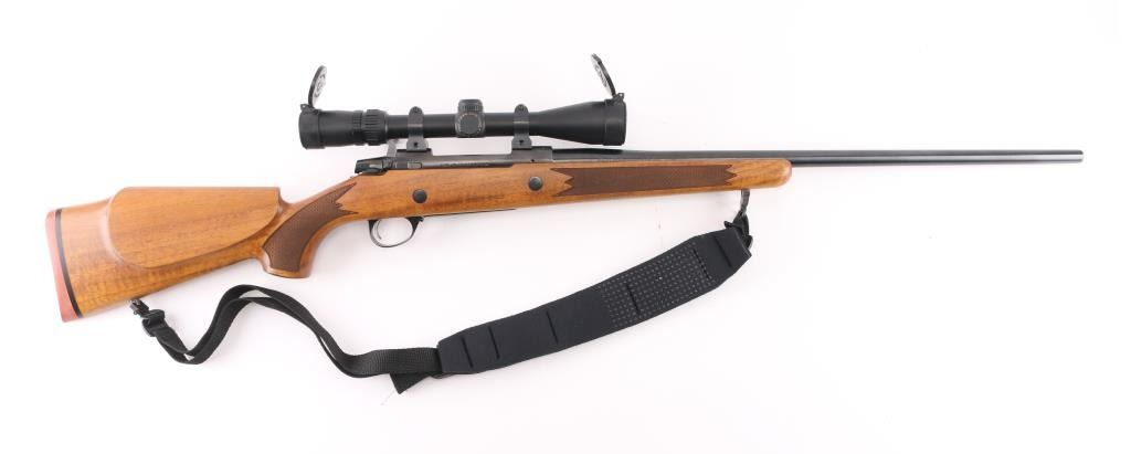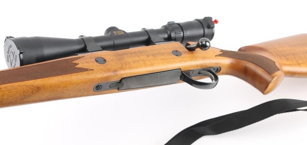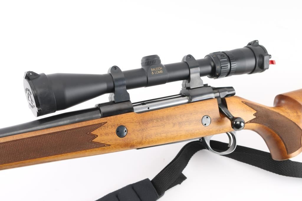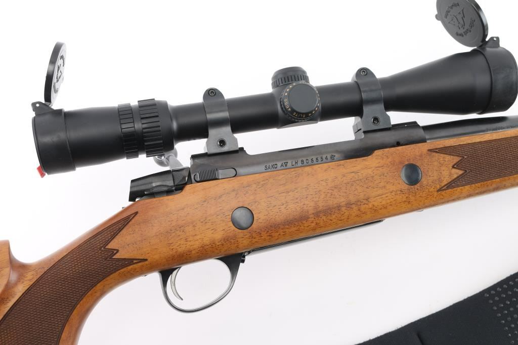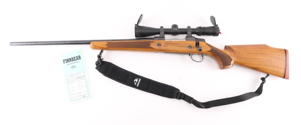 Left Handed Finnish bolt action rifle, imported by Stoeger, NJ. Features blued finish, wood Monte Carlo stock with left handed cheek piece, solid rubber recoil pad, checkered panels at forend & curved wrist, sling studs, 24" barrel, no sights, hinged floorplate, manual safety, flat top receiver with dovetails. Mounts a very good condition Bausch & Lomb Elite 4000 1.5-6x scope with duplex crosshairs, pop-open caps. Bore is very good bright condition. Retains 95% dark bluing with few signs of handling. Stock is excellent condition with few blemishes. Includes padded black nylon sling, factory paperwork. Condition is NRA Excellent *** Modern Firearm ***