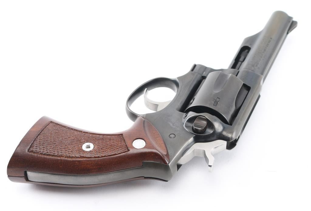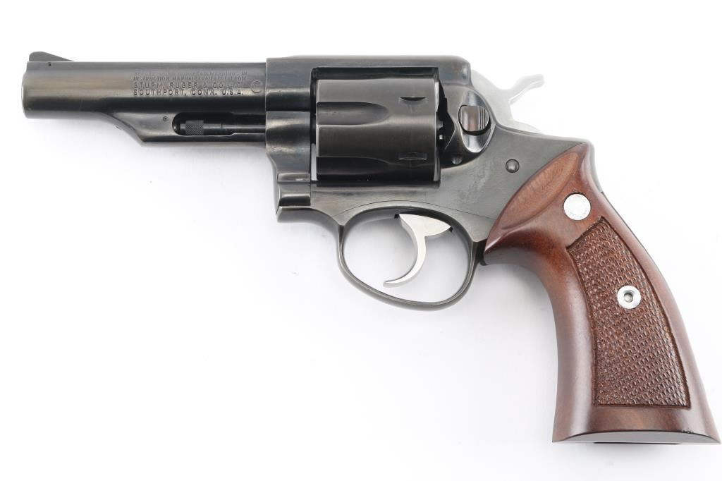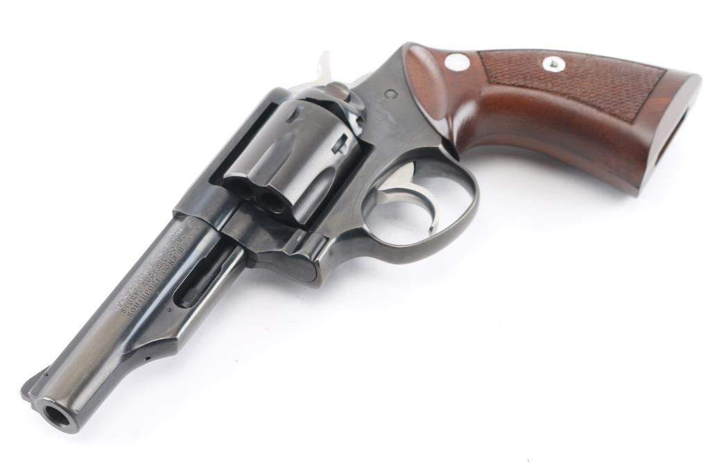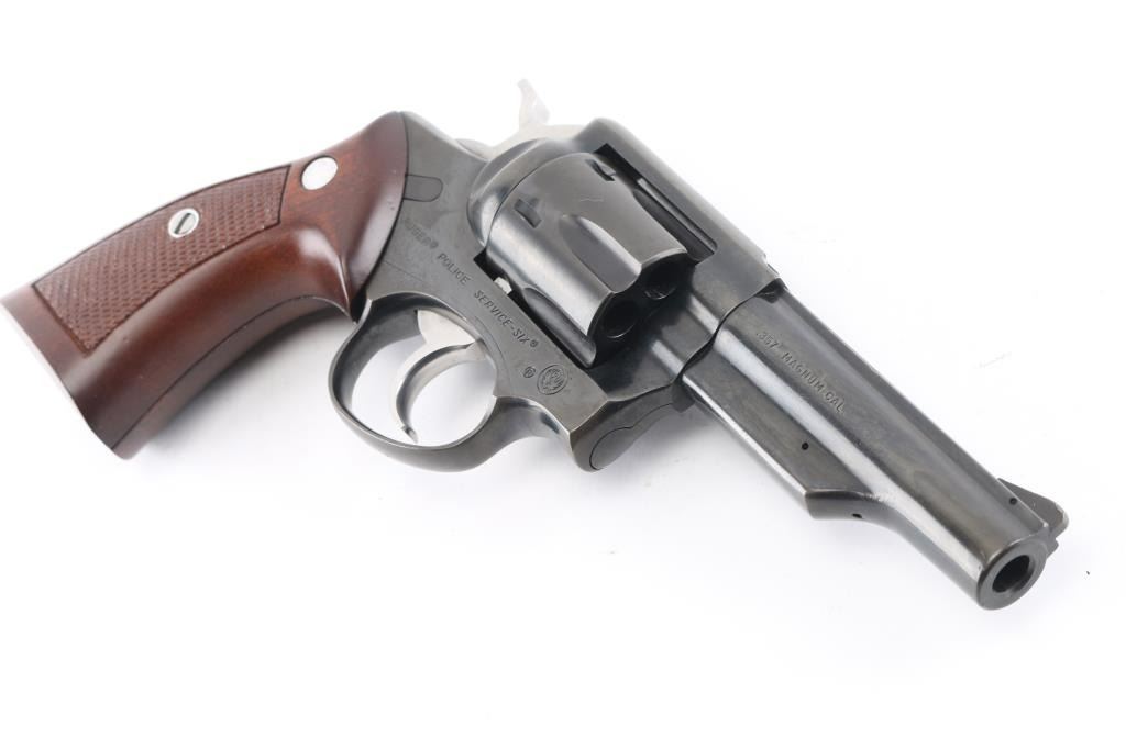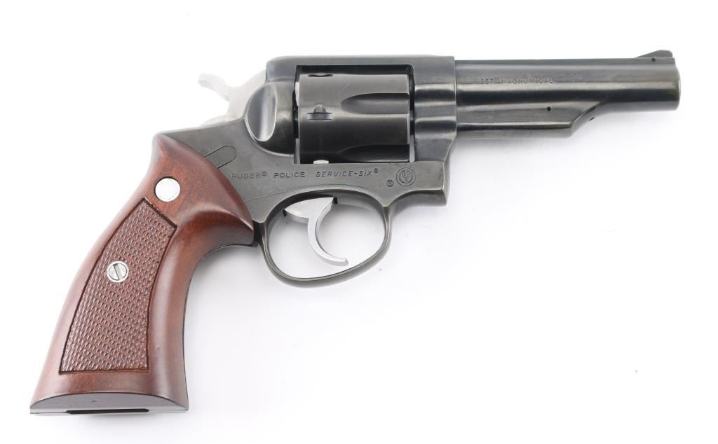 Made in America, the "Police Service-Six" is a 6 shot revolver chambered for .357 Magnum ammunition, circa 1986. It features a blued finish, fluted cylinder, 4"barrel, half underlug, smooth trigger, knurled hammer spur, ramp front sight, notch rear sight, and center checkered wood grips with Ruger medallions. Bore and cylinders look good but dusty. Metal finish looks good but does show signs of wear and loss of finish in areas on both the barrel and frame. Wood grips are fine. Condition is NRA Good. *Modern Firearm*