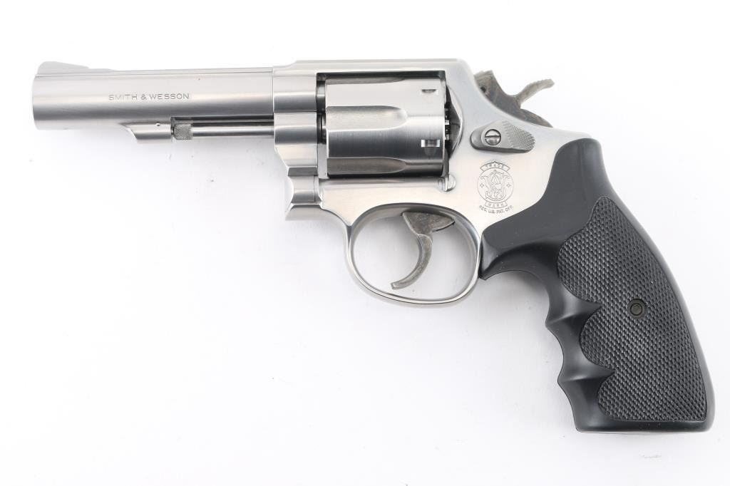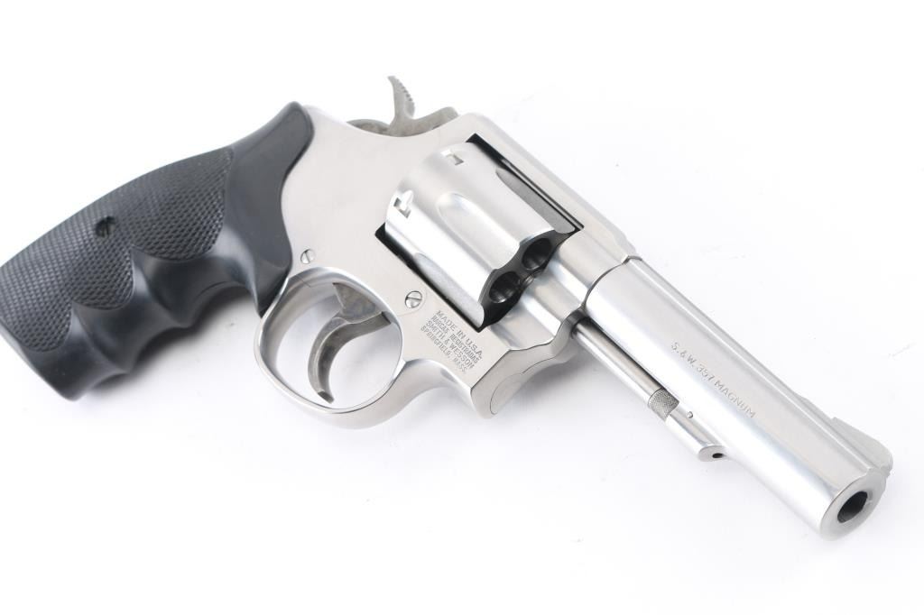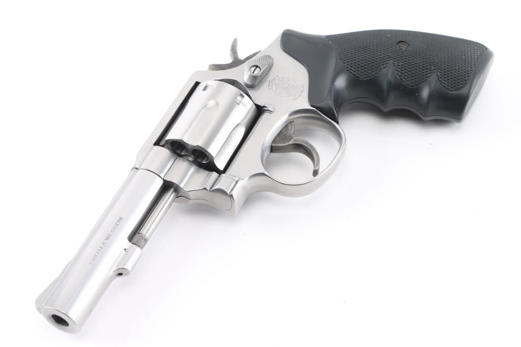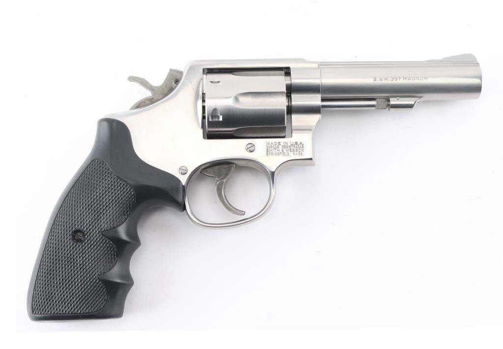 American made 6 shot DA/SA revolver chambered for .357 Magnum cartridges. Built on a three screw stainless steel square butt K service frame with a 4" heavy barrel, smooth trigger,knurled hammer spur, serrated ramp front sight, notch rear sight, non-shrouded ejector rod, fluted cylinder, and black rubber "checkered" finger groove grips. Bore and cylinders look great, dusty. Metal finish looks very good. Grips are fine. Condition is NRA Very Good+ *Modern Firearm*