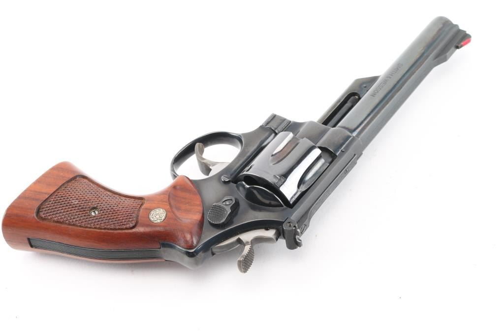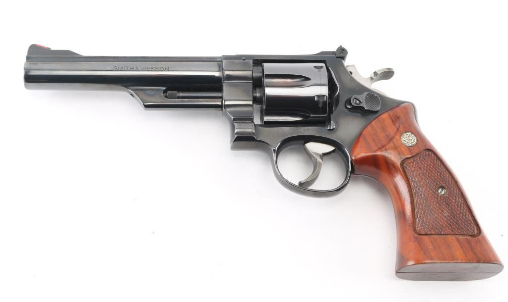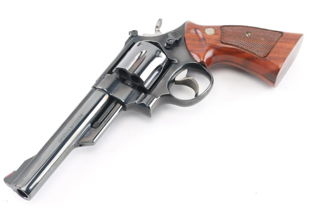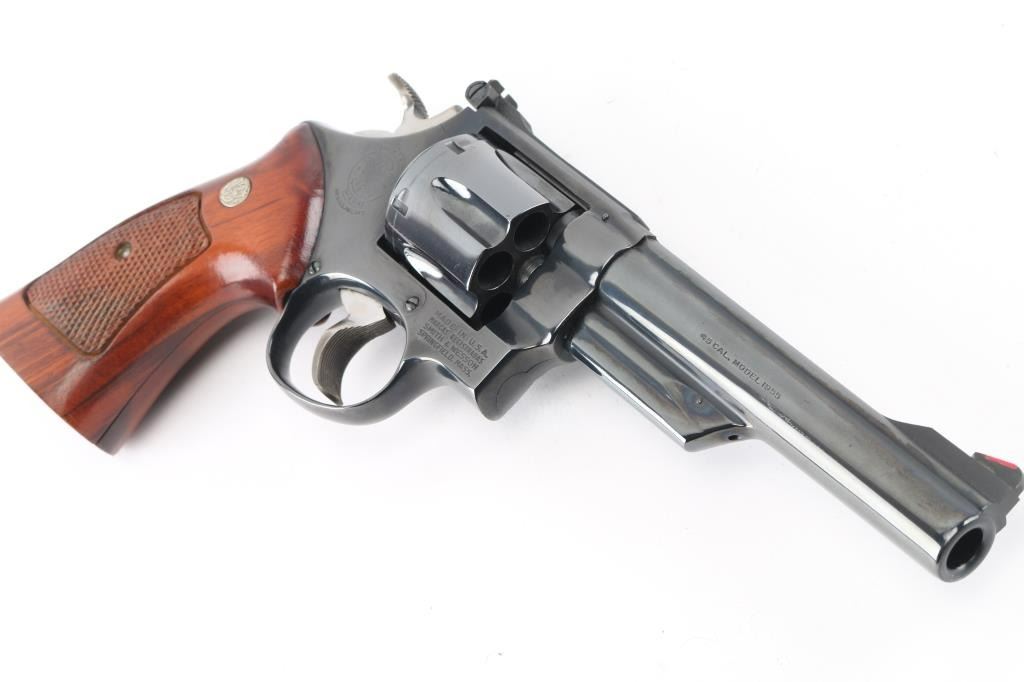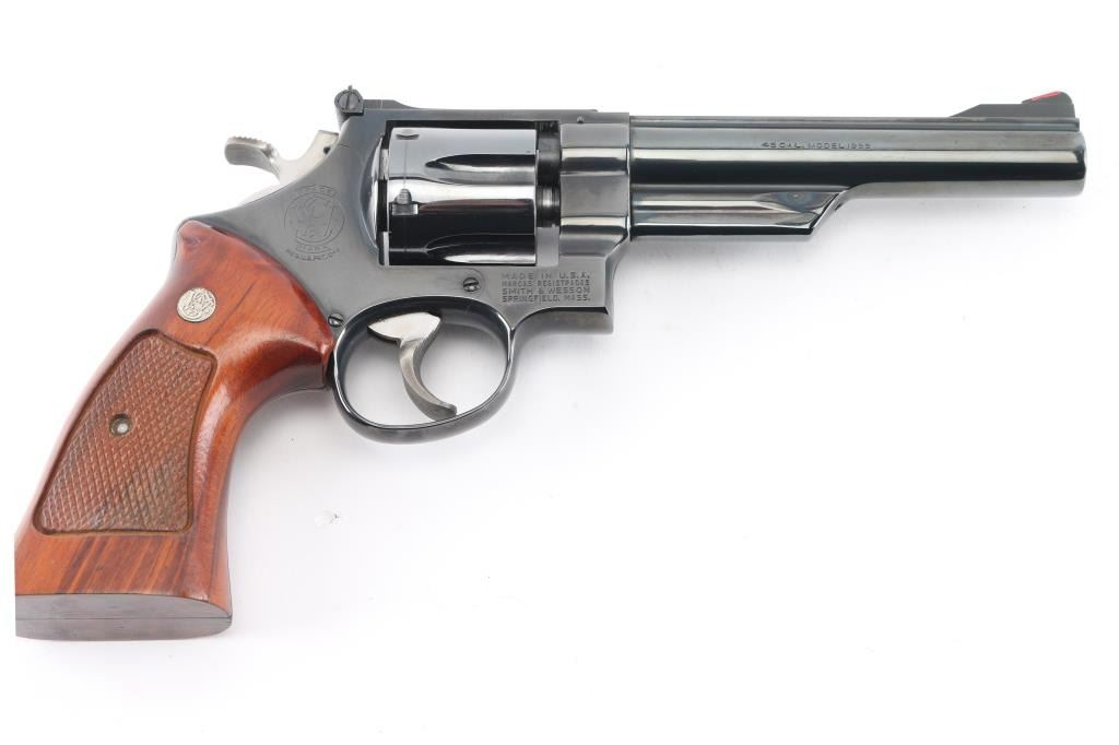 The 1955 Model .45 Target Heavy Barrel' Large frame double action revolver chambered in .45 Automatic. Features a blued finish, pinned 6" heavy barrel with serrated wide sighting rib, raised ramp front sight with red insert, adjustable rear sight, fluted six-shot cylinder, shrouded ejector rod, serrated .265" trigger, .500" target hammer, three screw square butt N target frame and two-piece checkered walnut target style stocks with silver S&W medallions. Revolver exhibits approximately 97% of it's original finish with some very minor scratches, a slight drag line on the cylinder. Action is smooth with very good lock-up, the bore is pristine and the wood grips are excellent. NRA Condition-Excellent. Modern Firearm.