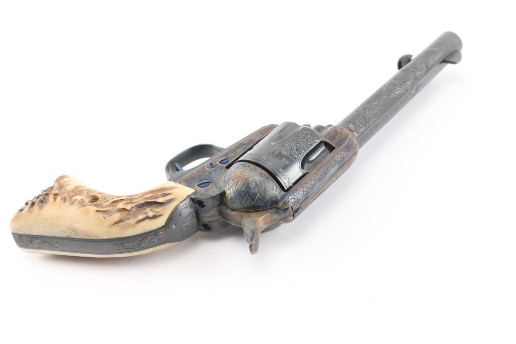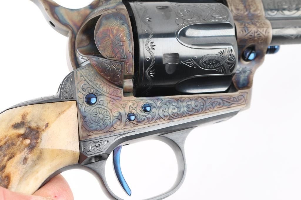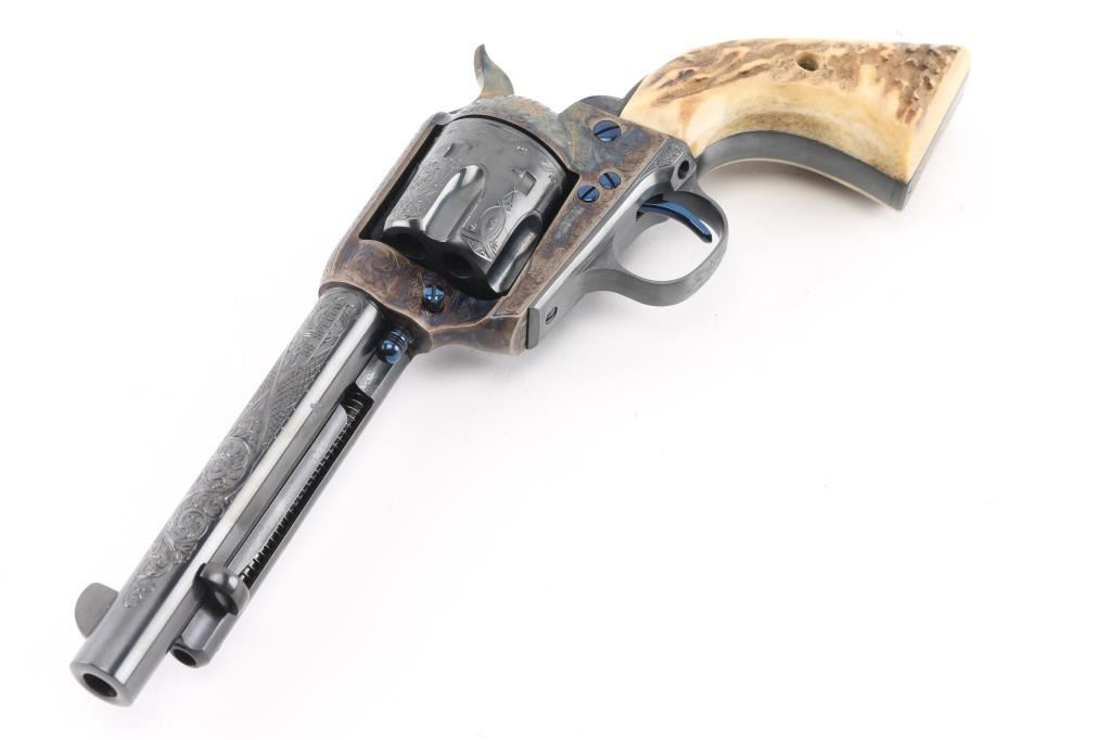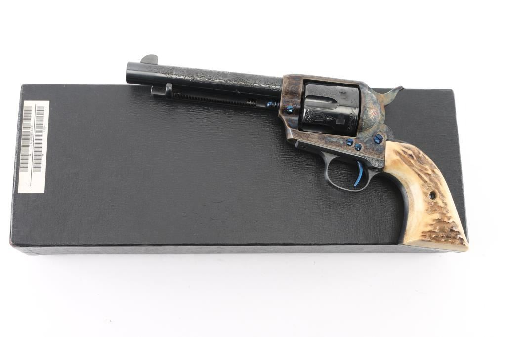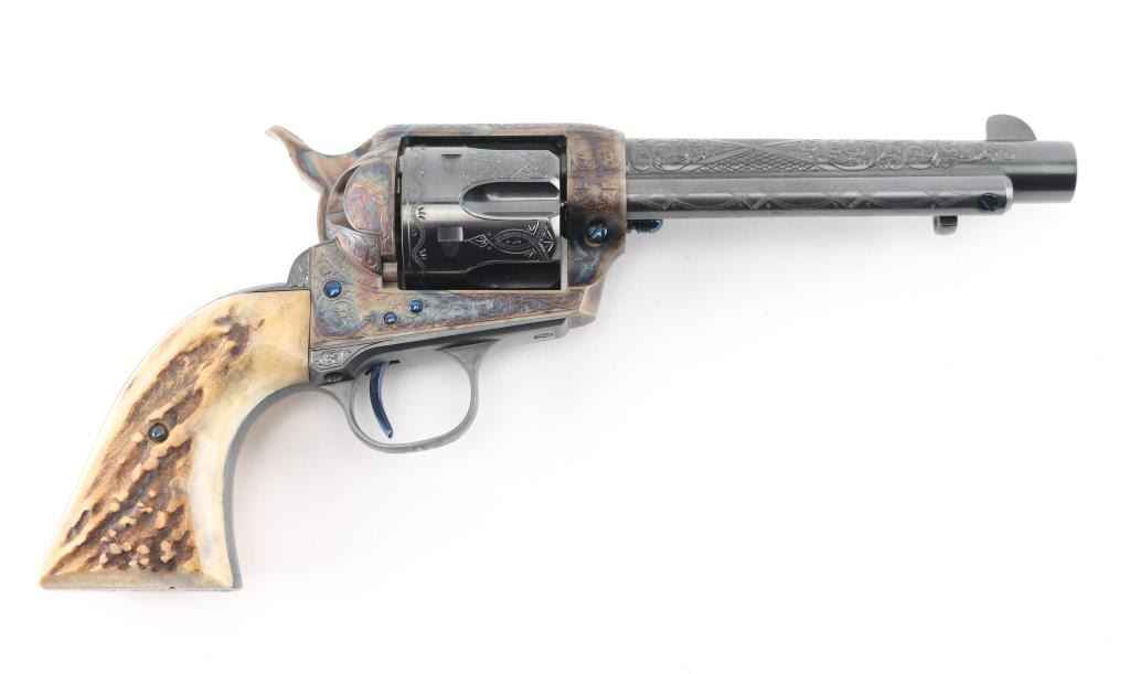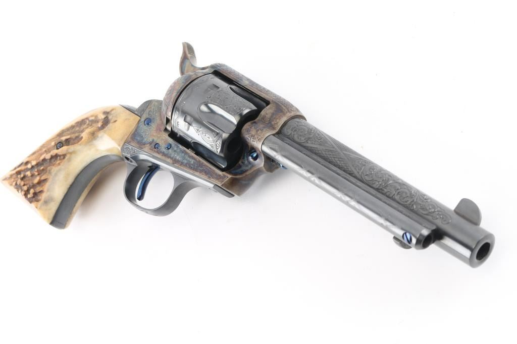 Exceptional single-action revolver produced by United States Fire Arms Mfg. Co. based out of The Colt Armory complex in Hartford, Connecticut. The company is renowned for their superb quality and finish but went out of business in 2011. This revolver features blue/case finish, fully floral scroll engraved, nitre blue screws, trigger, and cylinder pin, 5.5" barrel, blade front sight, 'v' notched rear sight, fluted six-shot cylinder, and smooth two piece Sambar stag grips. Barrel is marked with the two line USFA address on the top. Bore and charge holes are pristine. Retains approx 99% of it's original finish showing hardly any signs of handling. Case colors on the frame and hammer are excellent with fiery colors. Grips are excellent. Action is smooth with tight lock up. Includes black cardboard factory box with paperwork, factory cloth bag. A beautiful revolver. Condition is NRA Excellent - like new Modern Firearm.