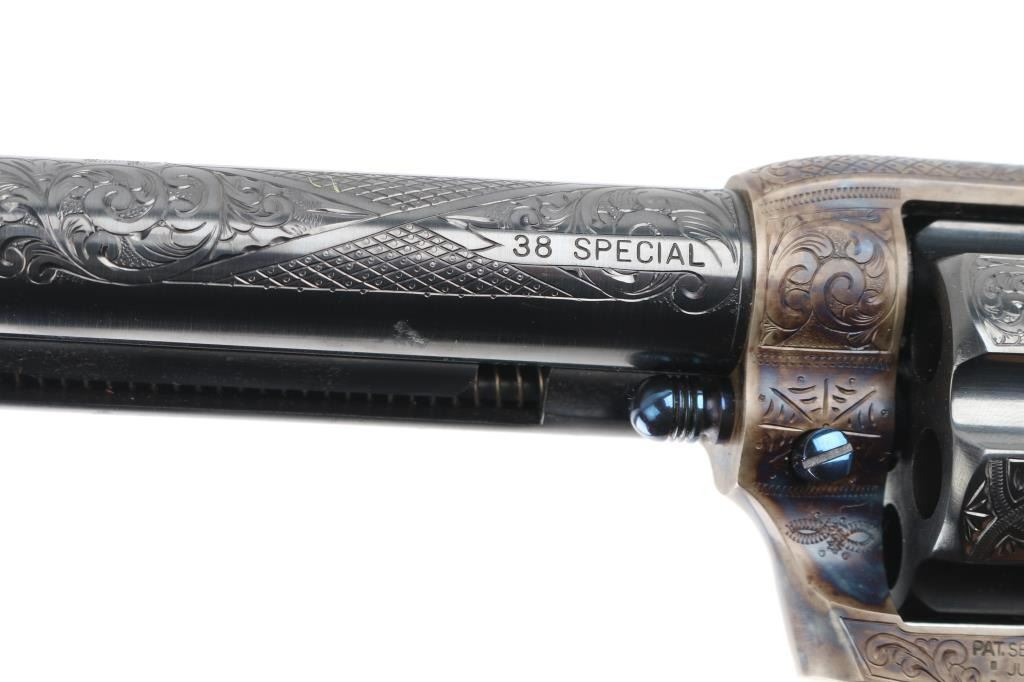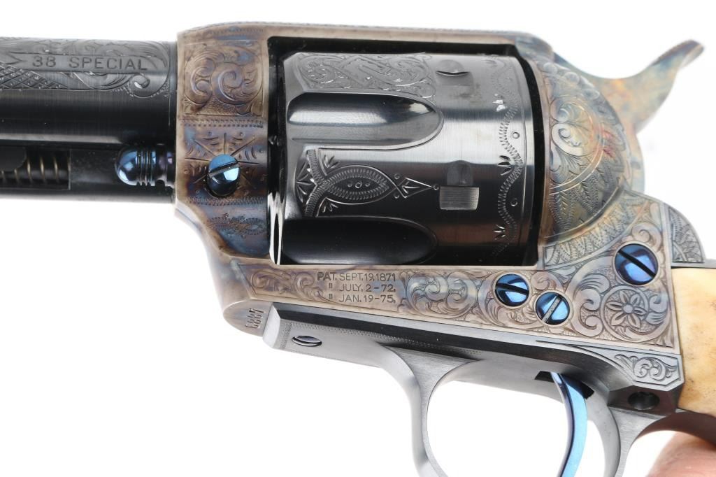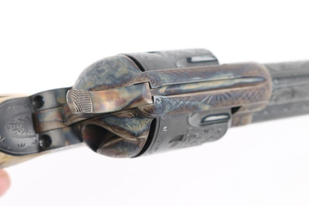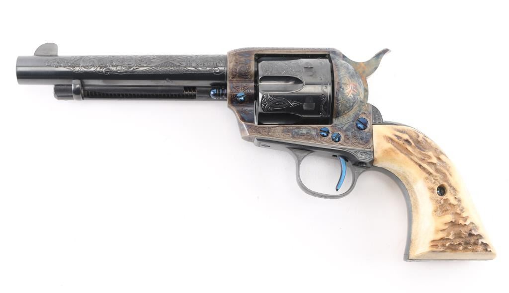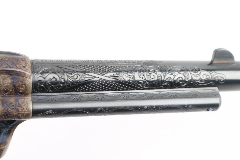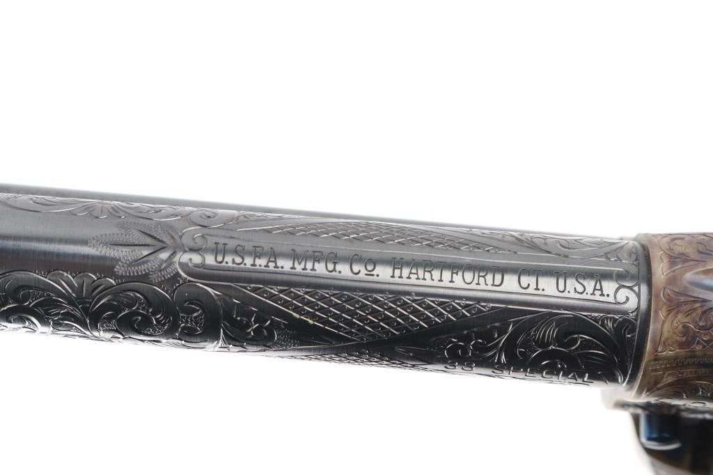 Exceptional single-action revolver produced by United States Fire Arms Mfg. Co. based out of The Colt Armory complex in Hartford, Connecticut. The company is renowned for their superb quality and finish but went out of business in 2011. This revolver features blue/case finish, fully floral scroll engraved, nitre blue screws, trigger, and cylinder pin, 5.5" barrel, blade front sight, 'v' notched rear sight, fluted six-shot cylinder, and smooth two piece Sambar stag grips. Barrel is marked with the two line USFA address on the top. Bore and charge holes are pristine. Retains approx 99% of it's original finish showing hardly any signs of handling. Case colors on the frame and hammer are excellent with fiery colors. Grips are excellent. Action is smooth with tight lock up. Includes black cardboard factory box with paperwork, factory cloth bag. A beautiful revolver. Condition is NRA Excellent - like new Modern Firearm.