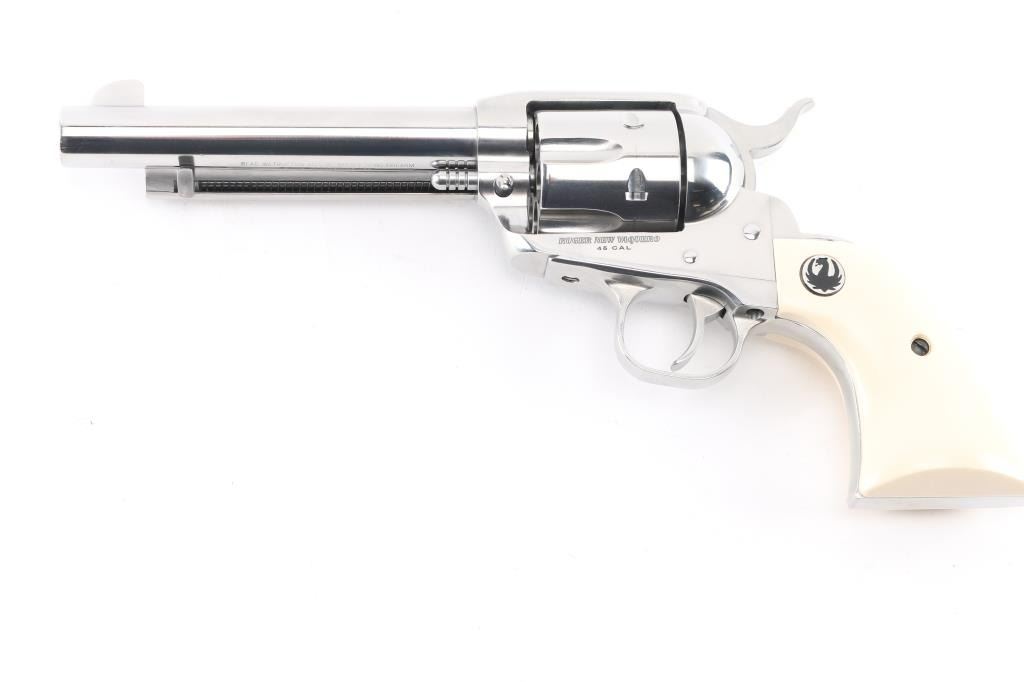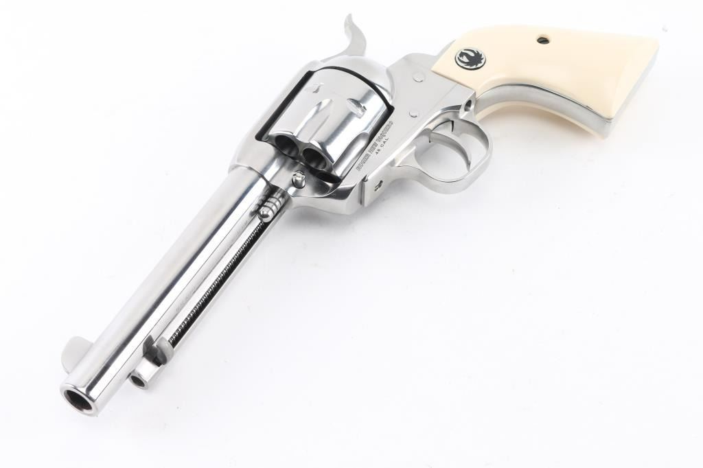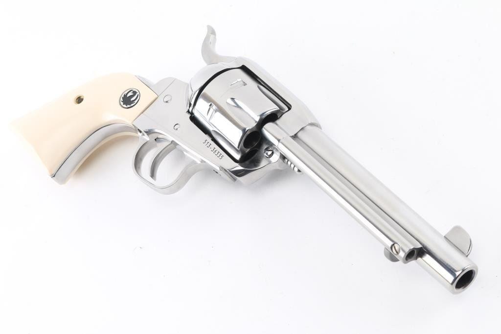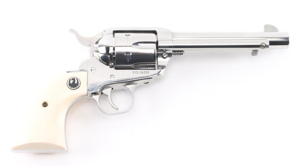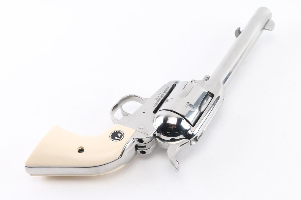American made single action, 6 shot, revolver chambered for .45 Colt ammunition circa 2019. It features a 5.5" stainless steel barrel, frame and fluted cylinder. It has a blade front sight, integral rear sight, smooth stainless trigger and hammer with serrated hammer spur. It has two piece simulated ivory grips with Ruger medallions. The Metal finish looks great with a very faint drag line on the cylinder. Grips look great. Bore is pristine action is crisp/tight. Condition is NRA Excellent Modern Firearm.