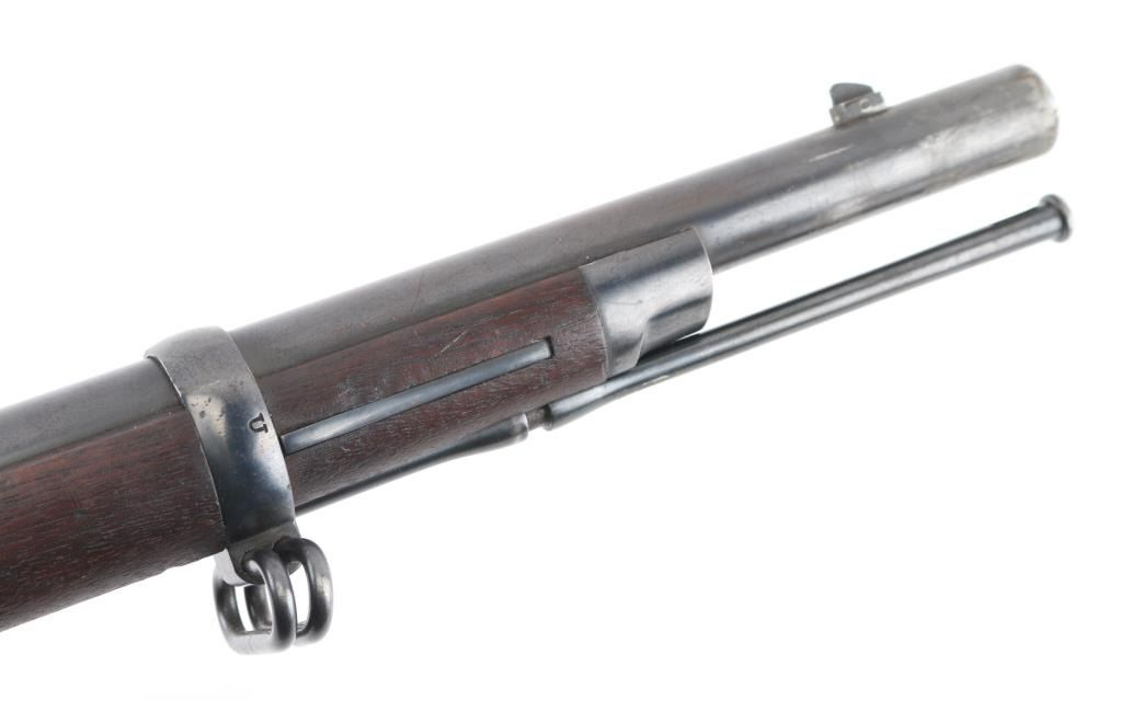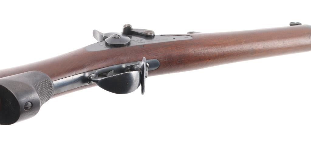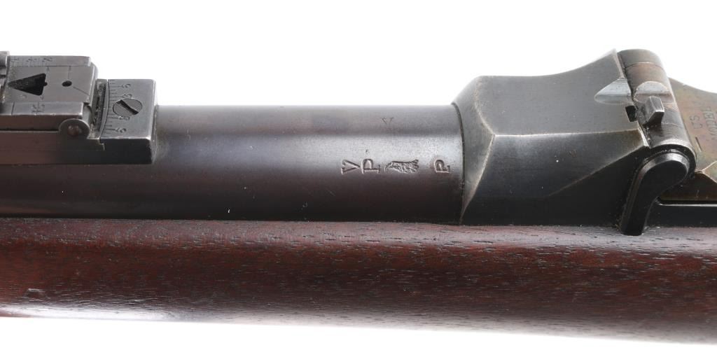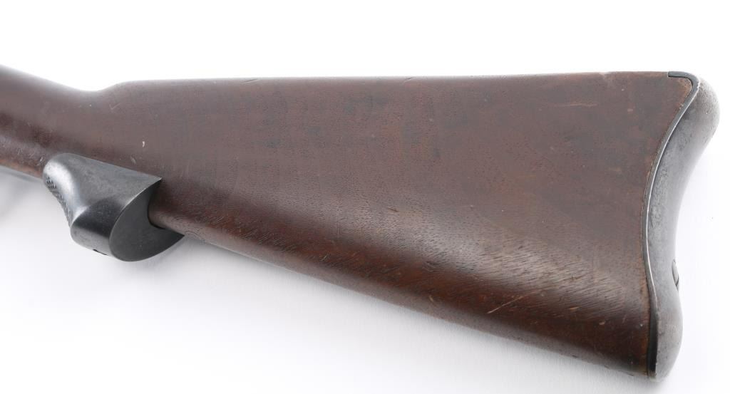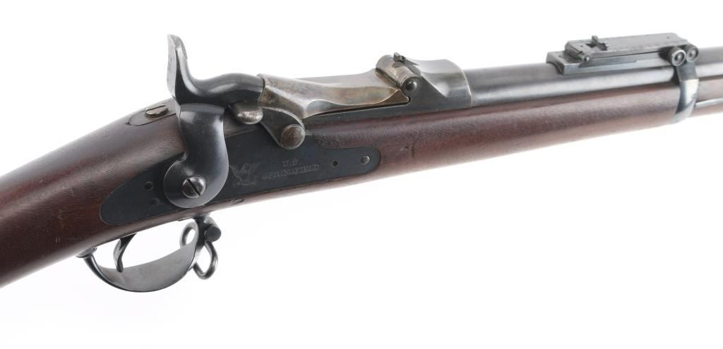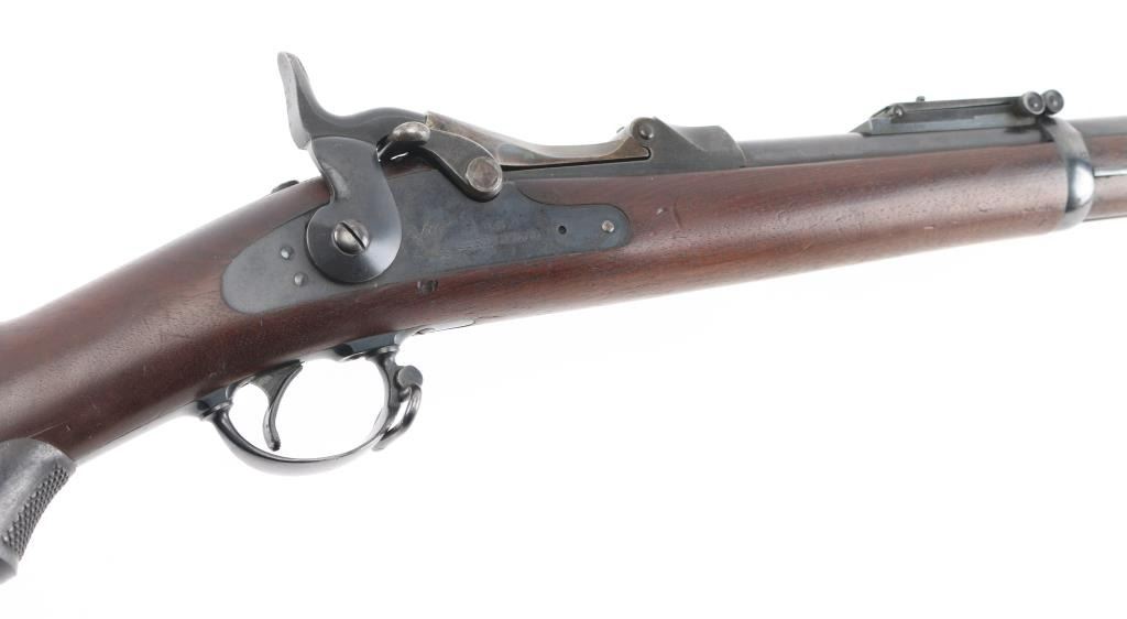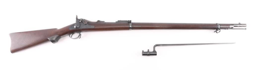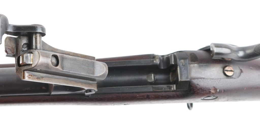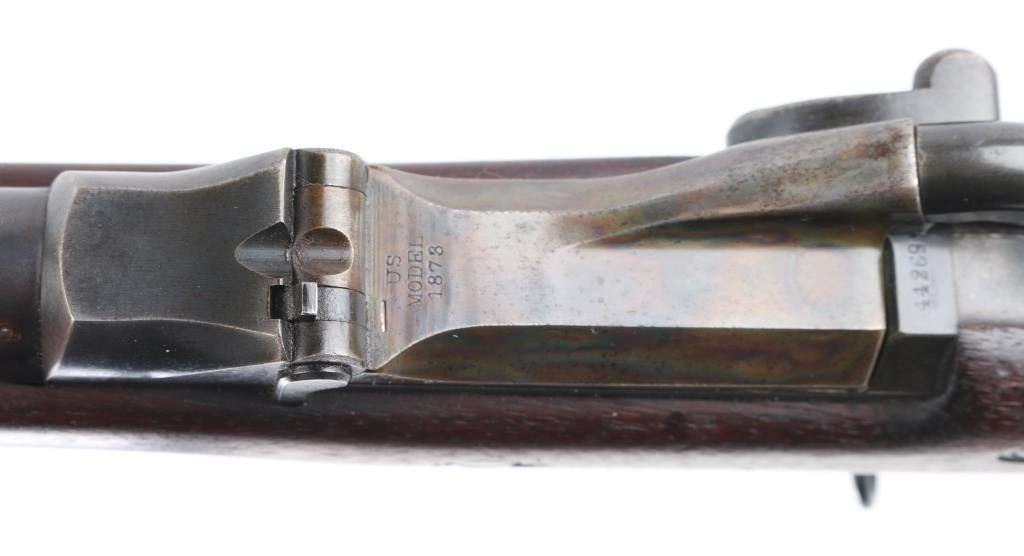SN: 442697 US military single shot rifle manufactured circa 1887. Features 29.5" barrel, blade front sight, rear sight with elevator ladder, cleaning rod, sling swivels, stacking swivel, external hammer, straight gripped walnut stock with added metal hand stop, curved steel buttplate. Bore is very good condition, bright with little frosting. Retains 85% finish, some fading and losses, with light patina across lock plate, vivid case colors on 1878 dated breech block. Loss of finish at muzzle area from bayonet mounting. Barrel marked over chamber "V / P / (eagle head)", "A", "P". Cartouche at stock wrist shows 1889 date, last two digits have been deepened. Buttplate marked with small "W" over an engraved "US" (vertical portions of letters show double lines with engraved shadow lines between) on forward top edge. Observed markings mostly appear crisp with even depth. Edges on metal retain original profiles and sharp corners. Wood is very good with dents & other handling marks. Includes a very good overall condition bayonet (reblued with patina). Condition is NRA Fine *** Antique Firearm ***