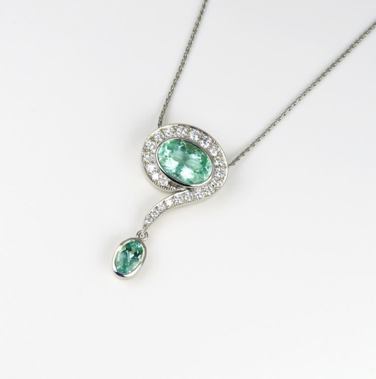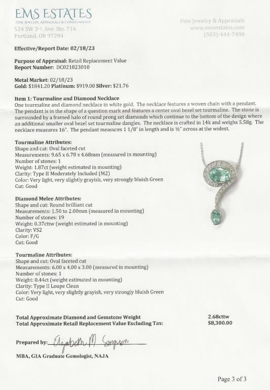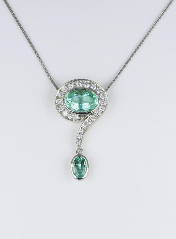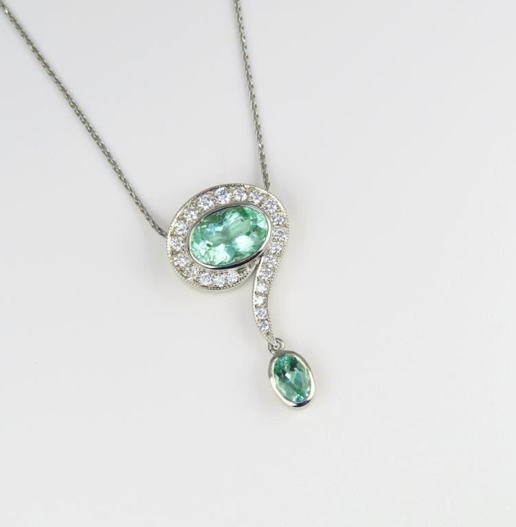 and Diamond Pendant featuring unique question mark design set with 2 stunning oval cut rare Blue Green Tourmalines weighing approx. 2.31 carats total accented 19 round brilliant cut Diamonds weighing approx. 0.37 carats with F-G colors and VS clarity set in 18 karat white gold custom crafted setting. Full Retail Appraisal - $8,300.00