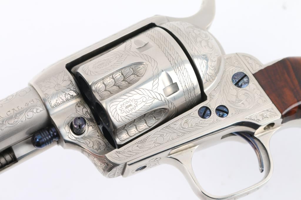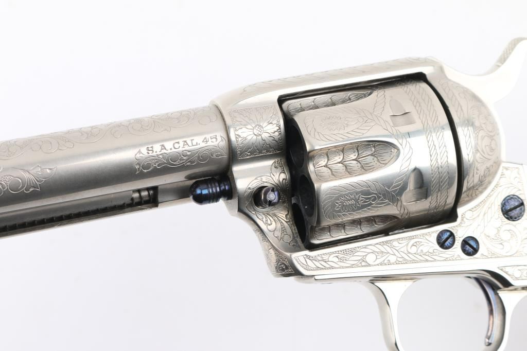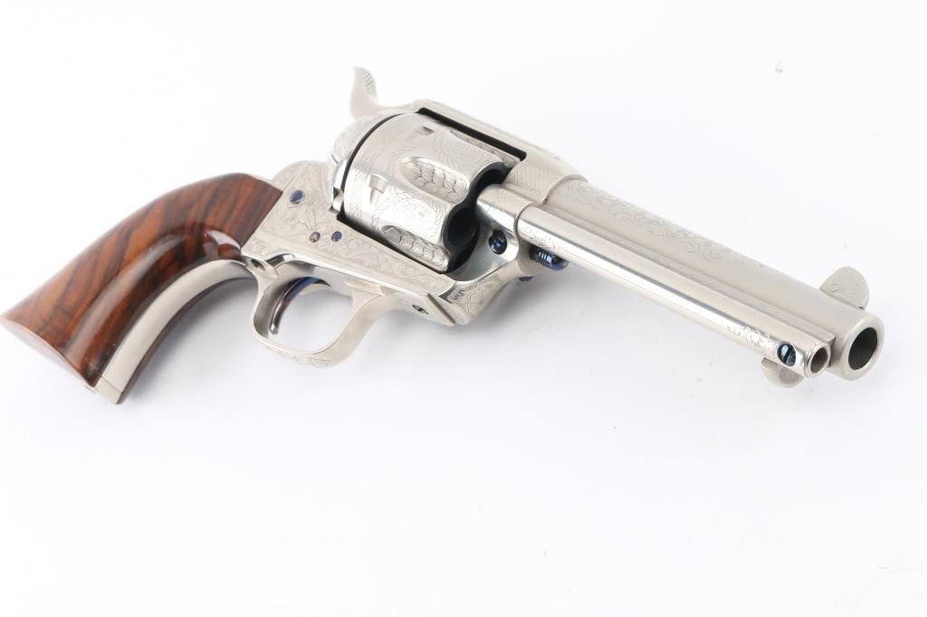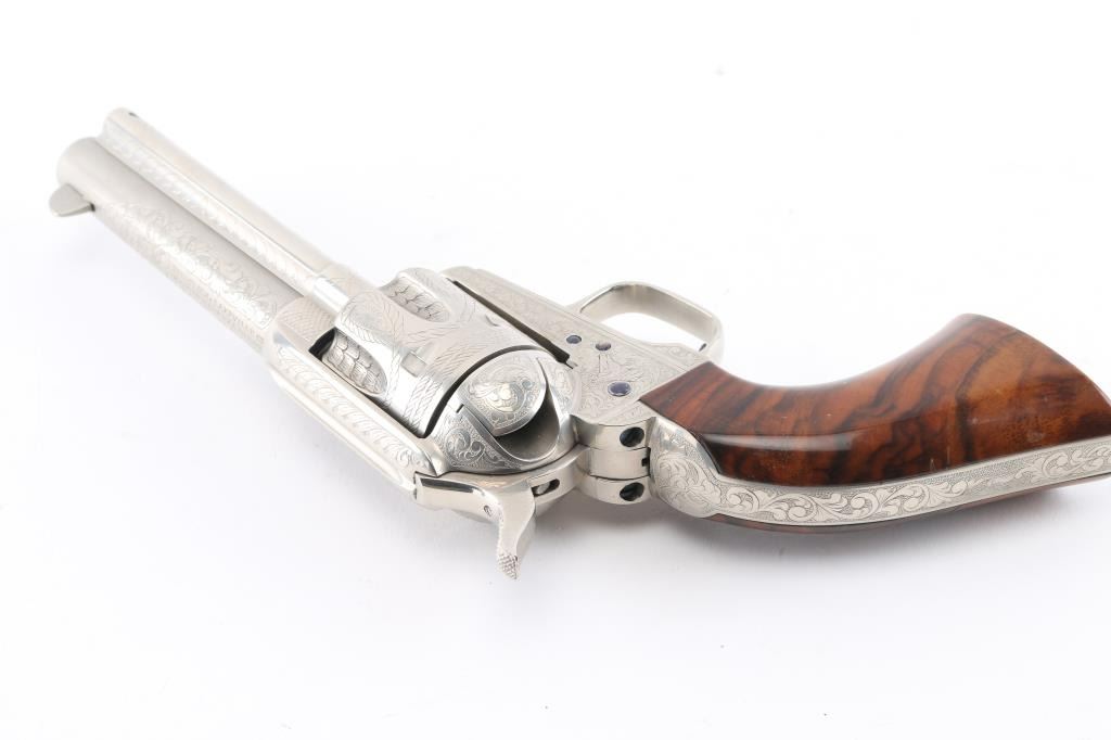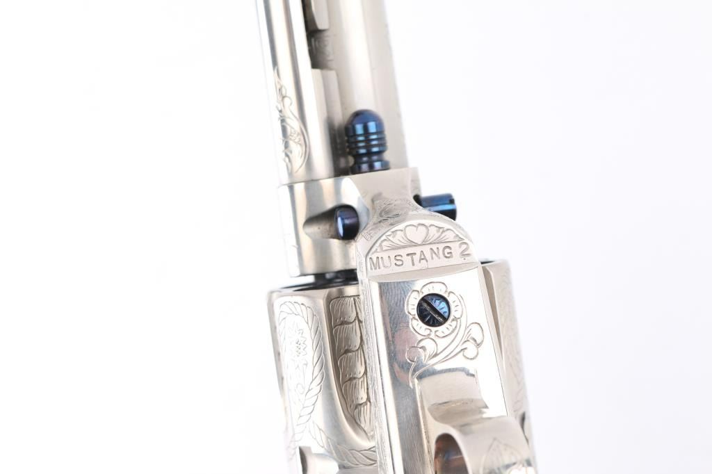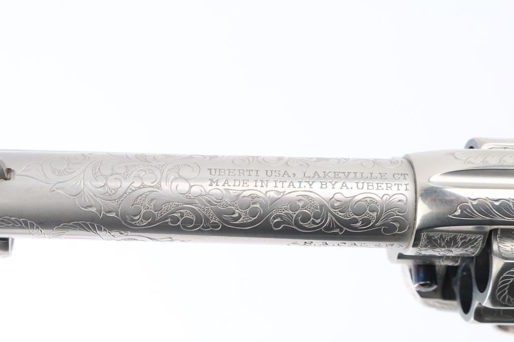 Fine Italian made single action revolver chambered in .45 LC. Imported by Uberti U.S.A. Features a nickel plated finish with nitre blued screws, trigger, and cylinder pin, screws are also engraved. Full floral scroll engraved. 4 3/4" barrel, ejector rod, blade front sight, square notched rear sight, fluted six-shot cylinder, checkered hammer spur and one-piece smooth grips. Barrel is marked Uberti USA, Lakeville CT, the importer before Beretta bought Uberti, so Uberti could provide no information on the special serial number range. ( The same revolver with SN Mustang2. is in this auction). Believe these were special order. Revolver exhibits excellent finish with no wear observed. Action is crisp, bore is excellent and the grips are fine. Condition is NRA excellent Modern Firearm.