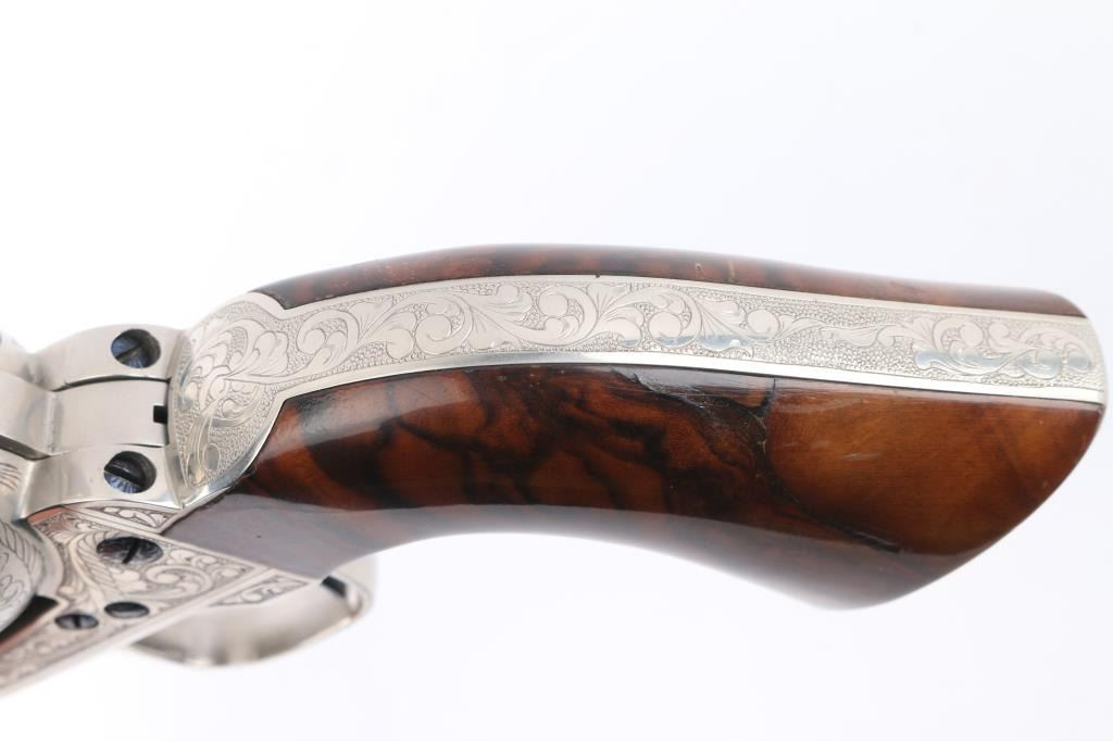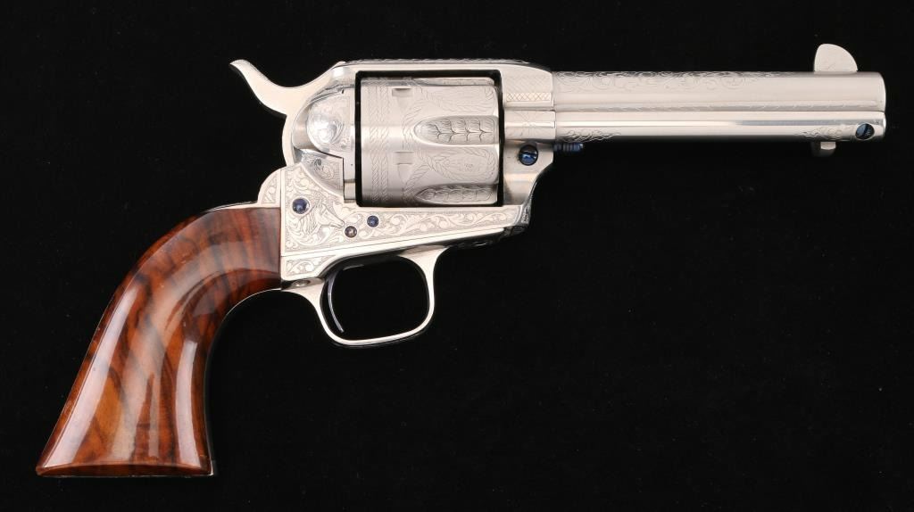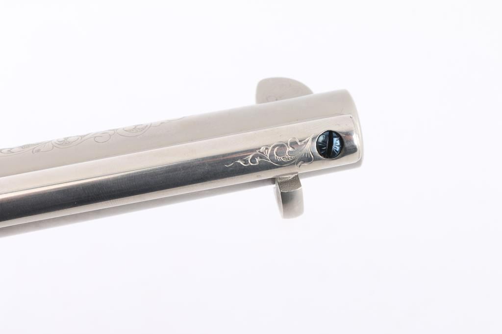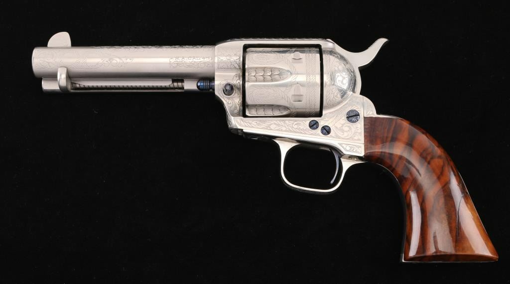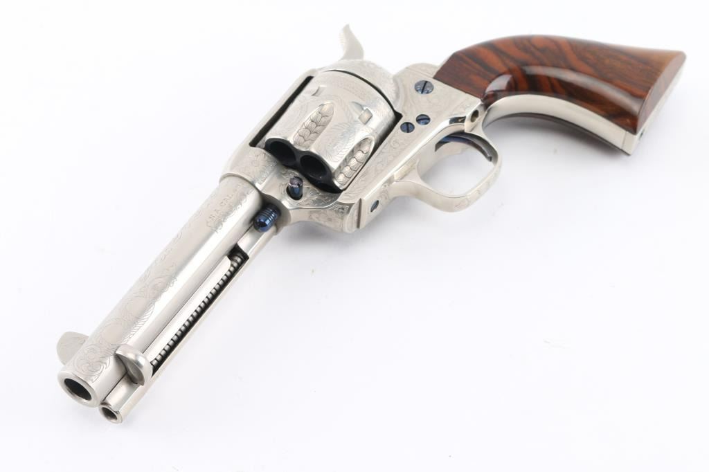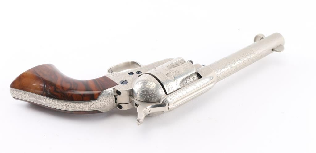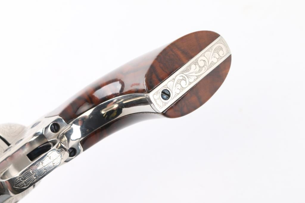 Fine Italian made single action revolver chambered in .45 LC. Imported by Uberti U.S.A. Features a nickel plated finish with nitre blued screws, trigger, and cylinder pin, screws are also engraved. Full floral scroll engraved. 4 3/4" barrel, ejector rod, blade front sight, square notched rear sight, fluted six-shot cylinder, checkered hammer spur and one-piece smooth grips. Barrel is marked Uberti USA, Lakeville CT, the importer before Beretta bought Uberti, so Uberti could provide no information on the special serial number range. ( The same revolver with SN Mustang2. is in this auction). Believe these were special order. Revolver exhibits excellent finish with no wear observed. Action is crisp, bore is excellent and the grips are fine. Condition is NRA excellent Modern Firearm.