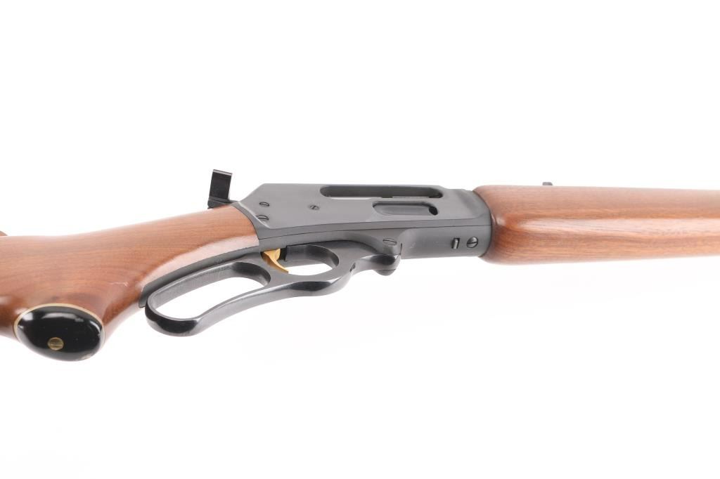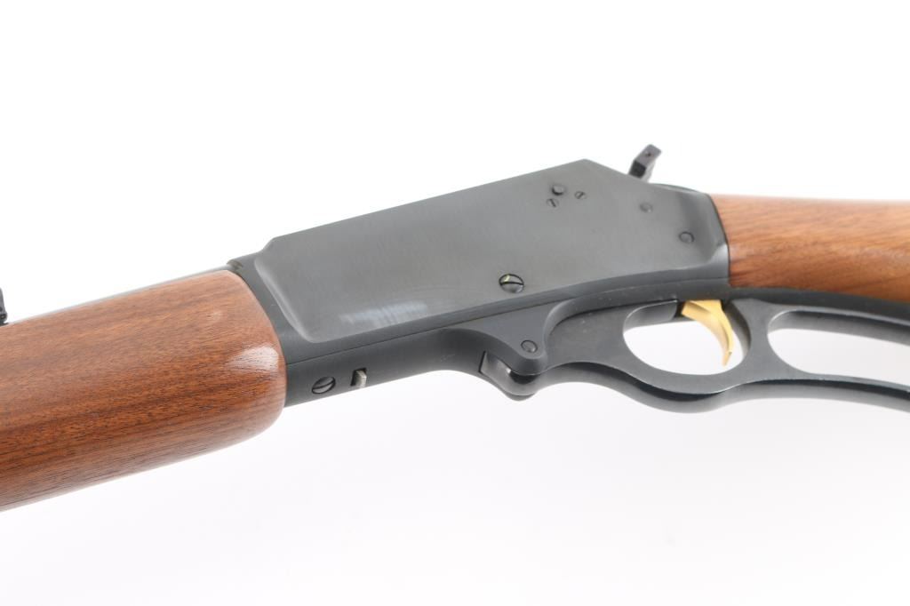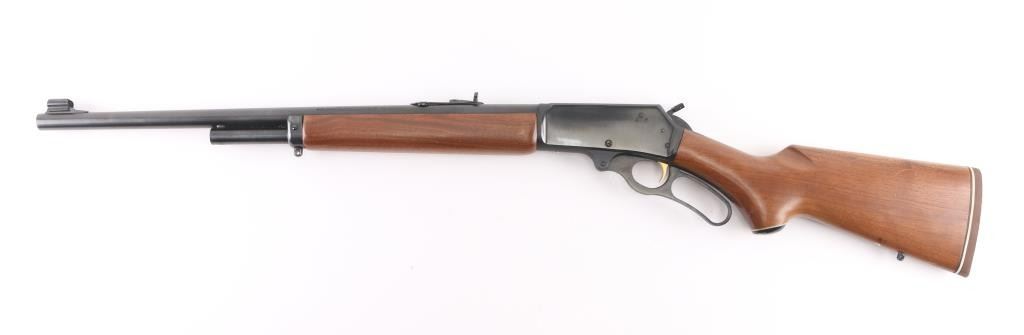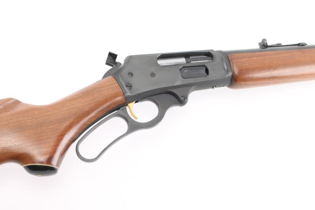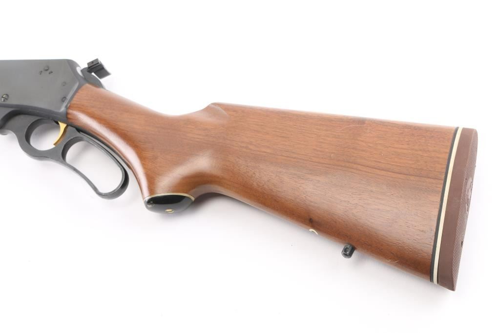 "JM" marked barrel. Lever action rifle features blued finish, 22" barrel, hooded blade front sight, folding adjustable rear sporting sight, 2/3 length magazine tube, pushbutton safety, sling studs. Two piece smooth walnut stocks with curved wrist, brown rubber Marlin butt pad, black plastic grip cap, white spacers. Bore is pristine. Retains 98% blue with handling marks. Wood is excellent. Condition is NRA Excellent *** Modern Firearm ***