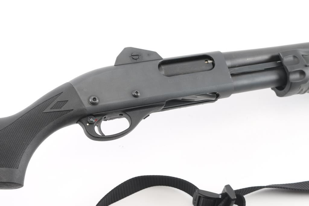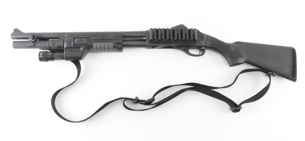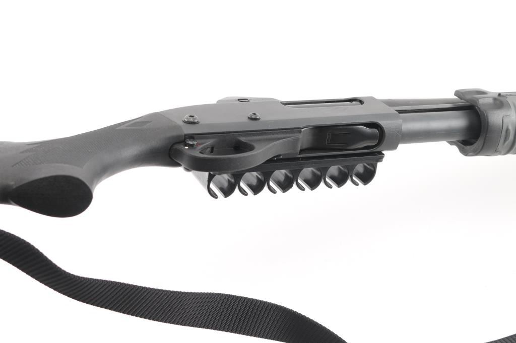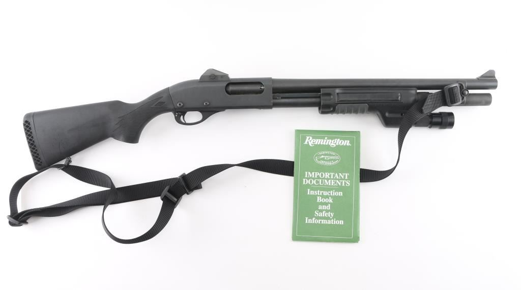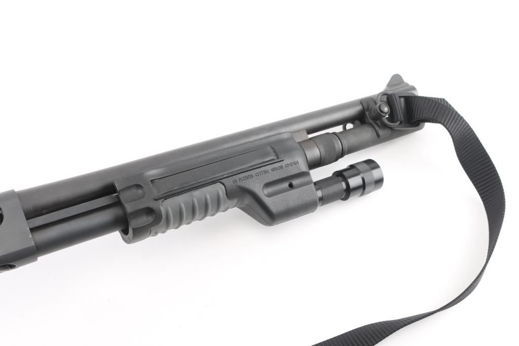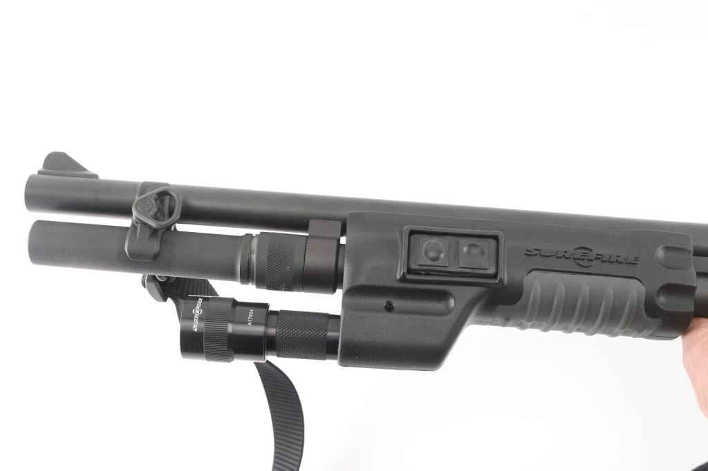 Customized by Gunsite Custom Shop. Pump action tactical shotgun chambered for 2 ¾” or 3” 12 gauge shells. Features matte black finish,18" plain barrel, CYL choked, magazine extension (to full length), ramped blade front sight with tritium insert, protected ghost ring rear sight by MMC, twin action bars, push button safety, sling swivels with nylon sling, black polymer SureFire pump handle with integrated switch for the included flashlight (lights up when turned on), factory checkered black polymer semi-pistol grip shoulder stock, ventilated rubber recoil pad, side saddle shell holder. Bore is very good bright condition. Overall excellent condition with handling marks. Night sights have lost their glow. Includes original factory paperwork, receipt for gunsmithing work (Gunsite Tactical Shotgun Conversion). Condition is NRA Excellent *** Modern Firearm ***
