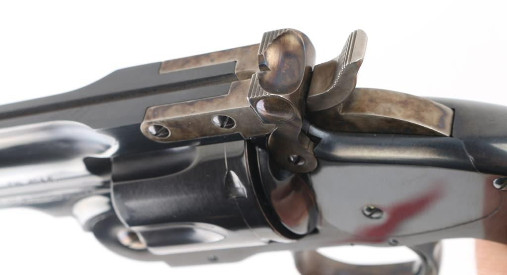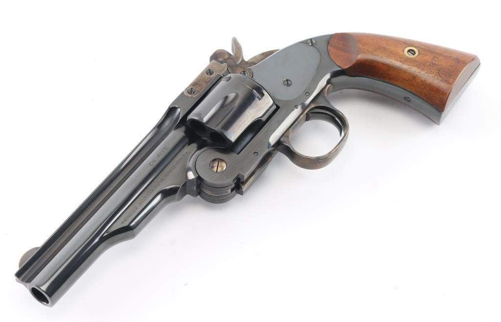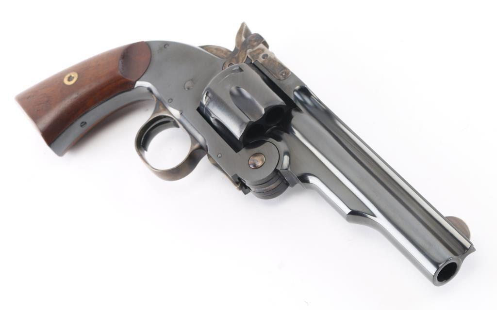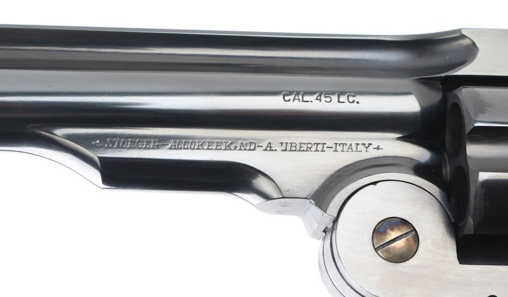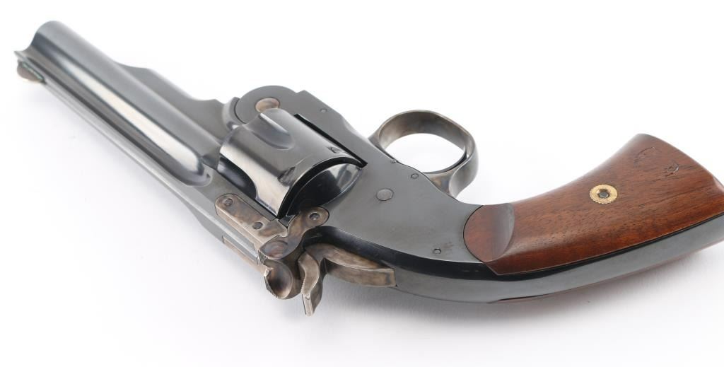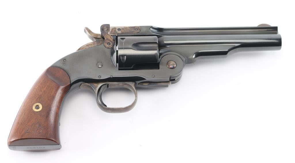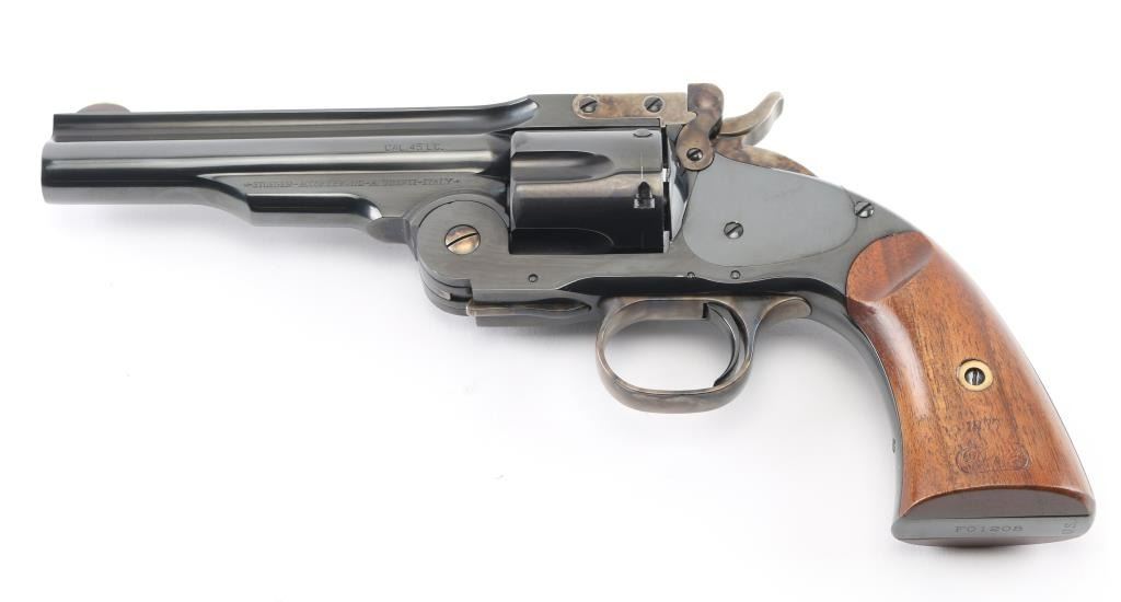 SN: F01208 High quality reproduction of the Smith & Wesson No. 3 Schofield 2nd Model top-break single action revolver, chambered in 45 Colt. Manufactured in Italy and imported by Stoeger of Accokeek, M.D. with import stamp on the left side of the barrel. Features a bright blue finish with case colored accents on trigger & guard, hammer, latch, solid ribbed 5" barrel, round blade front sight, ‘v’ notch rear sight cut in the barrel latch, smooth trigger, knurled hammer spur, fluted six-shot cylinder with automatic ejector, ejector override latch under hinge, frame with “U.S.” marked on the butt, and two-piece smooth walnut grips with 1877 dated replica US inspector markings. Bore and charge holes are pristine. Retains 95% finish with handling marks. Grips are very good. Action is smooth with tight lock-up. Cylinder spins freely with hammer at half-cock. Condition is NRA Excellent *** Modern Firearm ***