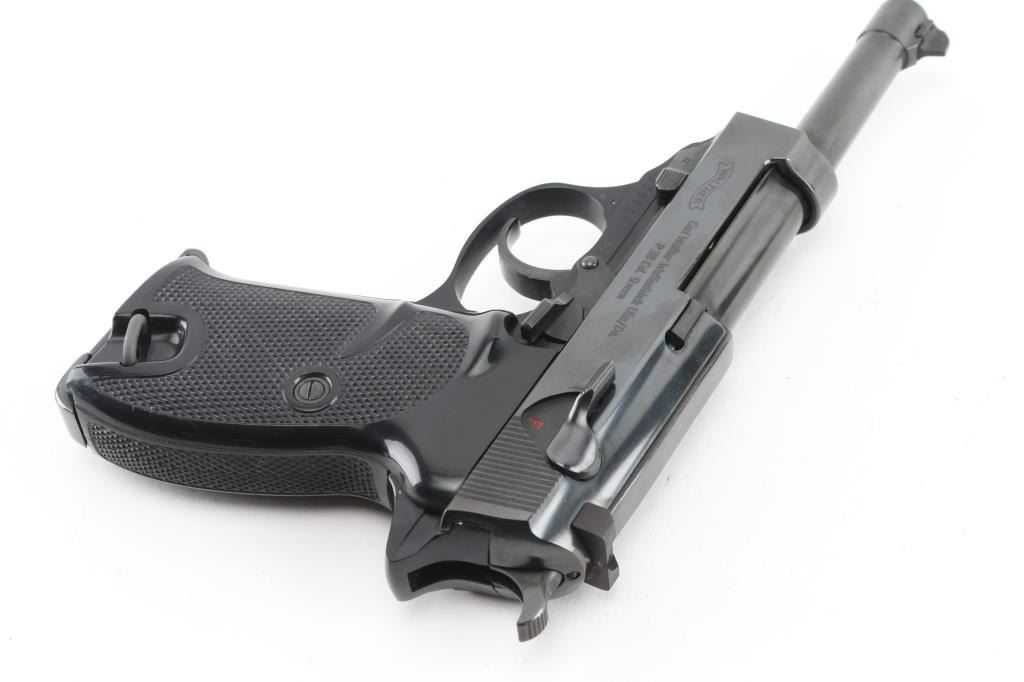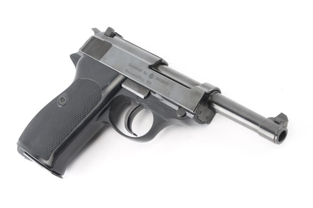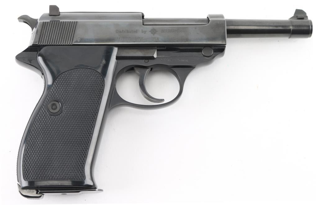 German semiautomatic pistol imported by Interarms, Alexandria, VA, manufactured circa 1967. Features approx 4.75" barrel, dovetailed blade front & notch rear sights, single/double action, decocker safety, heel magazine release, aluminum alloy frame. Bore is excellent/bright. Finish and grips are excellent, action is smooth/tight. Includes a factory presentation case & two magazines (one with Walther Banner). Condition is NRA Perfect. C&R Firearm.