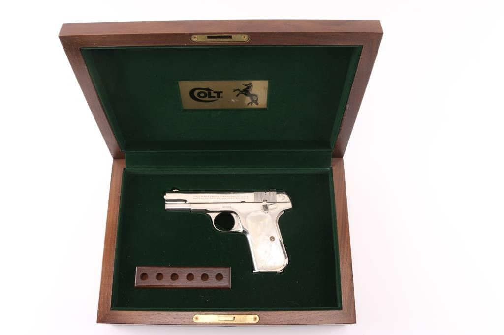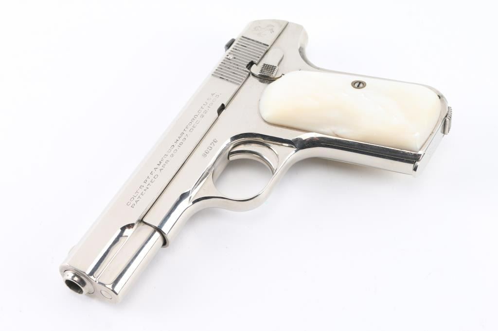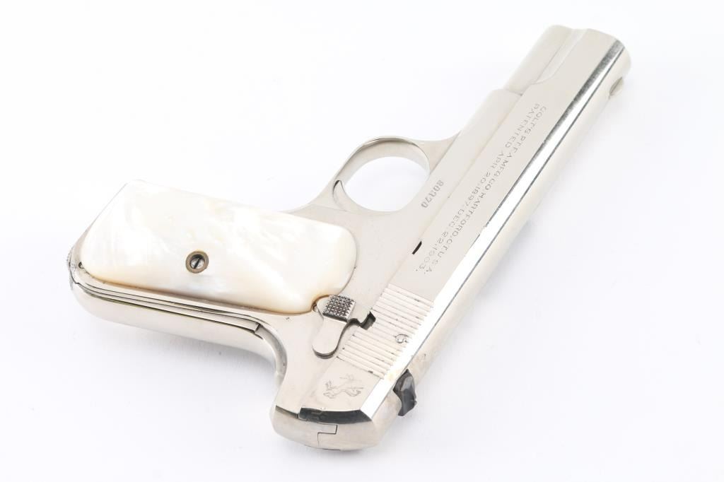 Vintage single action semi-automatic compact pistol chambered in .380 Auto, manufactured circa 1926. Features bright nickel finish, 3 3/4" barrel, low-profile round blade front sight, dovetailed blued rear sight with 'u' notch, two-line address/patent marking on the left side of the slide, smooth trigger, concealed hammer, thumb safety/slide catch on the left side of the frame, grip safety, heel magazine release, factory 8 round magazine, steel frame and two-piece smooth pearl grips. Bore is excellent condition. Pistol retains approximately 90% nickel with small areas of puckering, some scratches, a few dings to left side of slide. Grips are very good condition. Includes a Colt Customs made walnut case (with their medallion on lid), emerald green suede French fitted, with 6 round wood bullet block, Colt logo and Rampant Colt depicted on brass plaque inside lid, locking style hinge lid with key. Top of lid is engraved with a description of this specific pistol. Condition is near NRA Excellent *** C&R Firearm ***