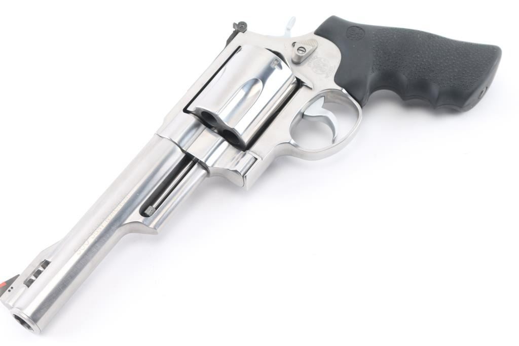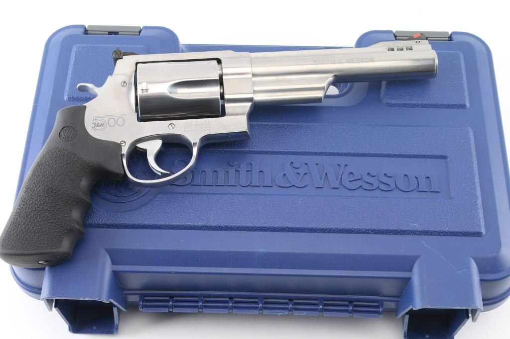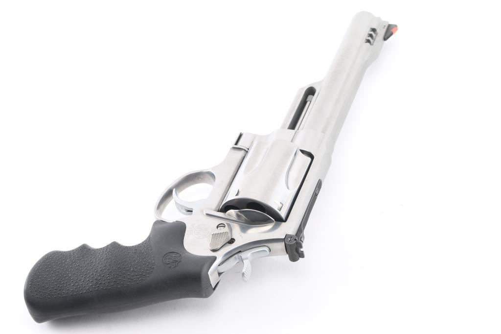 SN: CRT7543 Double or single action revolver in 500 S&W Magnum. Features stainless steel construction, pebble texture black rubber finger groove grips, adjustable sights, 6.5" barrel with integral muzzle brake, S&W lock system. Bore is excellent condition. Bright stainless finish is like new condition with minor handling marks. Includes blue plastic factory box, manual. Condition is NRA Excellent - like new *** Modern Firearm ***