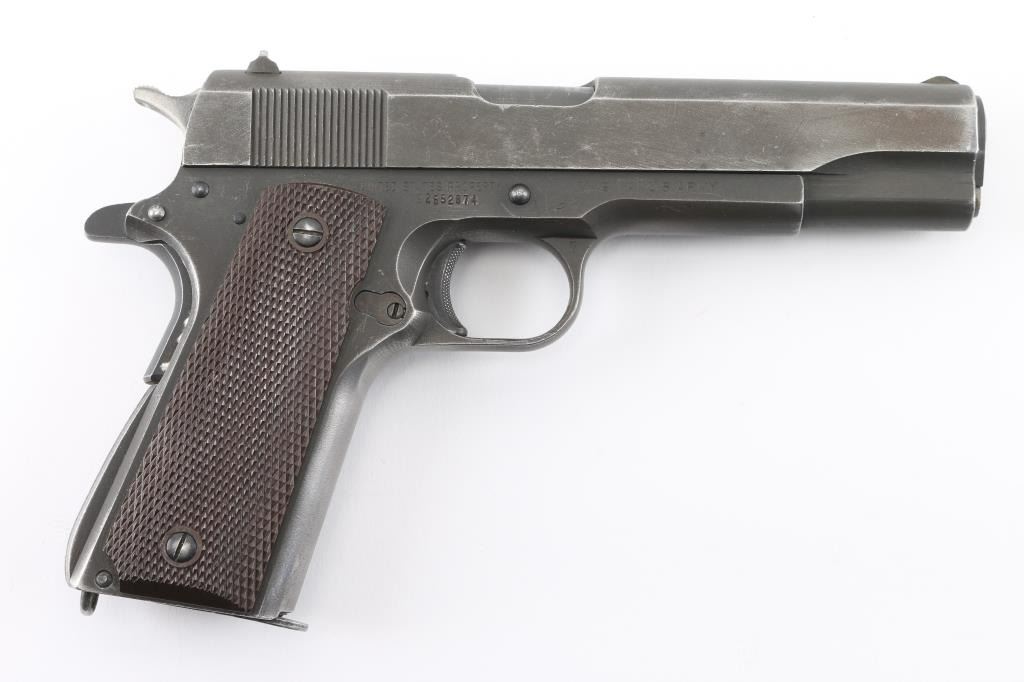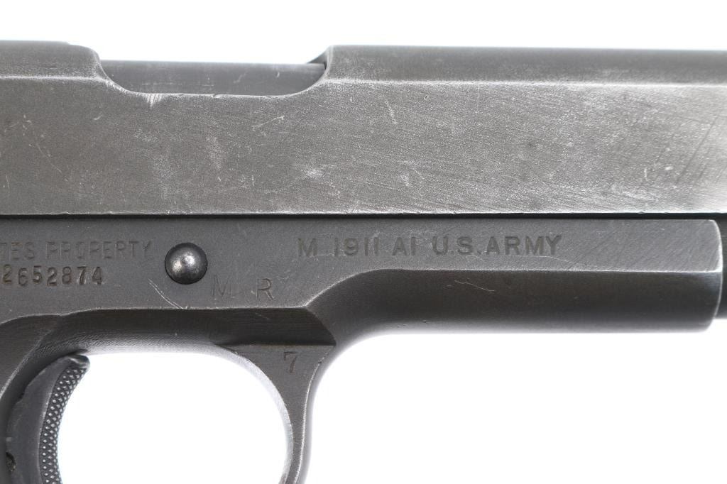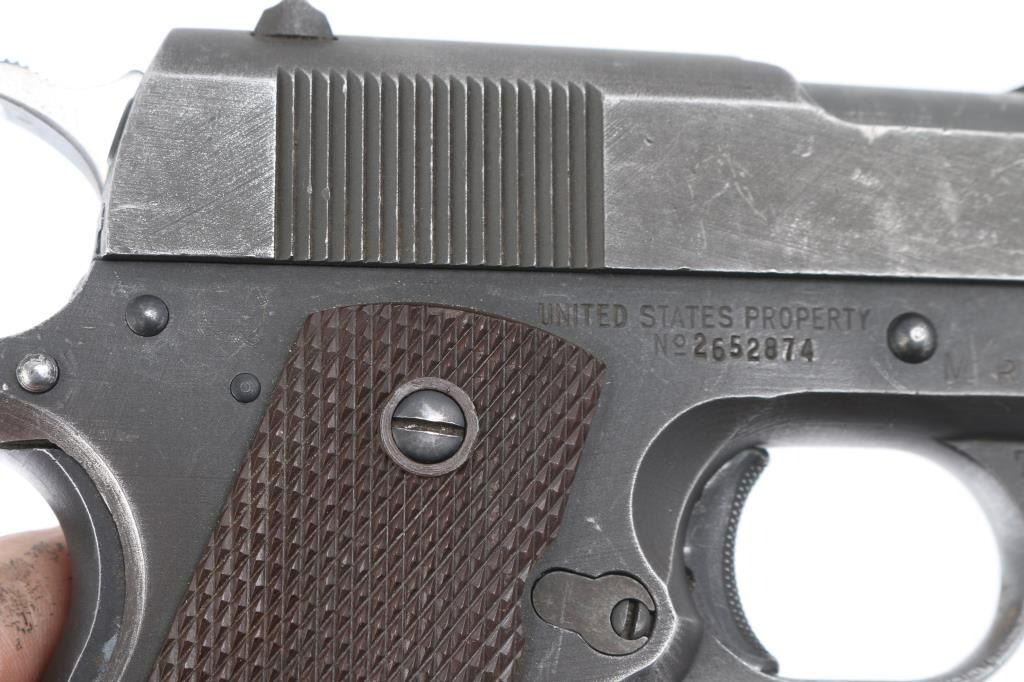 Sn: 2652874 U.S Military WWII era semiautomatic pistol manufactured circa 1945. One of the last M1911A1's produced. Features parkerized finish, checkered brown plastic grips, 5" barrel, fixed front & dovetailed rear sights, single action trigger, grip safety, manual safety, serrated arched mainspring housing with lanyard loop, serrated hammer with polished sides. Bore is very good condition. Appears refinished, with 85% coverage of medium gray parkerizing, with edge losses, scratches, especially around slide stop. Grips are very good. Grip screws show damaged slots. Markings include: "ITHACA GUN CO, INC" with address on slide, "UNITED STATES PROPERTY", "M1911A1 US ARMY", "P" behind mag button and top of slide, "FJA" below slide stop, "7" and (horseshoe shape stamp) on trigger guard (other marks hard to read), "MR" and faint crossed cannons on right frame. Includes (1) good condition blued steel magazine. Condition is NRA Very Good++ (as arsenal refinished) *** C&R Firearm ***