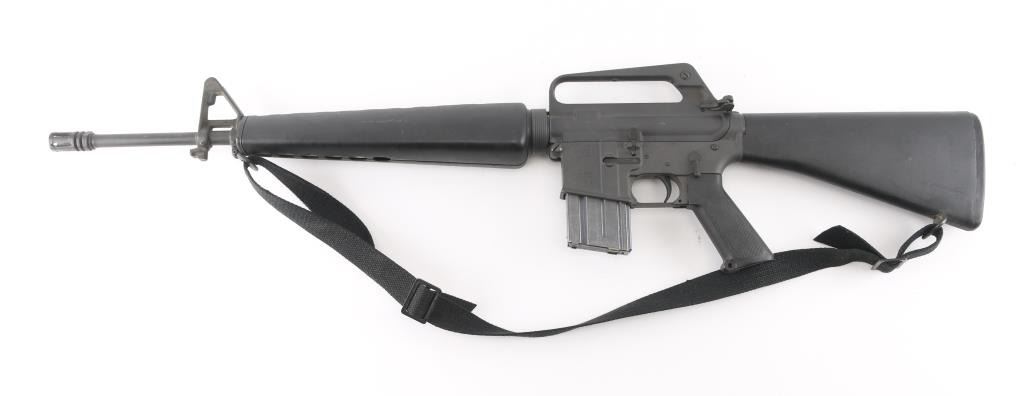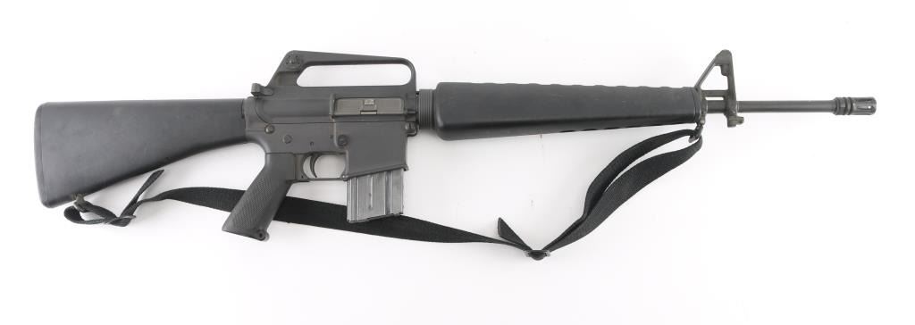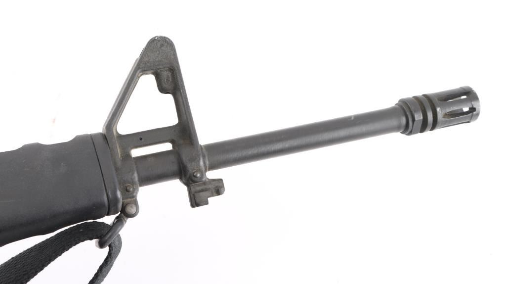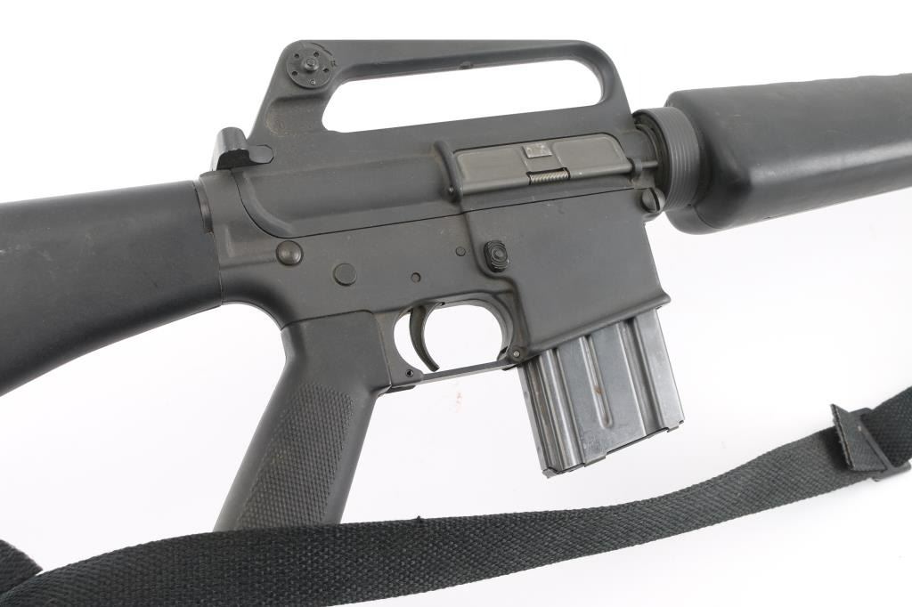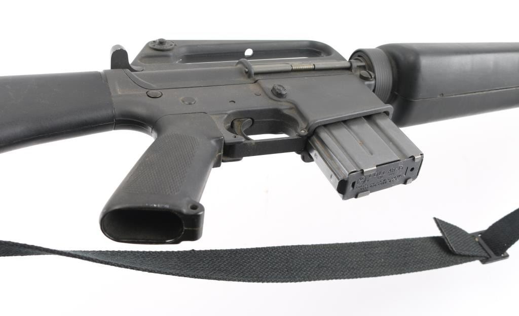 Semiautomatic rifle manufactured circa 1982, chambered for the 223 Remington cartridge. Features parkerized finish, black plastic furniture, A1 length fixed stock with butt storage compartment, triangular cross section hand guards, 20" lightweight barrel, 6 flute flash suppressor, bayonet lug, adjustable sights (front post sight with protector ears, rear L-flip peep), early "slick side" A1 type upper receiver without forward assist, spring loaded ejection port cover, early style lower receiver without fence around magazine release, dual screw style front take down pin, manual safety, sling swivels. Barrel appears earlier 1-12 twist, hard chrome lined, marked "C MP CHROME BORE". Bore is very good condition. Overall external appearance is very good or better, retains 90% finish, with scratches & rub marks, bare metal showing on edges. Plastic furniture is very good condition with scuffs and other minor blemishes. Includes (1) 20 rd Colt marked magazine, good condition black nylon sling. Condition is NRA Very Good+ *** Modern Firearm ***