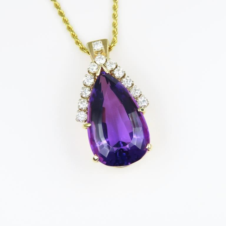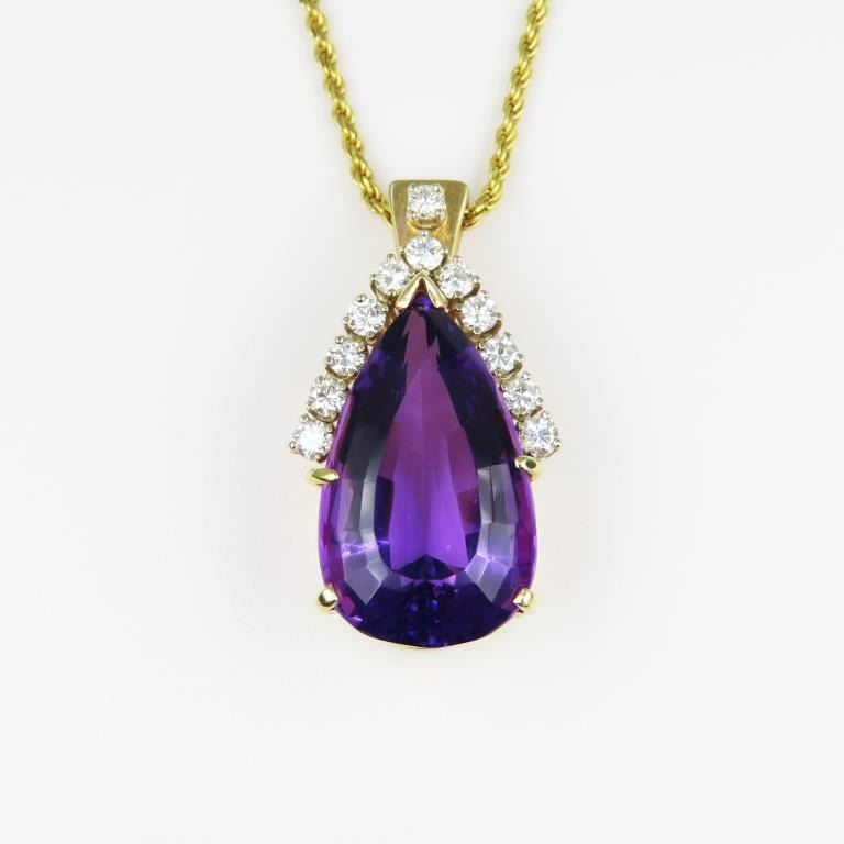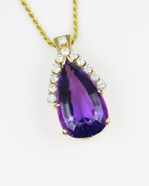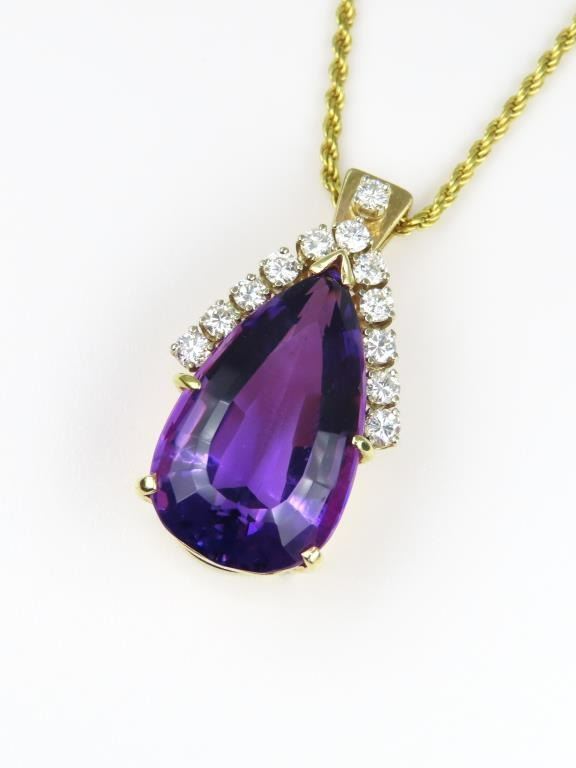 Magnificent Extra Fine Amethyst and Diamond Pendant featuring a pear shaped vivid Purple Amethyst weighing approx. 20.00-25.00 carats accented with 12 ‘IDEAL’ cut Diamonds weighing approx. 0.60 carats with G-H colors and VS clarity set in an impressive custom crafted 14 karat yellow gold setting. Retail $5,000- $6,000 Estimates $3,000-$4,000 Reserve $1,500.00