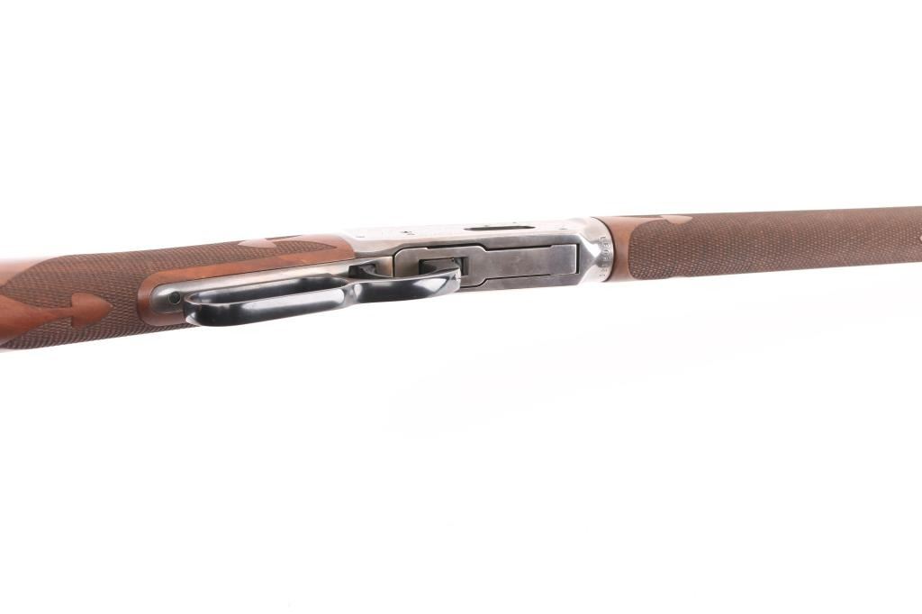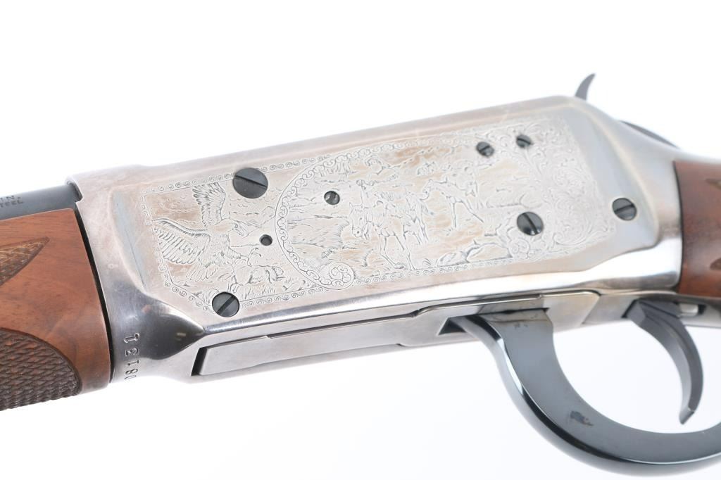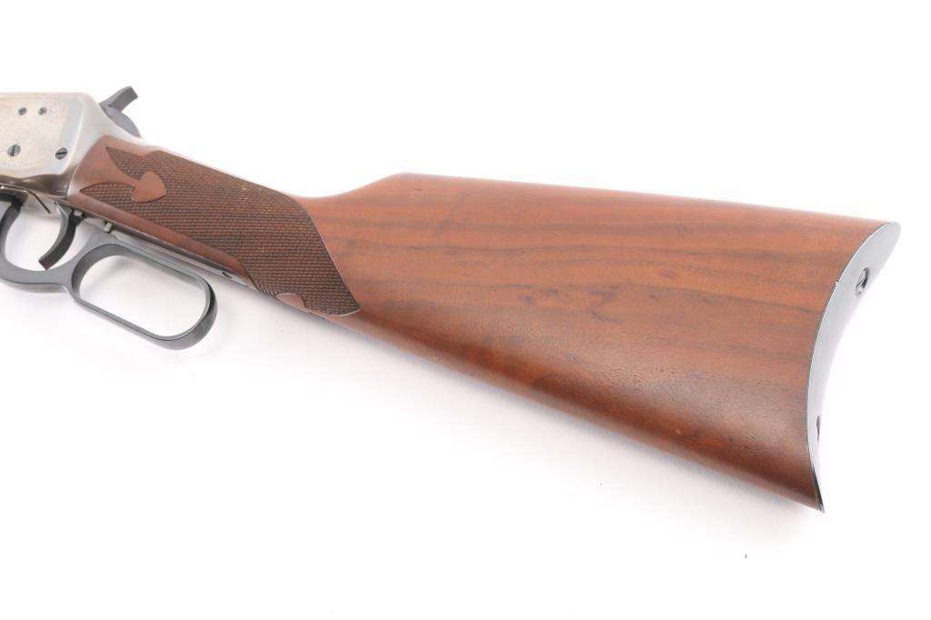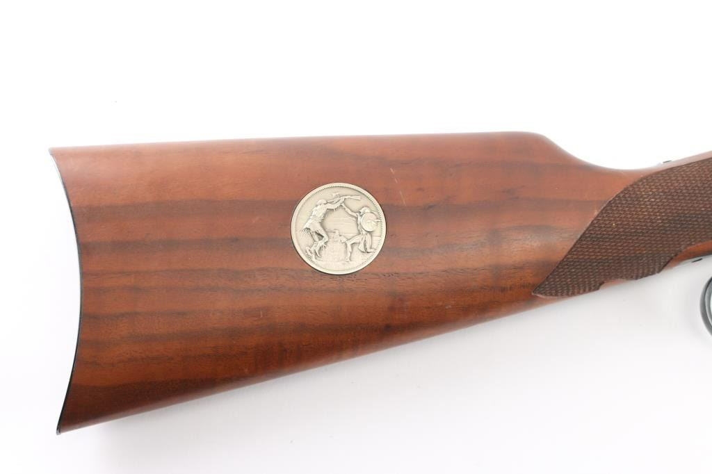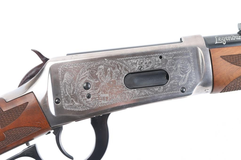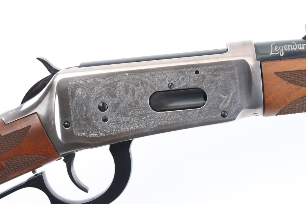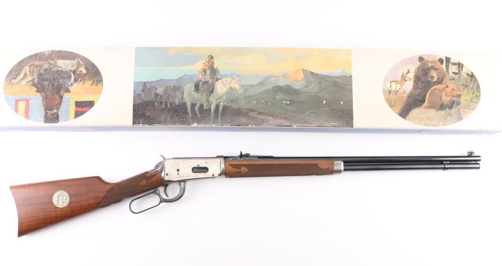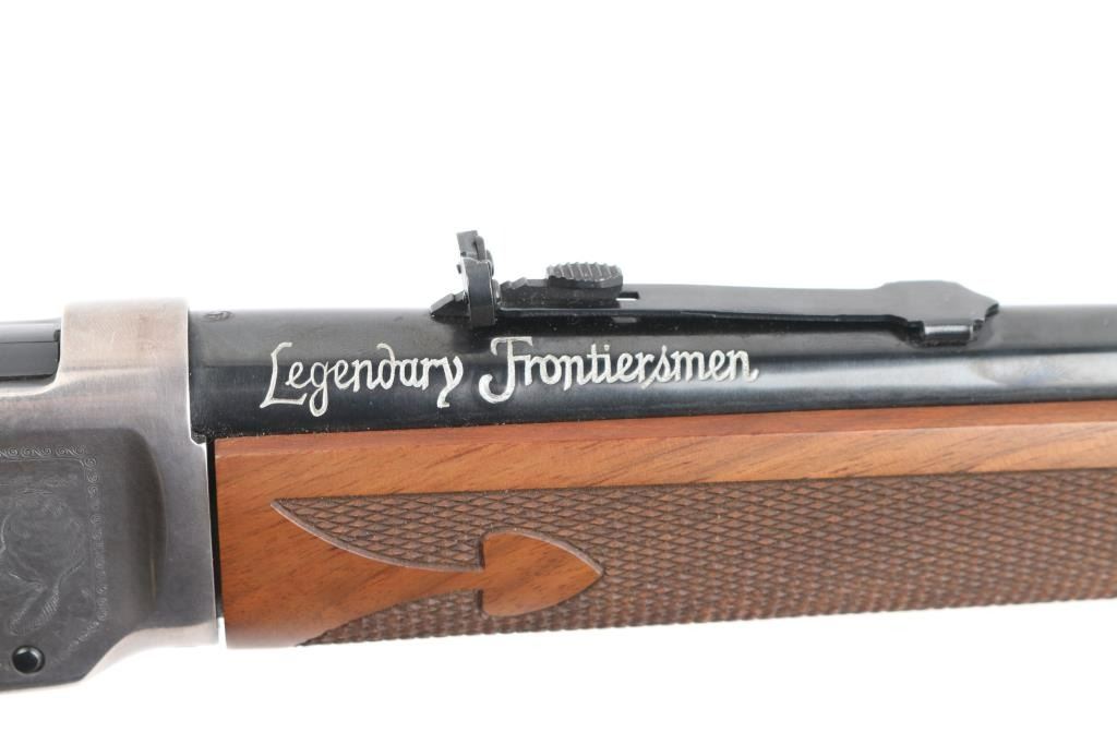 SN: SF08131 Commemorative lever action repeating rifle celebrating the Legendary Frontiersmen of the American West. This rifle is number one of only 19,999 produced, manufactured circa 1979. Features a blued 24" round barrel, full-length 7 round magazine tube, dovetailed blade front sight with bead top, adjustable rear sporting sight, smooth trigger with beveled edges, serrated hammer spur, antique silver finished receiver with engraved frontier scenes & scroll border, fancy checkered deluxe walnut forend with satin finish & metal forend cap and straight grip shoulder stock with curved metal buttplate & inlayed frontiersmen medallion on the right side. The receiver has provisions for a side mounted receiver sight. Includes the original factory two-piece styrofoam box with correct label, document, hang tag and cardboard graphic sleeve. Rifle exhibits nearly all of it's original finish with little to no visible wear. Action is crisp, the bore is pristine and the wood stocks are extra fine. Condition is like NRA Perfect in box. Modern Firearm,
