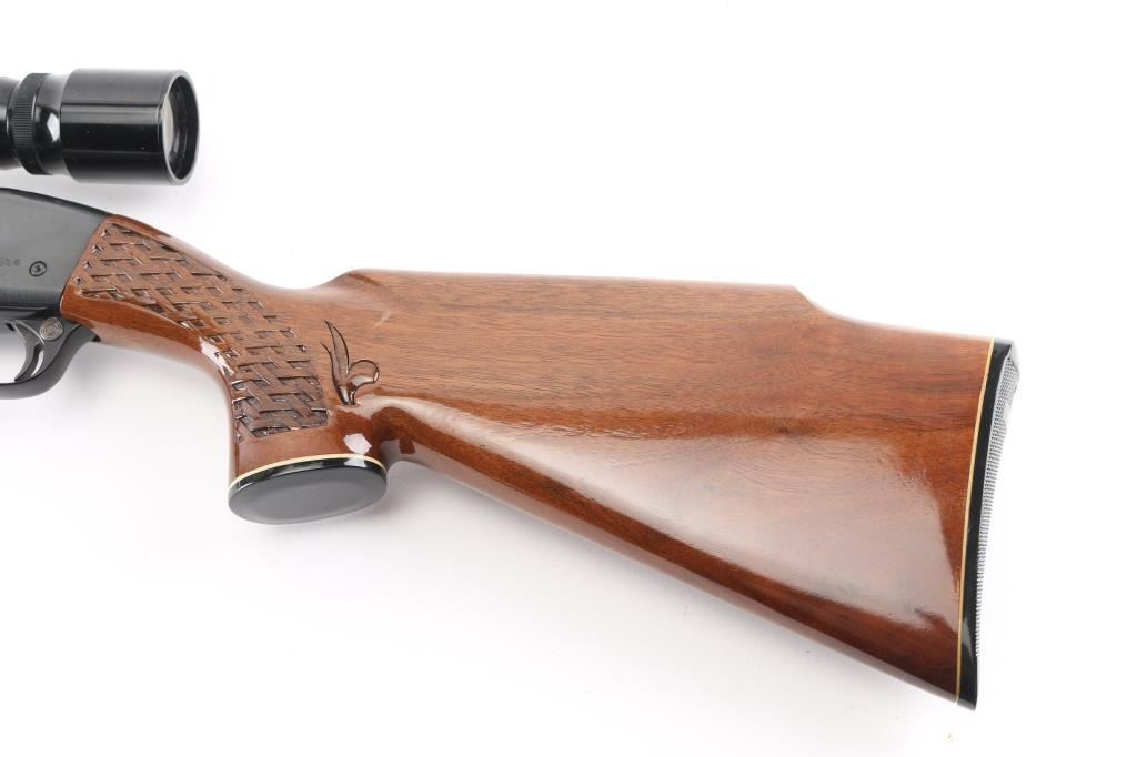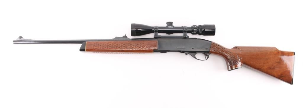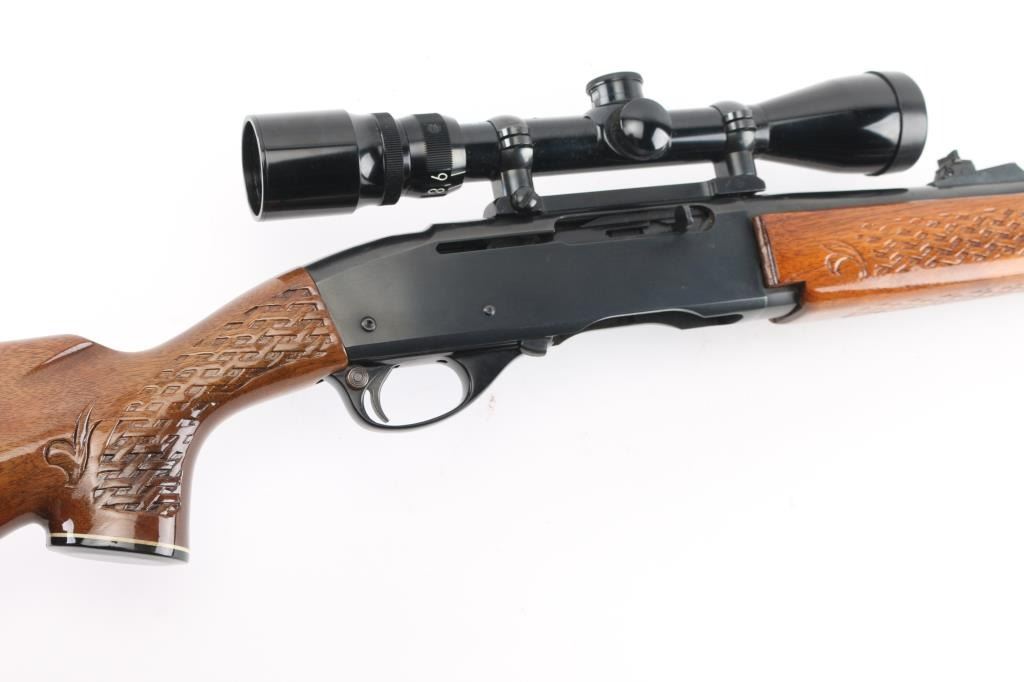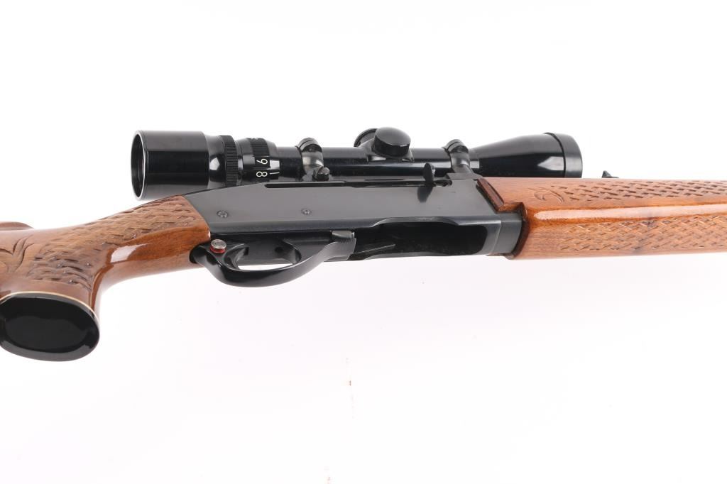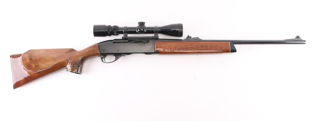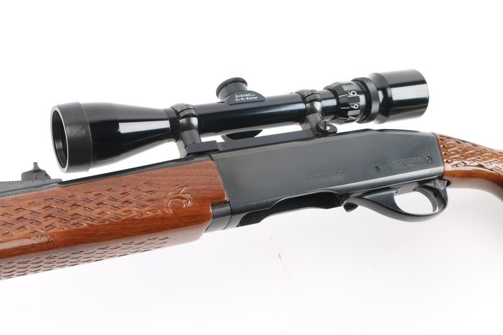 'Humpback' Semiautomatic rifle manufactured circa 1975. Features 22" barrel, ramp front sight with beaded blade, adjustable rear sight, Redfield scope mount with rings, manual safety, blued finish, wood stock with impressed checkering at wrist & forend. Early humpback shaped receiver. Mounts a good condition Bushnell Banner 3-9x scope, clear view, mounted slightly canted. Bore is very good condition. Retains 90% blued finish with edge losses & handling marks, thinning on barrel over chamber. Wood is nearly perfect with few small dents. No magazine. Condition is near NRA Excellent *** Modern Firearm ***