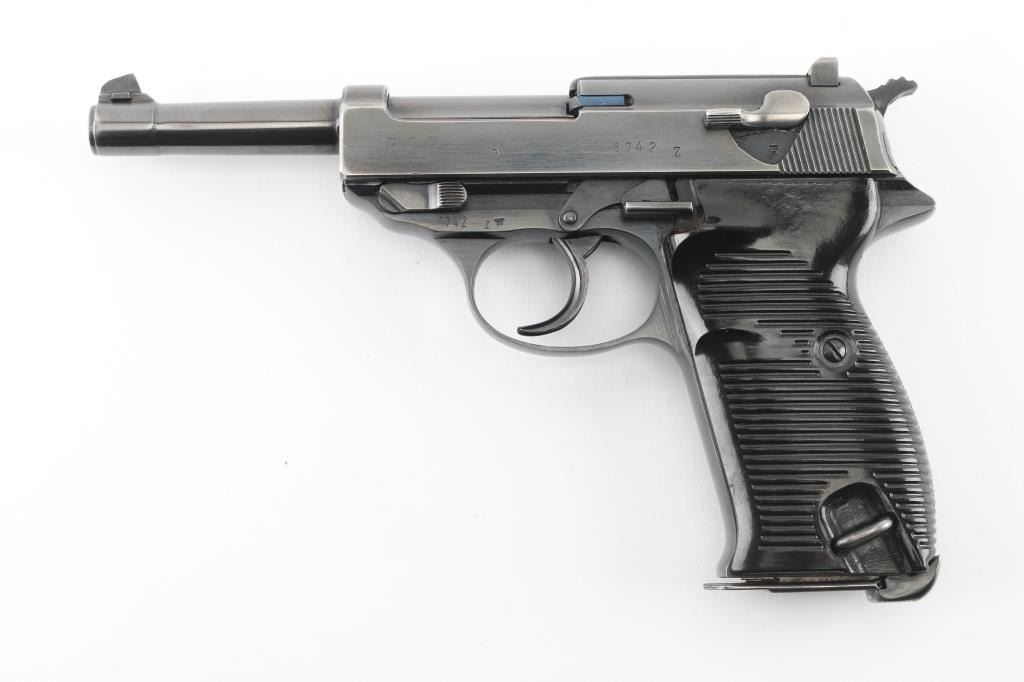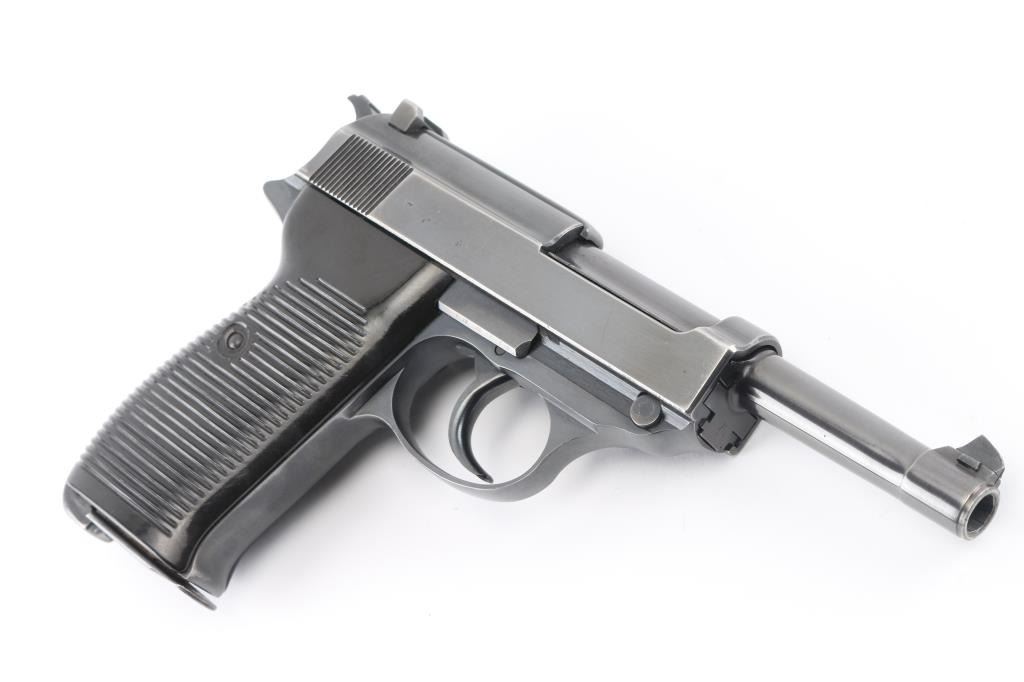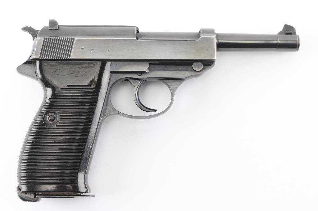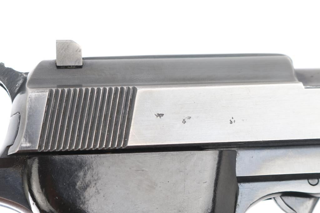 German WWII issue military semiautomatic pistol, circa Feb 1945. Features re-blued finish, 4.9" barrel, dovetailed blade front sight, notch rear sight, slide mounted decocking safety, heel magazine release, grooved black plastic grips. Bore is very good. Retains 85% re-finish with edge losses. Thinning and losses to some markings. Grips are very good, show small scratches and signs of handling. Numbers match on frame, slide, barrel. Waffenamt, 'eagle over 88'. Magazine is fair condition, 'eagle over 88' marked. Condition is NRA Very Good (refinished) *** C&R Firearm ***