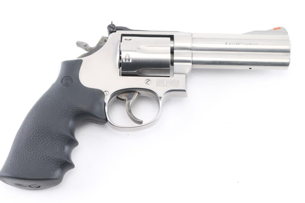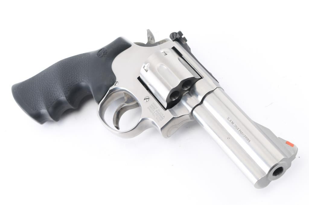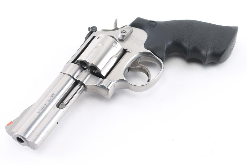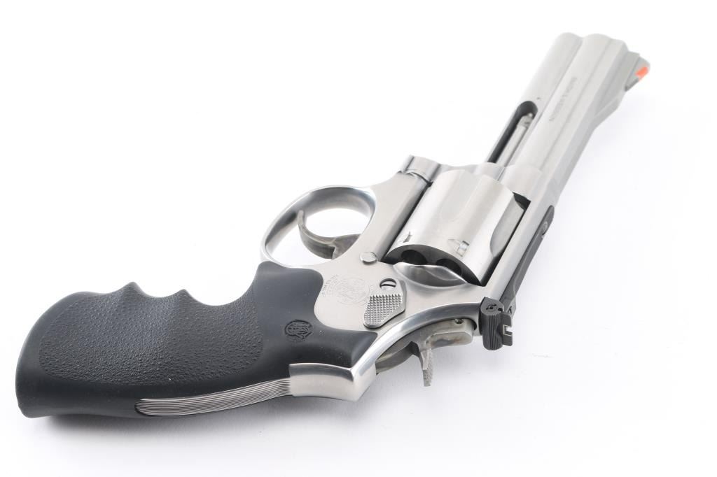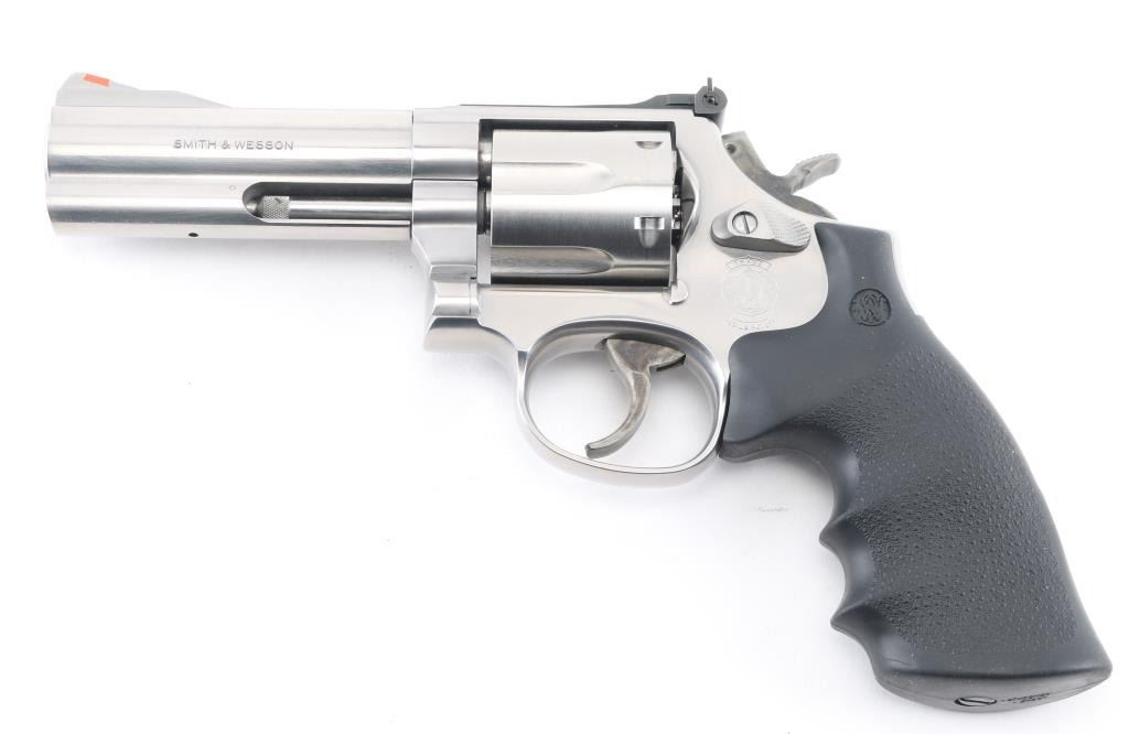 American made 6 shot DA/SA revolver built on the "L" frame, features stainless steel construction, black contoured rubber Hogue grips with molded-in S&W logo, 4" barrel with full length underlug, fluted cylinder, smooth trigger, knurled hammer spur, orange insert ramp front sight and white outline adjustable rear. Bore and cylinders look good. Metal finish looks very good. Grips are fine. Condition is NRA Excellent. *Modern Firearm*.