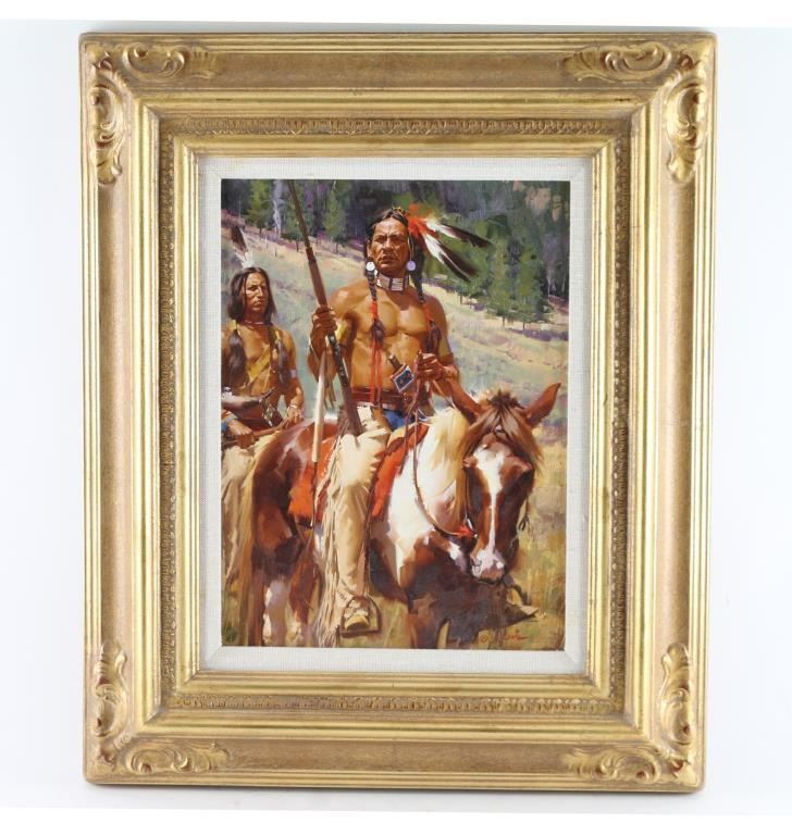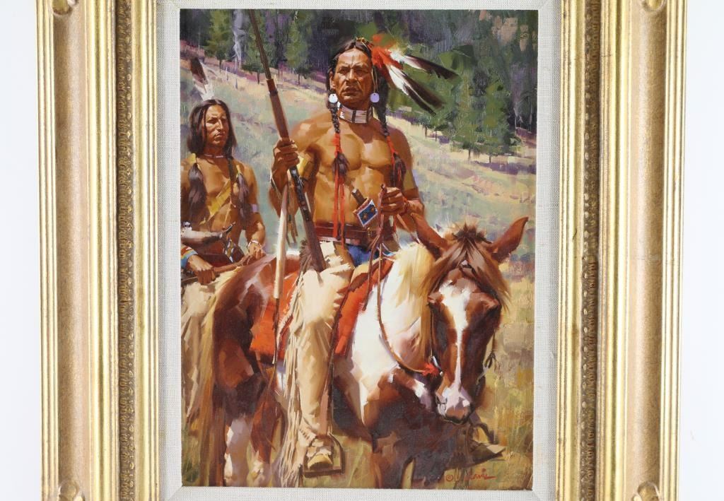 By "Stan Davis" entitled "Indian Brave" matted and in gold Montgomery wood frame. 15.5"x11" Signed lower right. Bio- Born in 1942, Stan Davis grew up near Tallahassee, Florida. Throughout his childhood, he nurtured an interest in Native American culture. He and his friends would play cowboys and Indians, and comb the local beaches for pottery shards, arrowheads, and other artifacts surviving from pre-Colombian indigenous settlements.