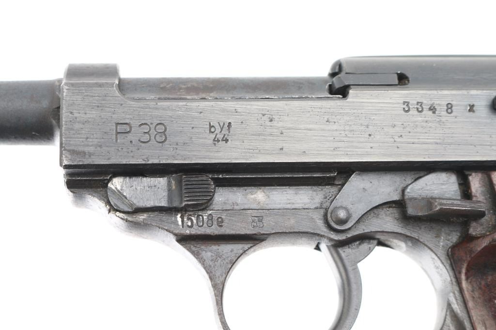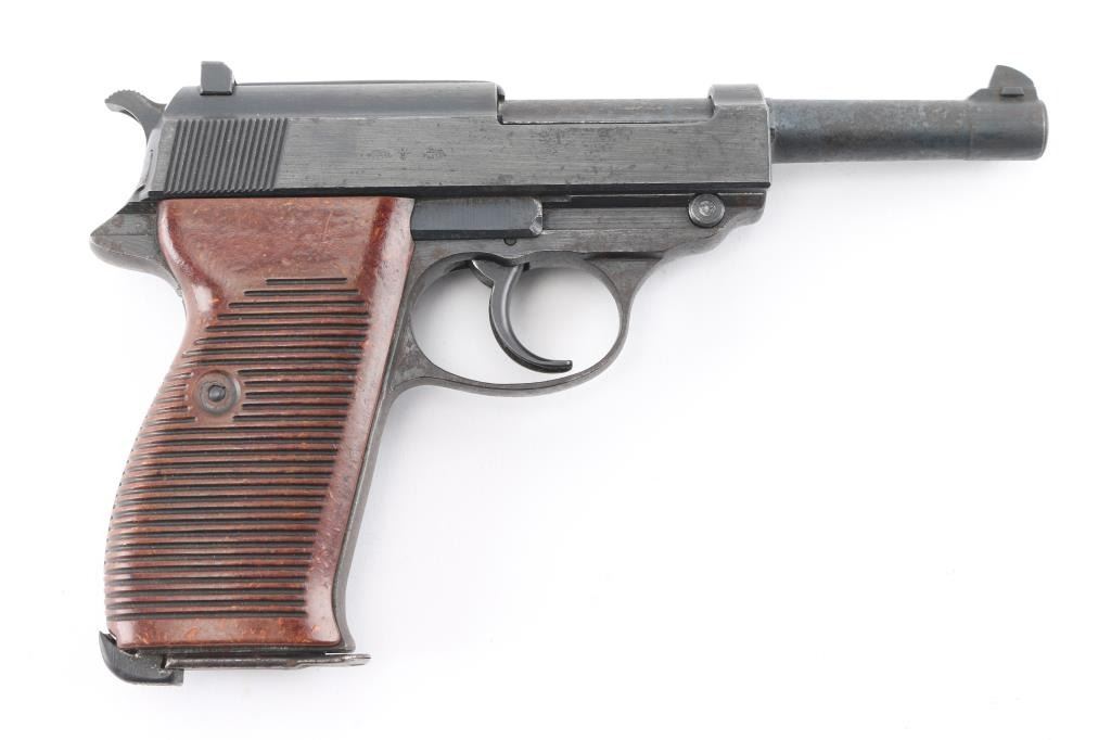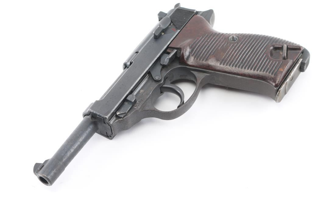 Pistol. Semi-Automatic. 8 rd Magazine. Third Reich era military issued sidearm. 4.9" barrel. Short recoil, hinged locking piece assisted breechblock. Later war mismatch. Matching serial numbers on the Spreewerk frame, and barrel, including the locking block. (Waffenamt Eagle/88) byf 44 slide, eagle/135 waffenamts. (Serial number 3348). 44 dated Spreewerk barrel. Bore is very good with strong rifling. Bakelite grips very good. Blued finish is about 80% with handling loss on the fore strap, edges. Some minor scratches, and some scattered pin-prick pitting. Original magazine stamped P.38. Consignor states this pistol was purchased from the the family of a WW2 Army vet. No import marks. NRA Condition- Good. C&R Firearm.